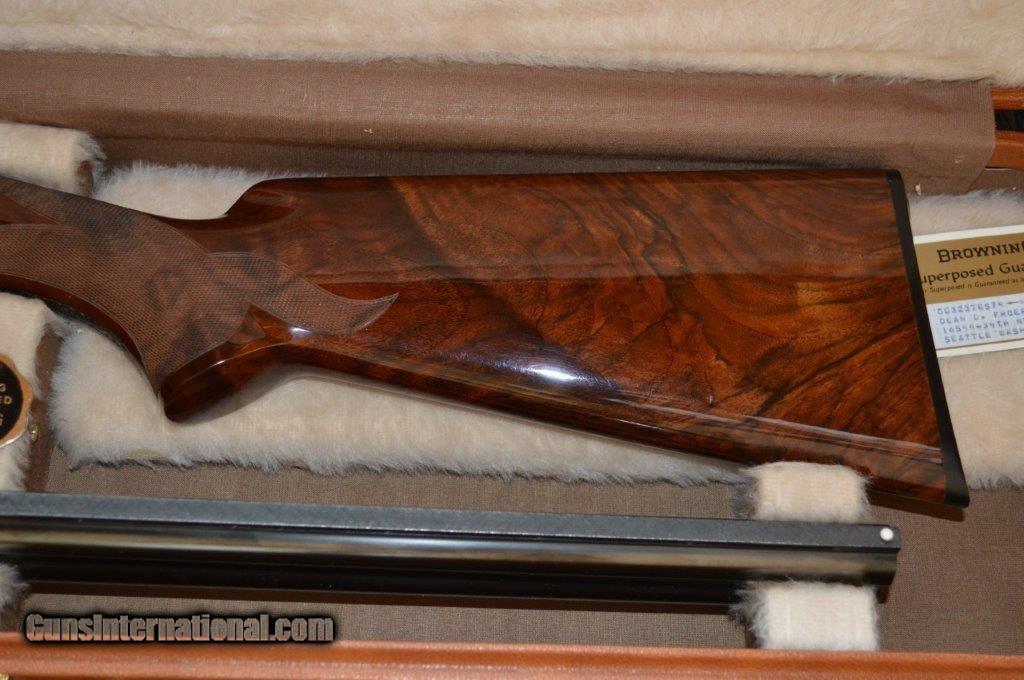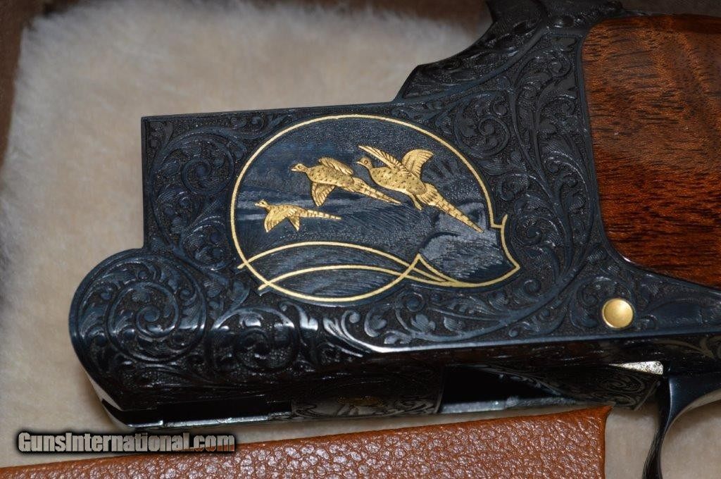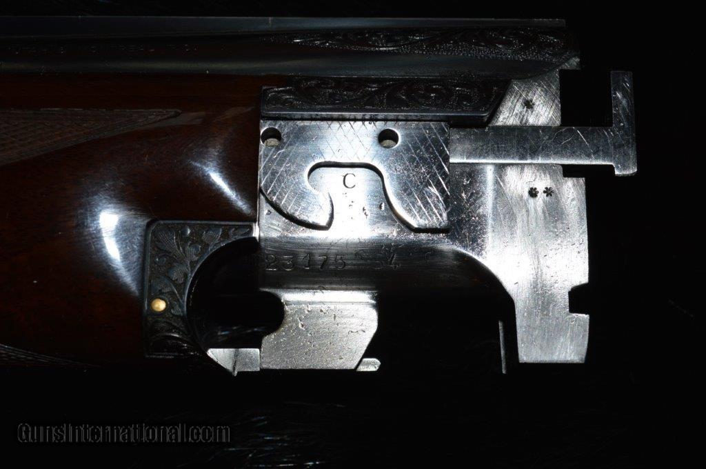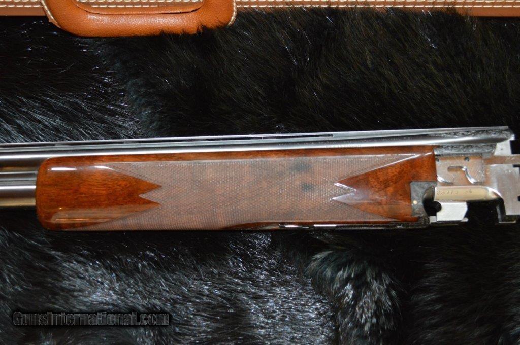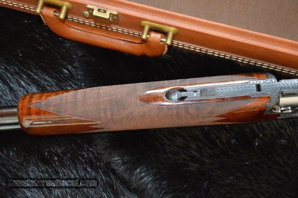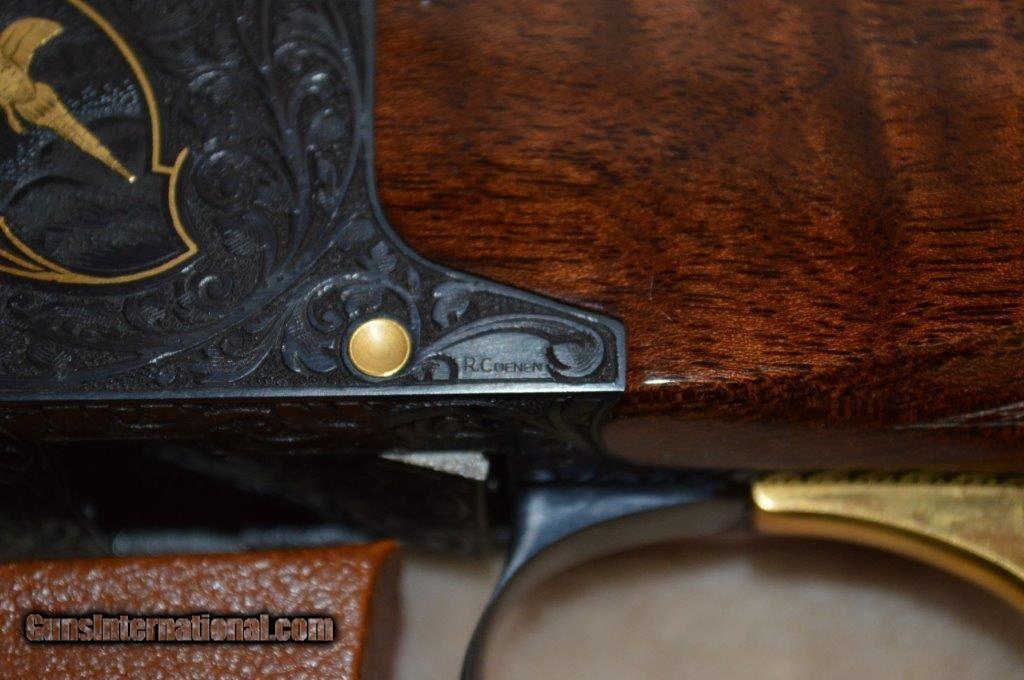 Description: Sold pending funds***The Browning Superposed are hand-fitted shotguns that were made by some of the best craftsman in Europe to Browning's high standard of excellence. And only master craftsmen and women were allowed to work on these wonderful examples of Browning’s finest offering. This Midas grade Superposed, in 12 ga, is a wonderful example of the best of the best. Made in 1974, after the salt problems had passed, this beautiful field gun is truly a great product of the Belgian craftsmen at their peak of artistic production, being only one of three 26-1/2" Midas grades made that year. This gun was engraved by lead engraver Rene Coenen, engraving the three 18 carat gold pheasants on the left side, and R Lemarchand did the three gold ducks on the right side. This is a long tang gun with one of the best figured stocks to be put on any Browning that displays checkering of 28 lines per inch terminating in a wing shape of flawless checkering at the back of the stock's grip. It has tasteful engraving on the top of the barrels with Full/Mod chokes and 2-3/4" chambers and hand filed top rib. It weighs 7lbs. and is all factory original and still 100% of its overall condition, showing no evidence of ever being shot. There is one minor handling mark from 45 years of admiring this gorgeous piece in the left center of the stock. It comes in a period Airways case that was purchased new with the gun. Highly desirable and wonderfully built to last, the value of these high grade Superposed guns continues to rapidly climb so there's no better time than the present to buy one. SOLD |