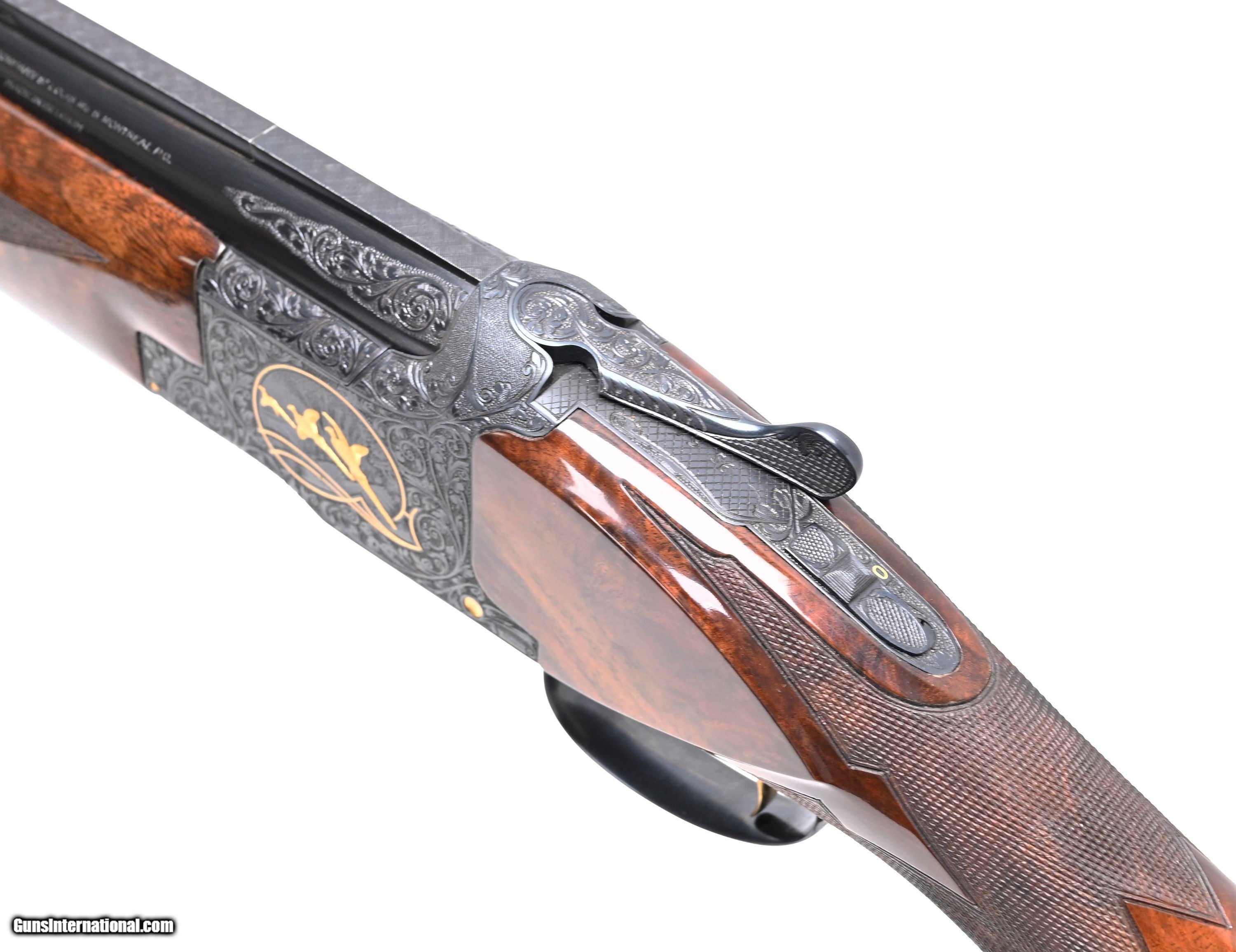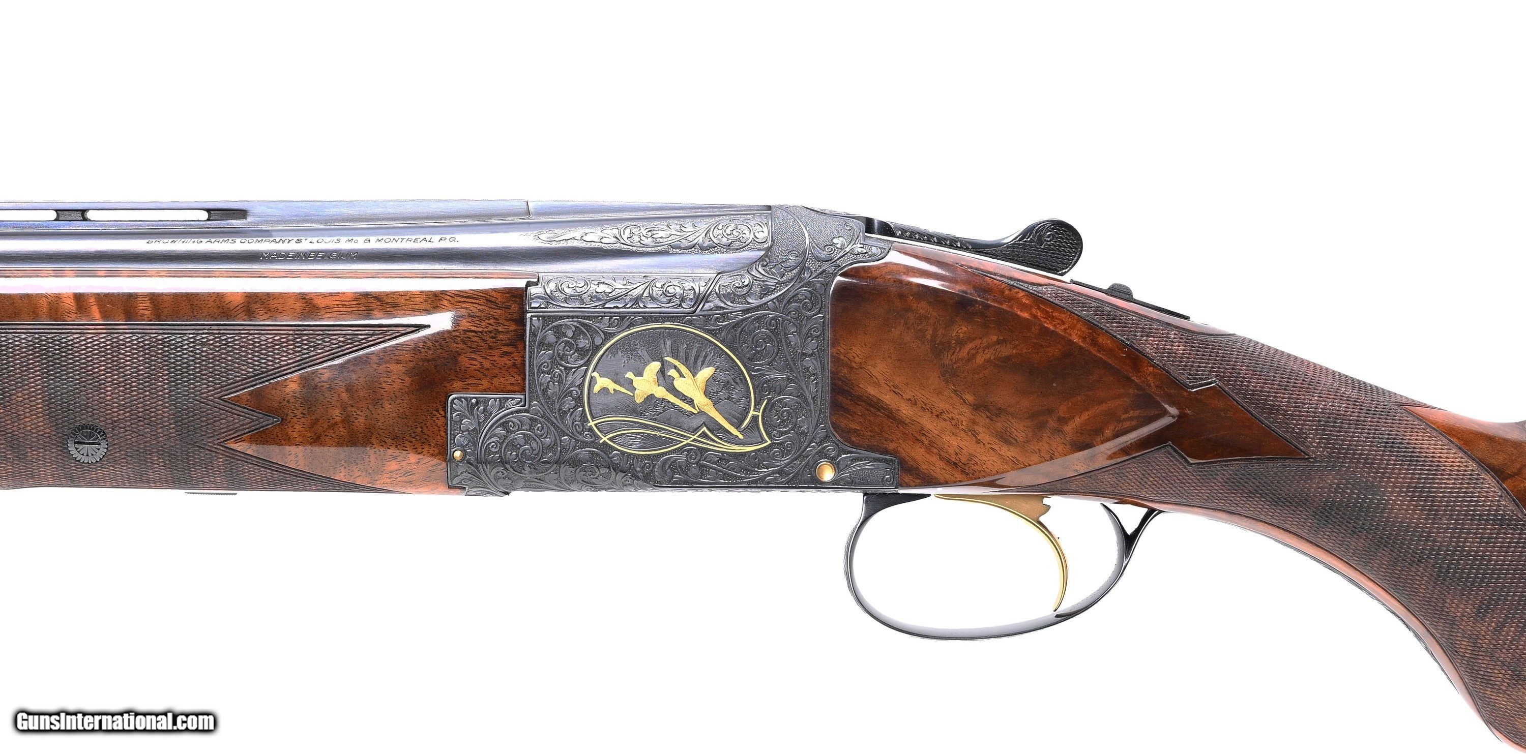 Description: Browning Belgium made Midas grade 12 gauge Superposed shotgun. Made in 1966 this field configured Superposed has desireable long tang trigger guard and round knob pistol grip. It is fitted with preferred 28" vent rib barrels factory choked IC/IM. The Midas engraving was done at the Belgian factory by Browning Master Engraver, Andre Dierckx and signed on both sides of the receiver. The wood is nothing short of spectacular. The stock has a 14 1/4" LOP over the factory recoil pad, with 1 1/2" DAC and 2 3/8" DAH with neutral cast. Condition wise this gun is almost NEW! There is hardly any marks on the bottom of the barrels from having the forearm moved for assembly and disassembly! And the top lever is far right of center. Weighs 7 lbs. 10 oz. SOLD |