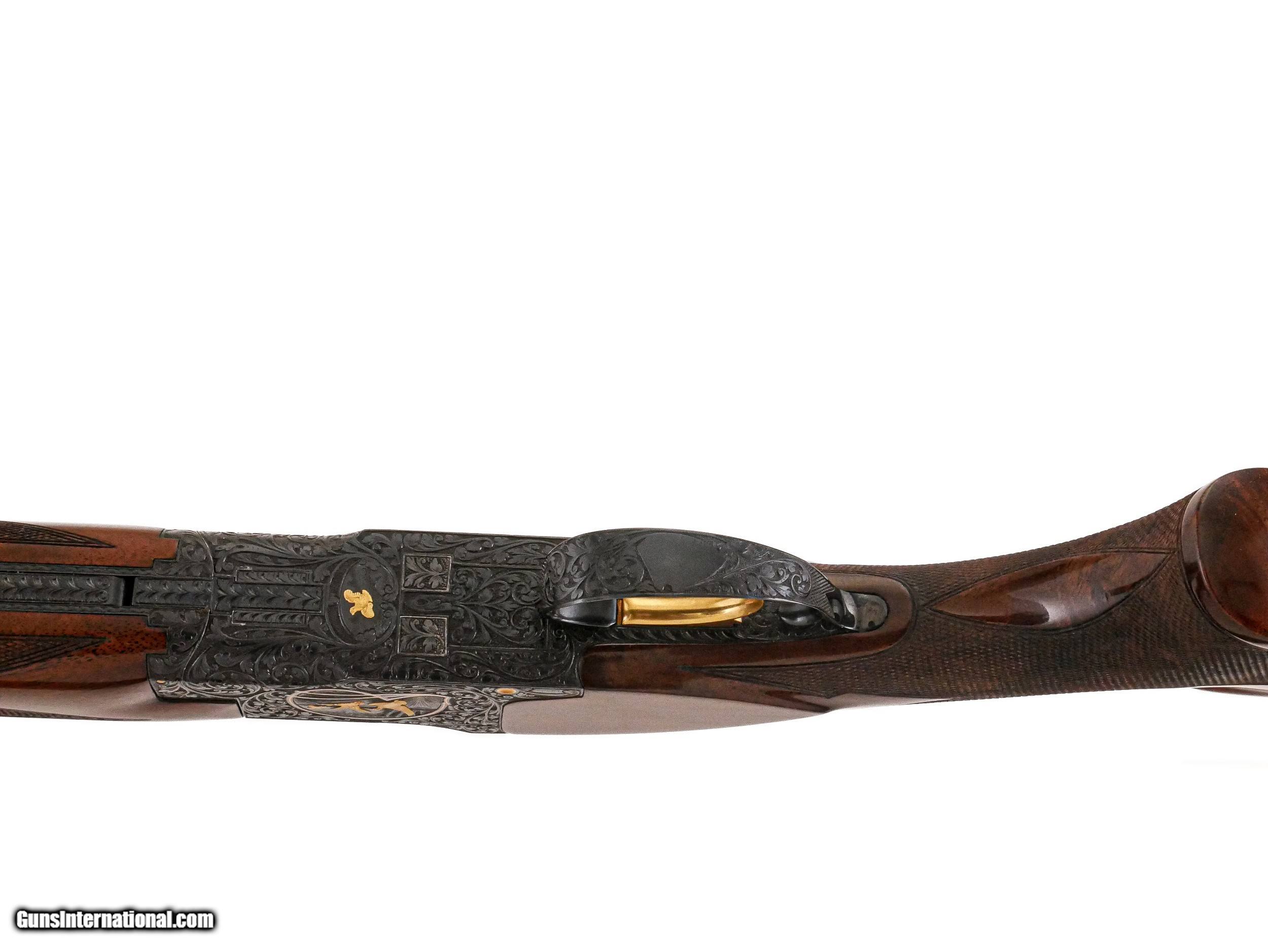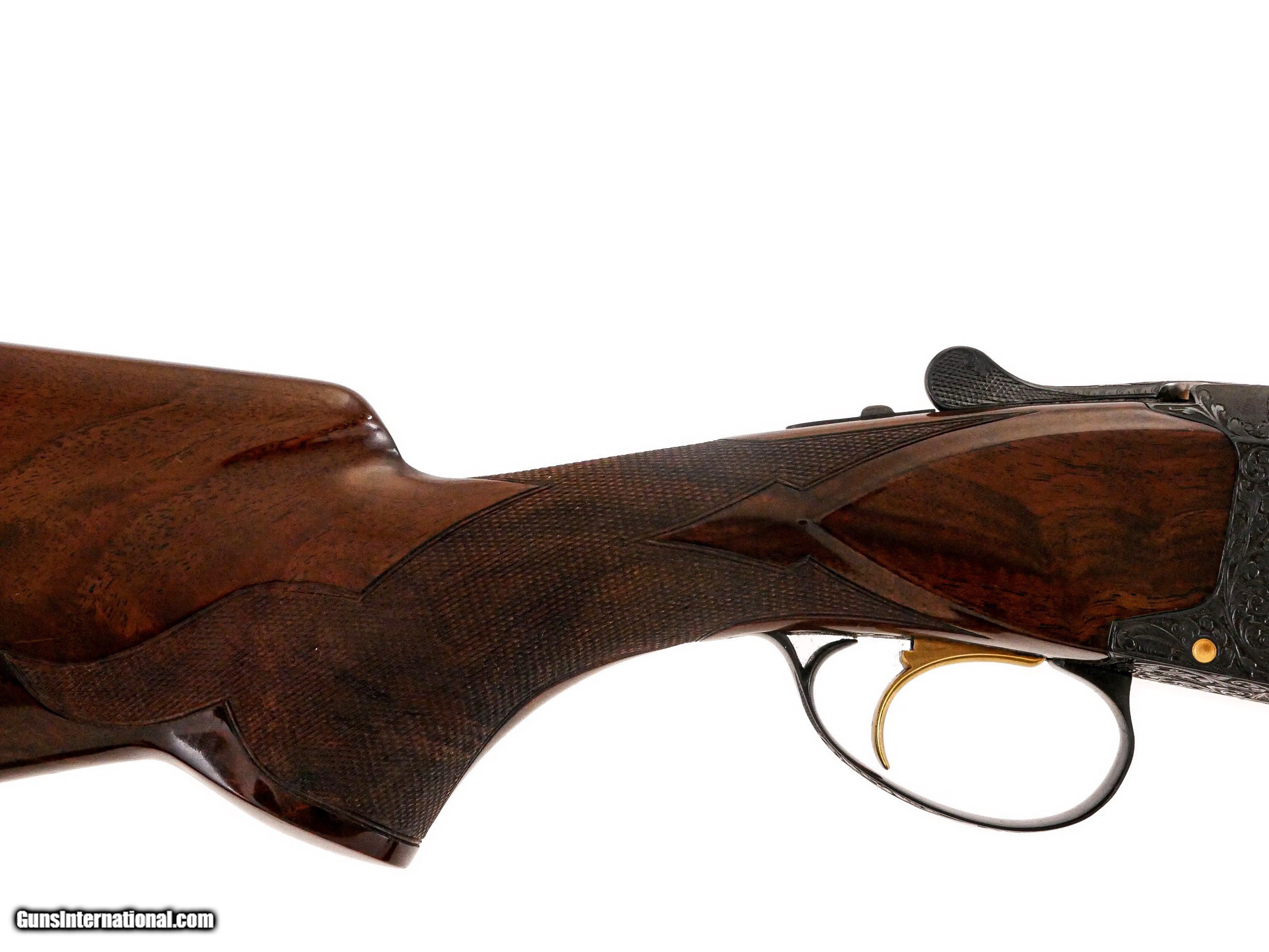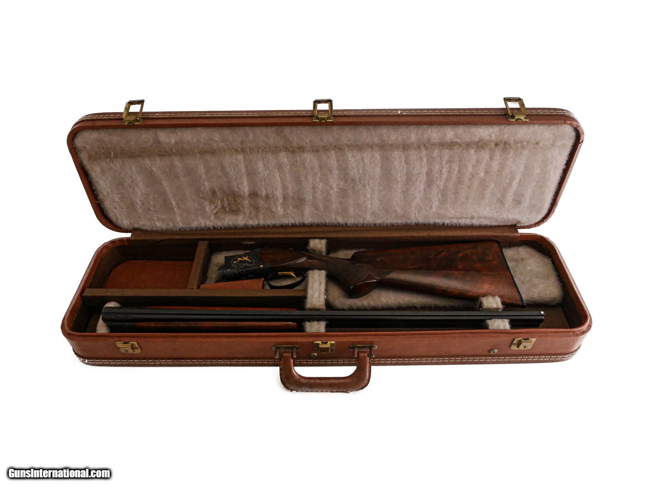 Description: Browning - Midas, 20ga. 26 ½” Barrels Choked IC/M. Figured Turkish walnut, special order 1971 Belgian gun, round knob long tang, butt plate. Extremely rare! Field style foreend, Midas engraving pattern by Jean Marie Debrus and Henri Deprez. This is brand new, highest quality, collector gun in its original browning case. We don’t believe this gun has ever been shot, it is collector quality, and very rare in its condition. The checkering is clean, it doesn’t look like anyone has touched the gun. Inv: 21819 6 lbs. 6 oz. 14 3/4" x 1 3/8" x 2 1/4" $26,995.00 SOLD |