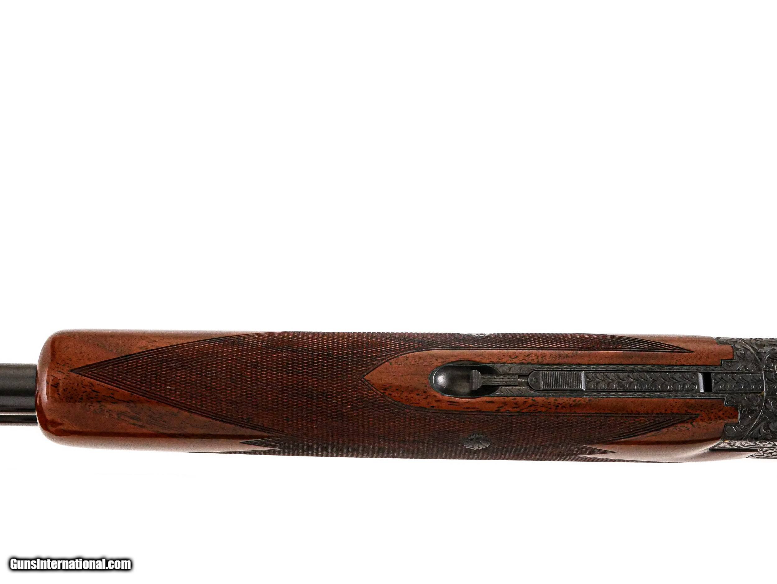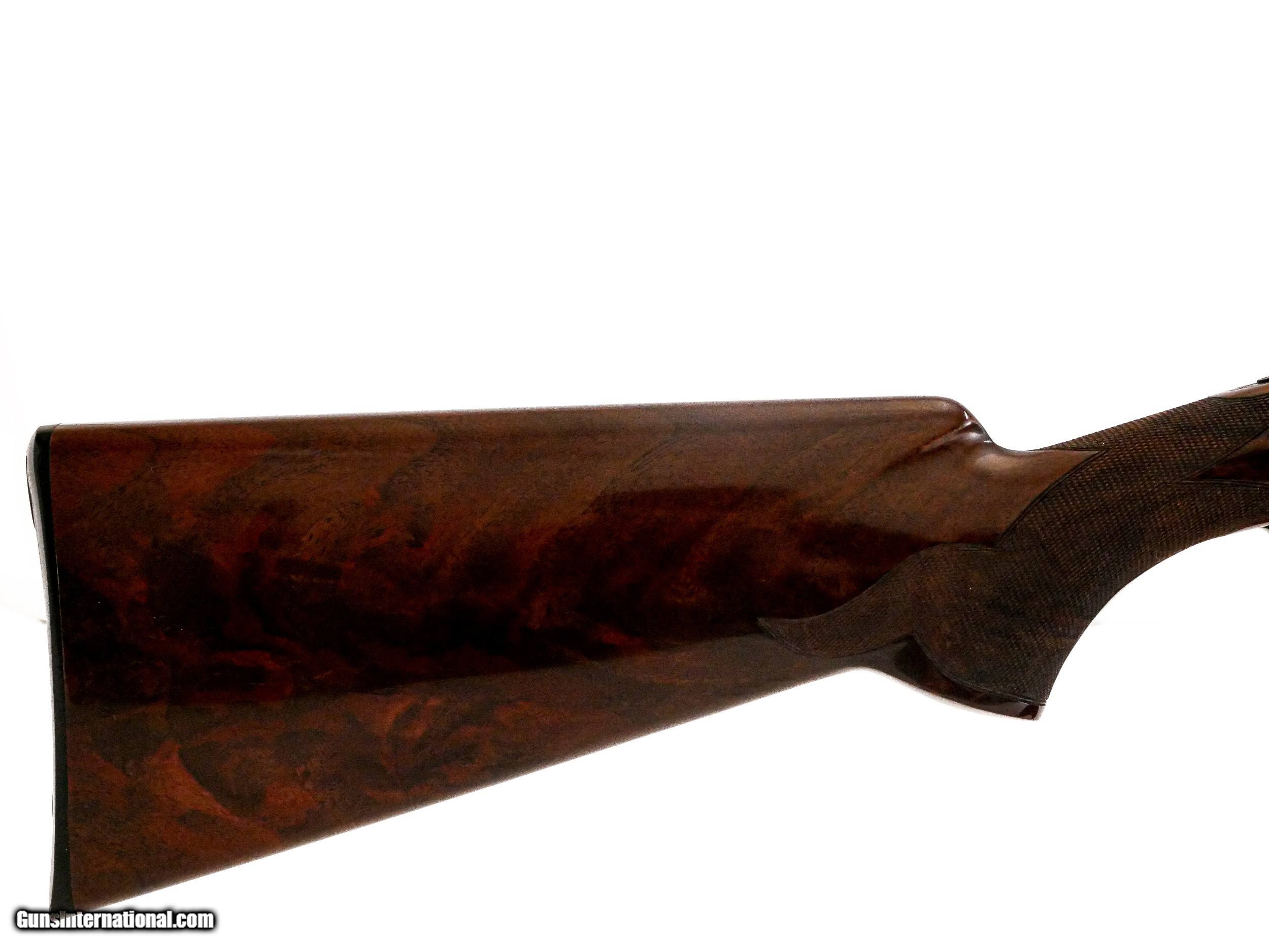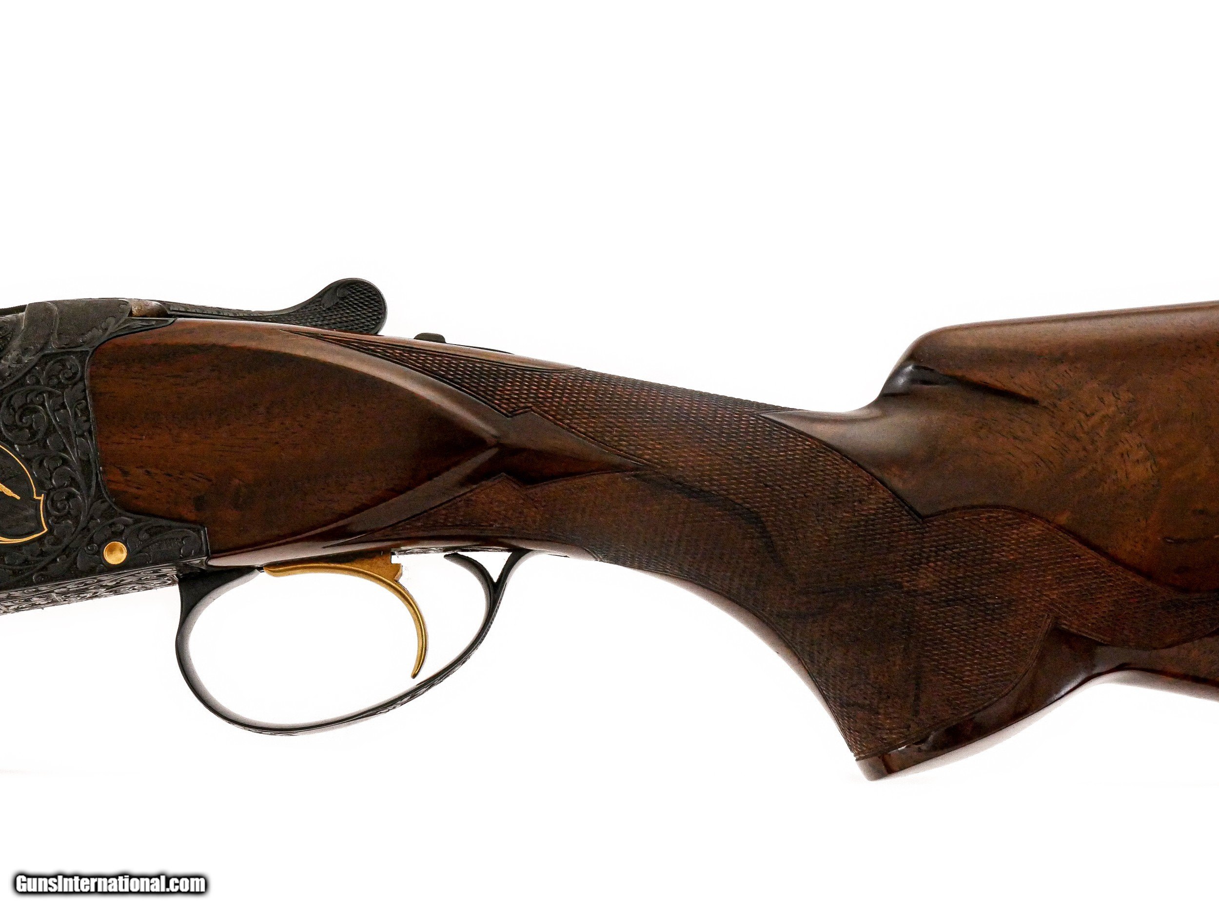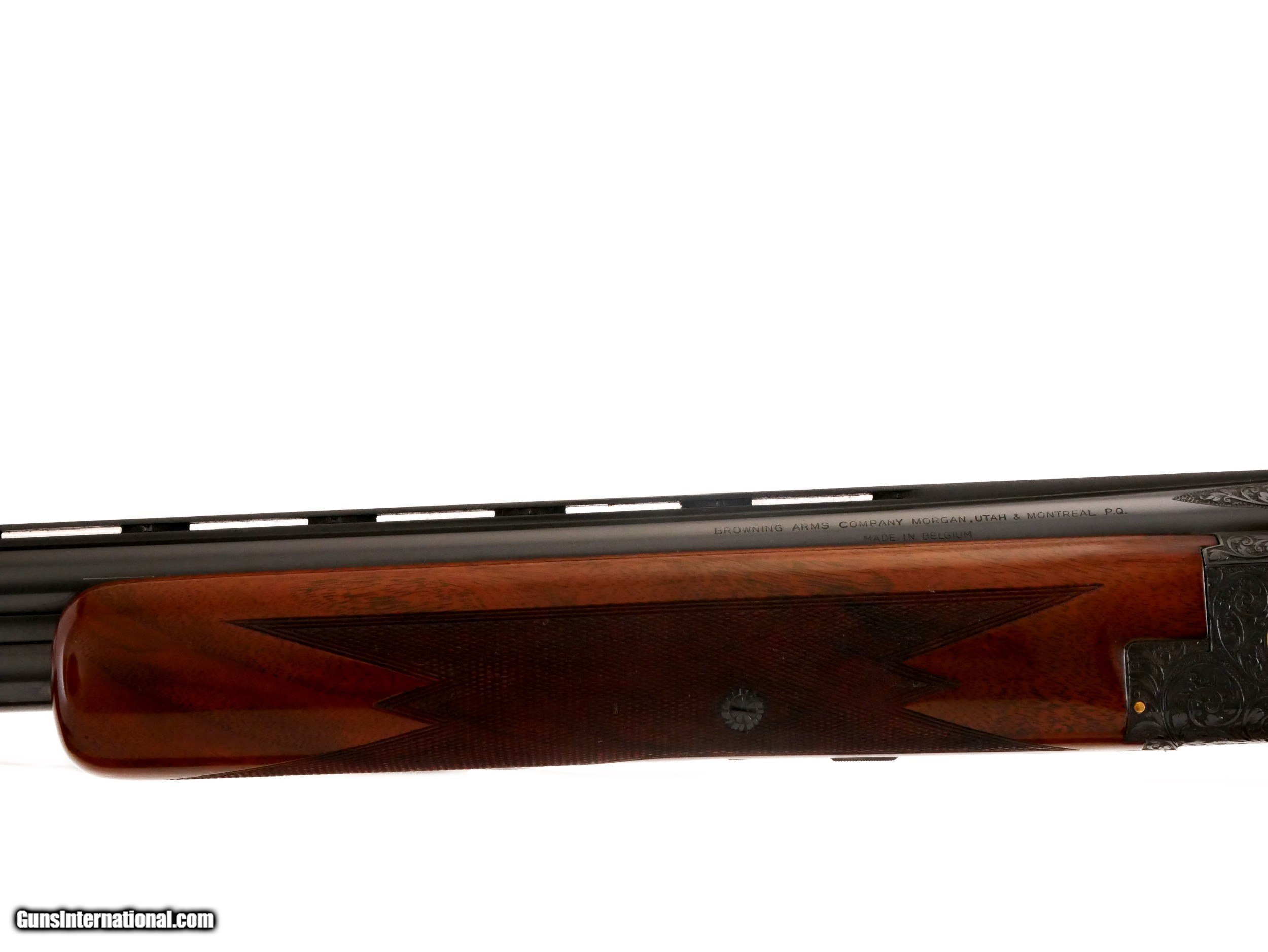 Description: Browning - Midas, 20ga. 26 ½” Barrels Choked IC/M. Figured Turkish walnut, special order 1971 Belgian gun, round knob long tang, butt plate. Extremely rare! Field style foreend, Midas engraving pattern by Jean Marie Debrus and Henri Deprez. This is brand new, highest quality, collector gun in its original browning case. We don’t believe this gun has ever been shot, it is collector quality, and very rare in its condition. The checkering is clean, it doesn’t look like anyone has touched the gun. Inv: 21819 6 lbs. 6 oz. 14 3/4" x 1 3/8" x 2 1/4" $26,995.00 SOLD |