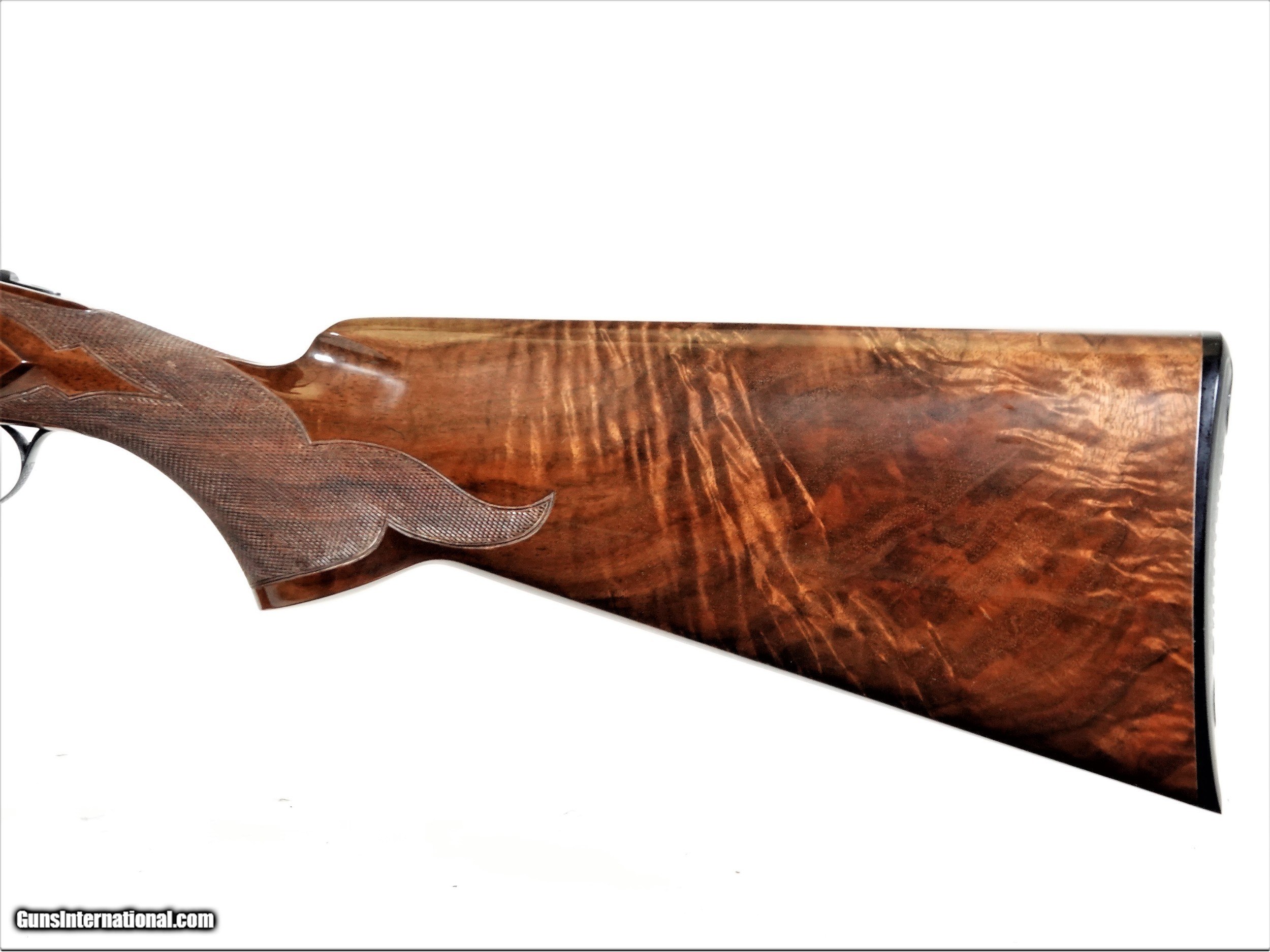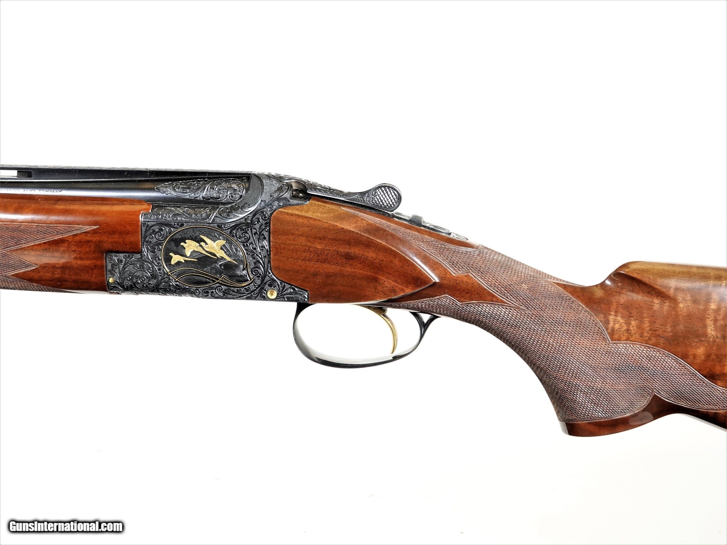 Description: Browning - Midas, .410ga. 28" Barrels Choked SK/SK. Highly figured short tang square knob stock, Browning butt plate, 1970 Belgian workmanship, Raison signed Midas engraving pattern, hunting forend, vent rib, auto ejectors, beautiful gun that remains in 99% condition throughout.