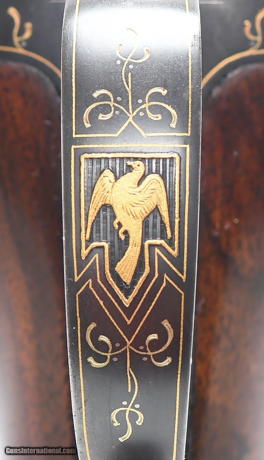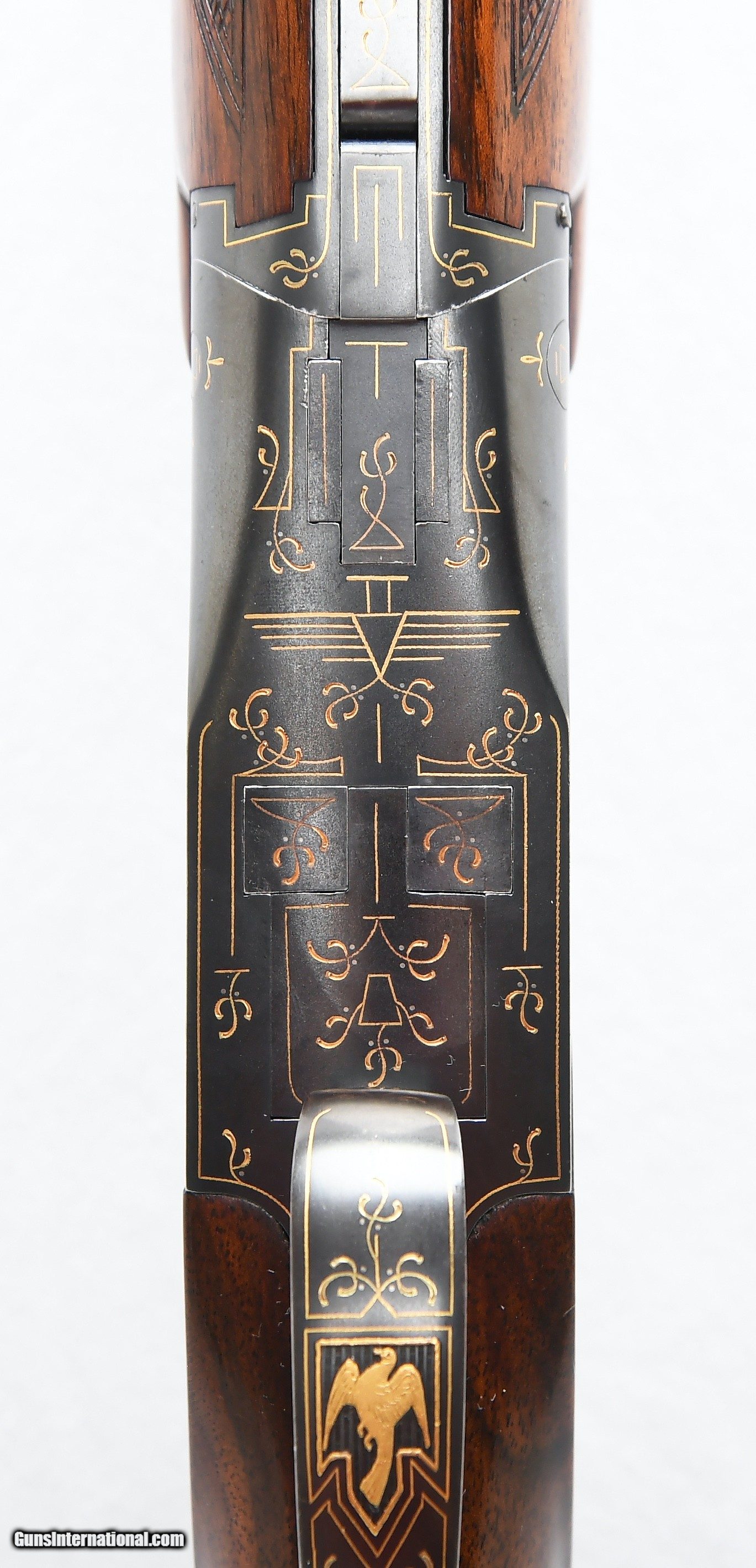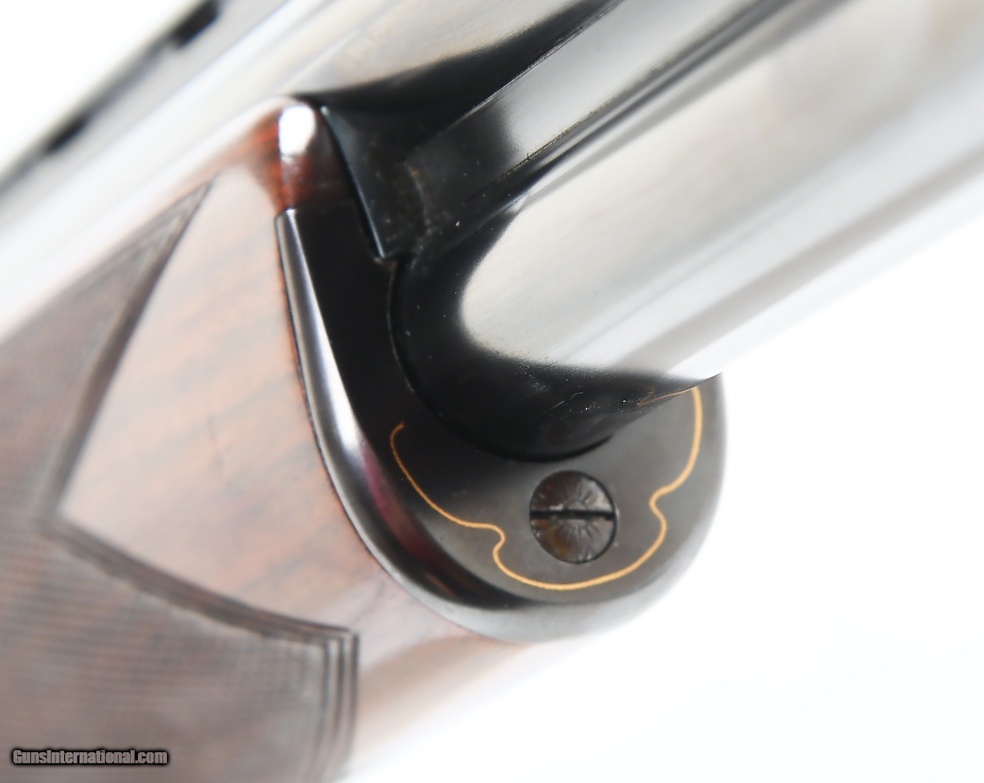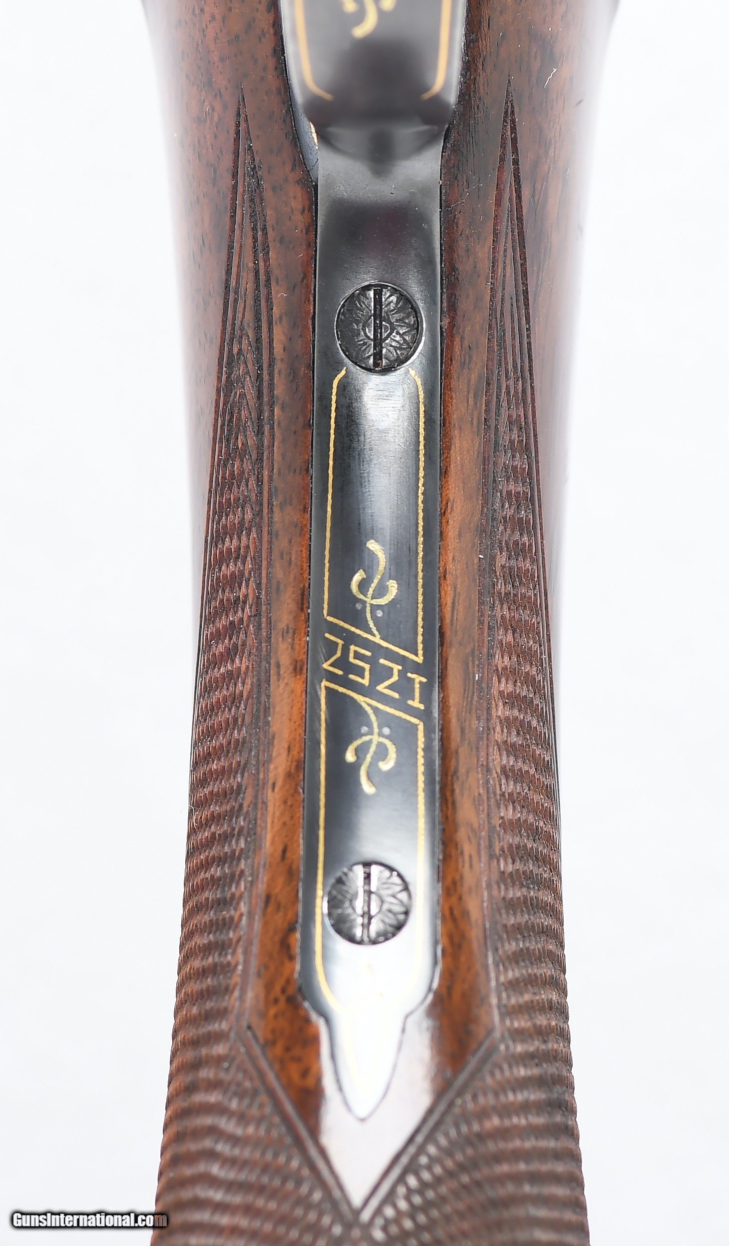 Description: Browning Superposed pre-war Midas grade O/U 12 gauge shotgun. Not only is it pre-war, it is the second year production of 1932. Configured as a trap gun with 30” (29 ¾”) barrels choked XF/XF (.035” each) in original .729” bores. The vent rib is the “Non Crossfire” style that was standard at the time. This gun has a factory single selective trigger and of course it is long tang/round knob. The forearm I am certain is original to the gun; the buttstock I am not so certain as the few photos that I have found all show a somewhat finer checkering pattern. If it was restocked it was done professionally with excellent Browning-like wood-to-metal fit. The stock has an estimated LOP of 14 ½”, I have allowed and additional ¼” because of the extreme rear position of the trigger! 1 3/8” DAC and 2” DAH with neutral cast. What is truly spectacular about this gun is the metal. The receiver, barrels and trigger guard retain nearly all of their original finishes and the Midas gold work is exceptional and the Art Deco influence in the gold work is unmistakable. The gun weighs 7 lbs. 8 oz. and just to top off this extraordinary gun is comes in the original Browning luggage case! $8.975.00 SN: 2521 SOLD Curio/Relic: Yes |