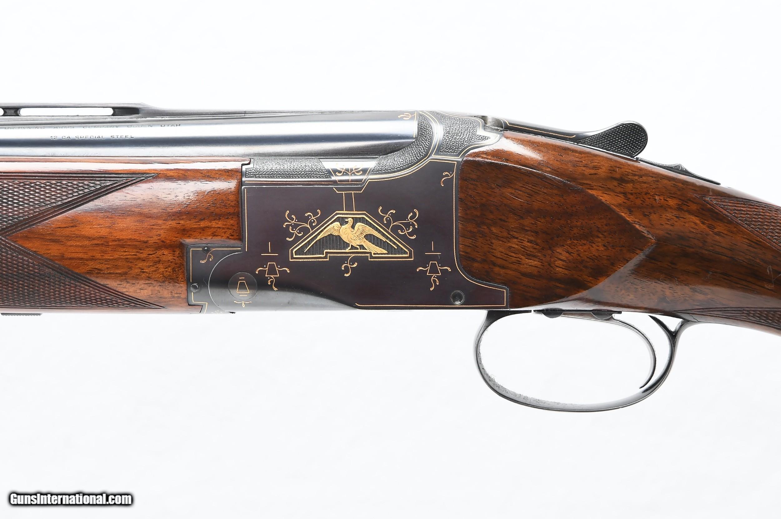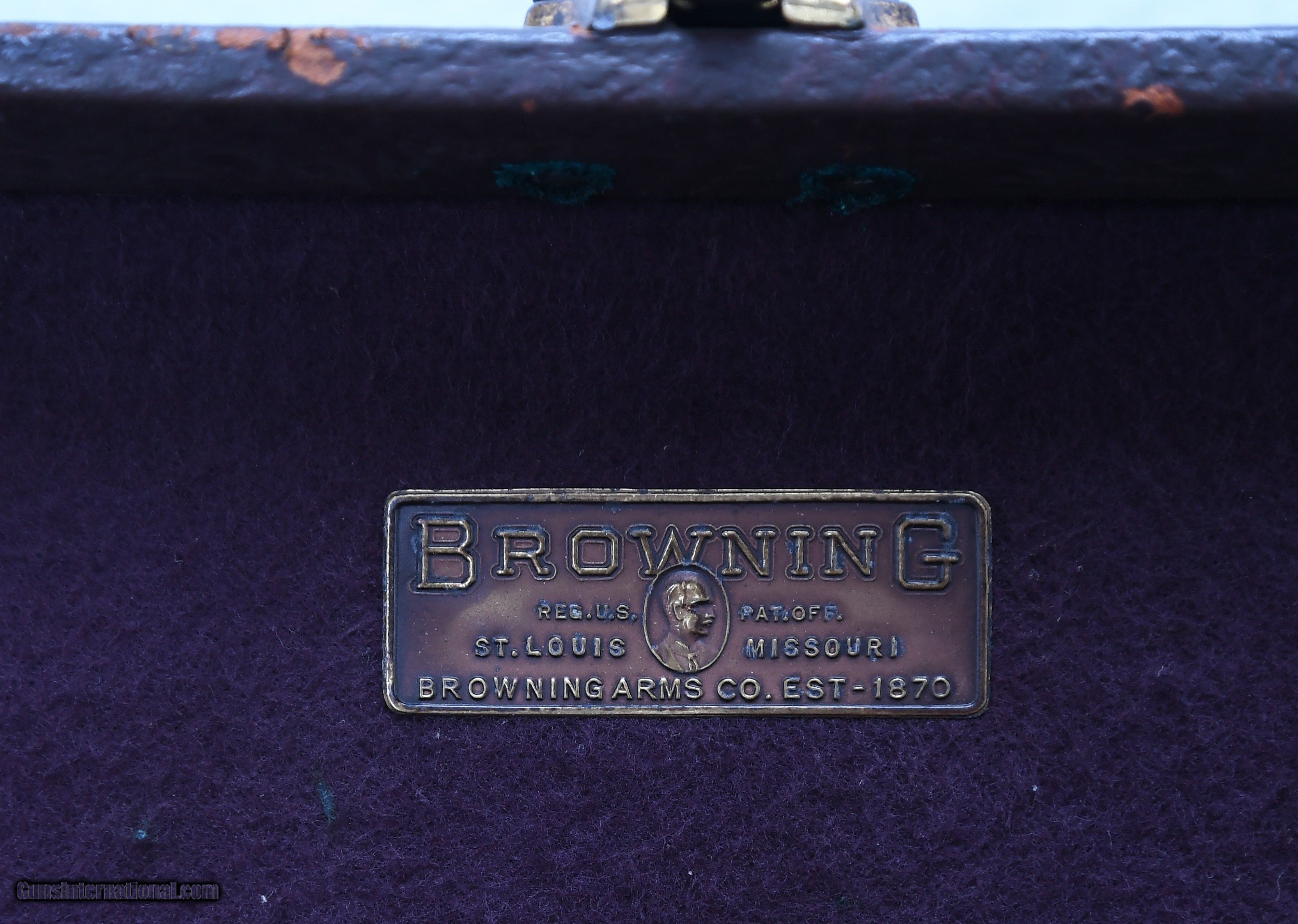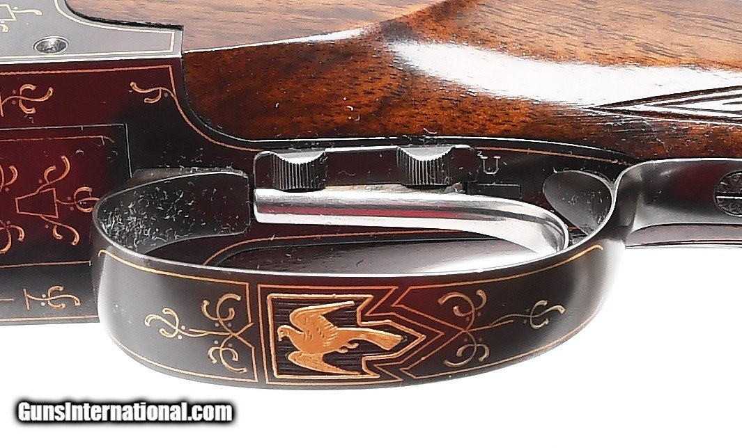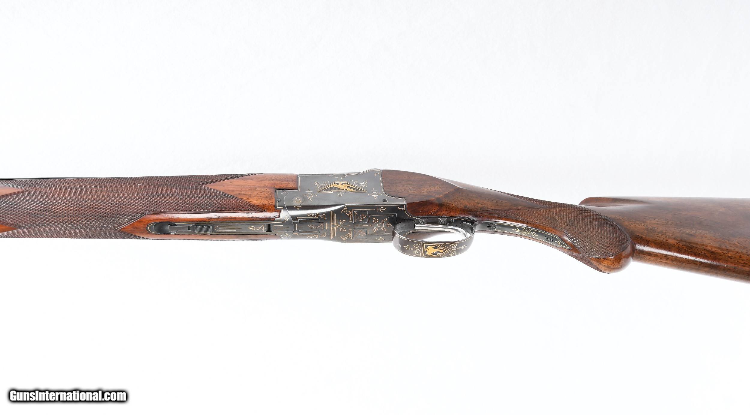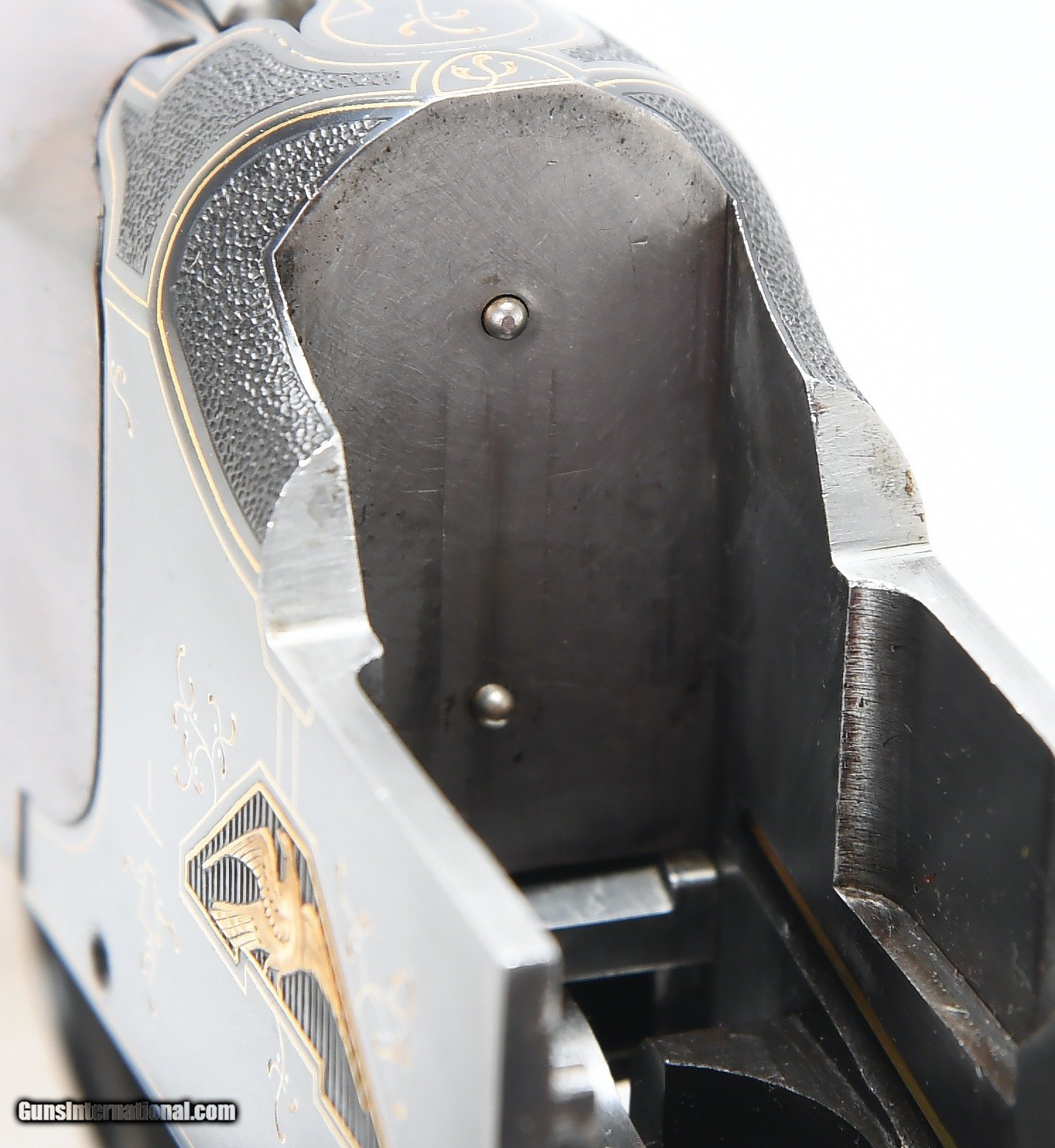 Description: Browning Superposed pre-war Midas grade O/U 12 gauge shotgun. Not only is it pre-war, it is the second year production of 1932. Configured as a trap gun with 30” (29 ¾”) barrels choked XF/XF (.035” each) in original .729” bores. The vent rib is the “Non Crossfire” style that was standard at the time. This gun has a factory single selective trigger and of course it is long tang/round knob. The forearm I am certain is original to the gun; the buttstock I am not so certain as the few photos that I have found all show a somewhat finer checkering pattern. If it was restocked it was done professionally with excellent Browning-like wood-to-metal fit. The stock has an estimated LOP of 14 ½”, I have allowed and additional ¼” because of the extreme rear position of the trigger! 1 3/8” DAC and 2” DAH with neutral cast. What is truly spectacular about this gun is the metal. The receiver, barrels and trigger guard retain nearly all of their original finishes and the Midas gold work is exceptional and the Art Deco influence in the gold work is unmistakable. The gun weighs 7 lbs. 8 oz. and just to top off this extraordinary gun is comes in the original Browning luggage case! $8.975.00 SN: 2521 SOLD Curio/Relic: Yes |
