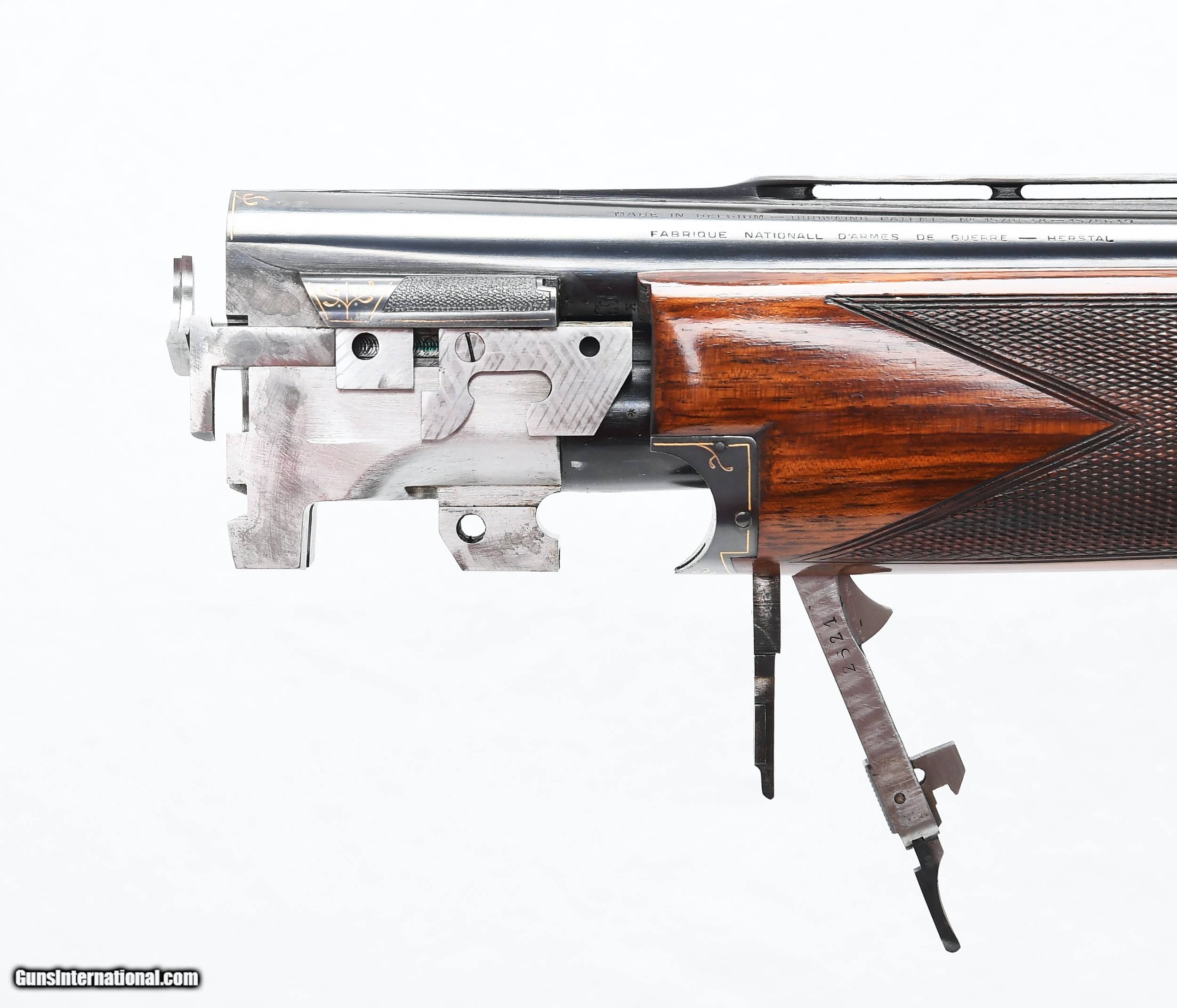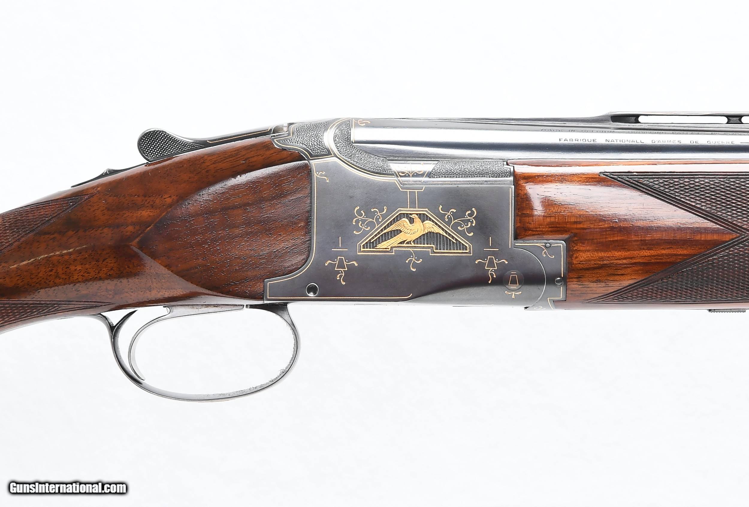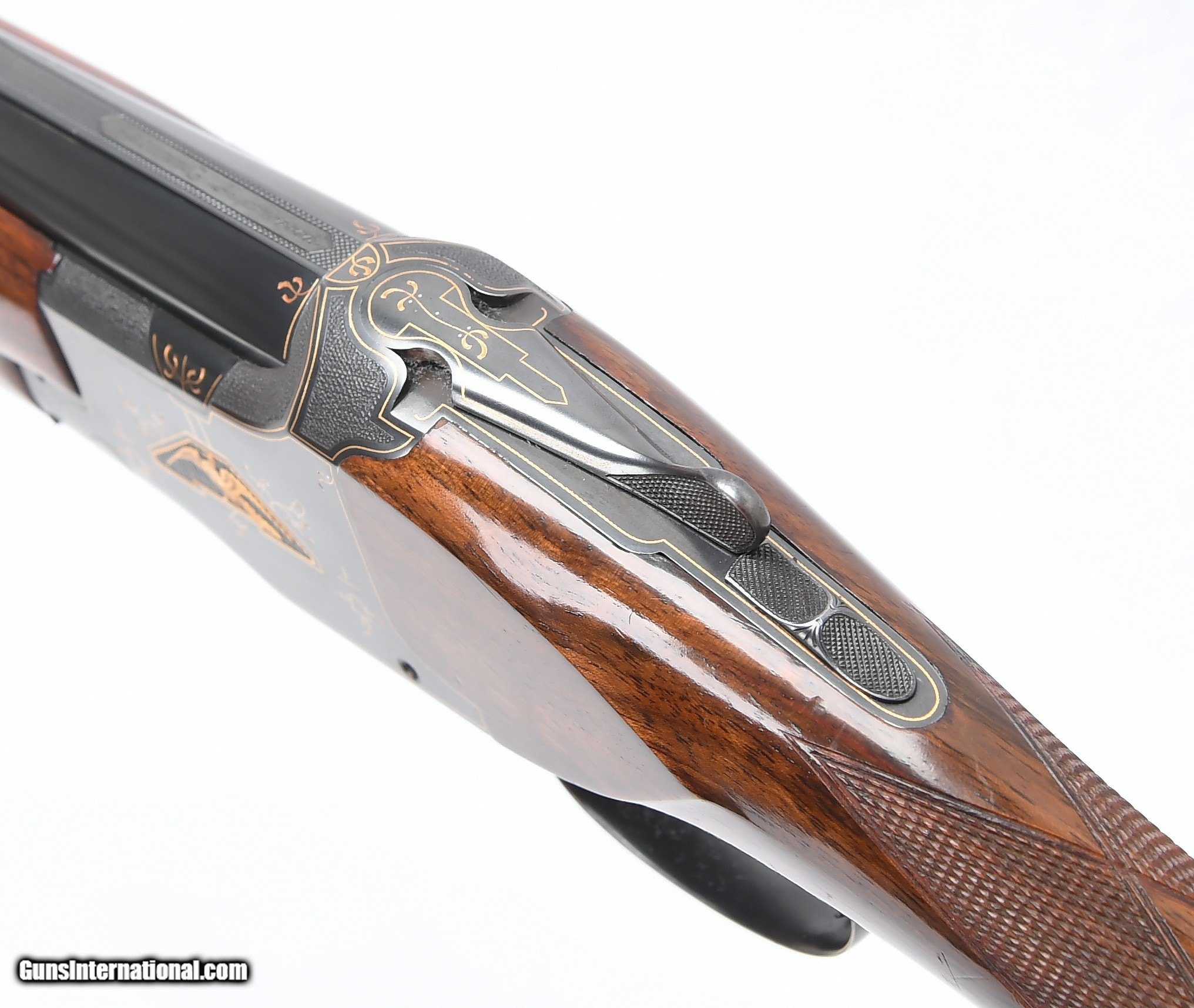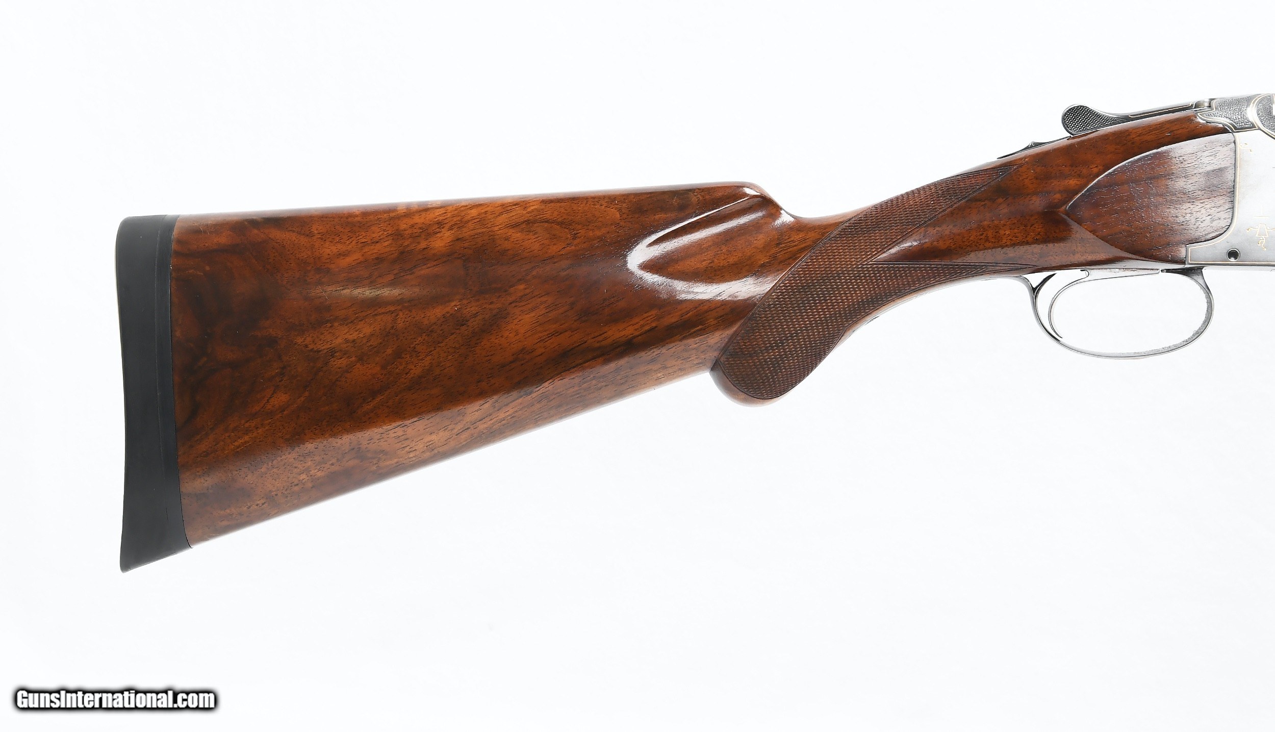 Description: Browning Superposed pre-war Midas grade O/U 12 gauge shotgun. Not only is it pre-war, it is the second year production of 1932. Configured as a trap gun with 30” (29 ¾”) barrels choked XF/XF (.035” each) in original .729” bores. The vent rib is the “Non Crossfire” style that was standard at the time. This gun has a factory single selective trigger and of course it is long tang/round knob. The forearm I am certain is original to the gun; the buttstock I am not so certain as the few photos that I have found all show a somewhat finer checkering pattern. If it was restocked it was done professionally with excellent Browning-like wood-to-metal fit. The stock has an estimated LOP of 14 ½”, I have allowed and additional ¼” because of the extreme rear position of the trigger! 1 3/8” DAC and 2” DAH with neutral cast. What is truly spectacular about this gun is the metal. The receiver, barrels and trigger guard retain nearly all of their original finishes and the Midas gold work is exceptional and the Art Deco influence in the gold work is unmistakable. The gun weighs 7 lbs. 8 oz. and just to top off this extraordinary gun is comes in the original Browning luggage case! $8.975.00 SN: 2521 SOLD Curio/Relic: Yes |