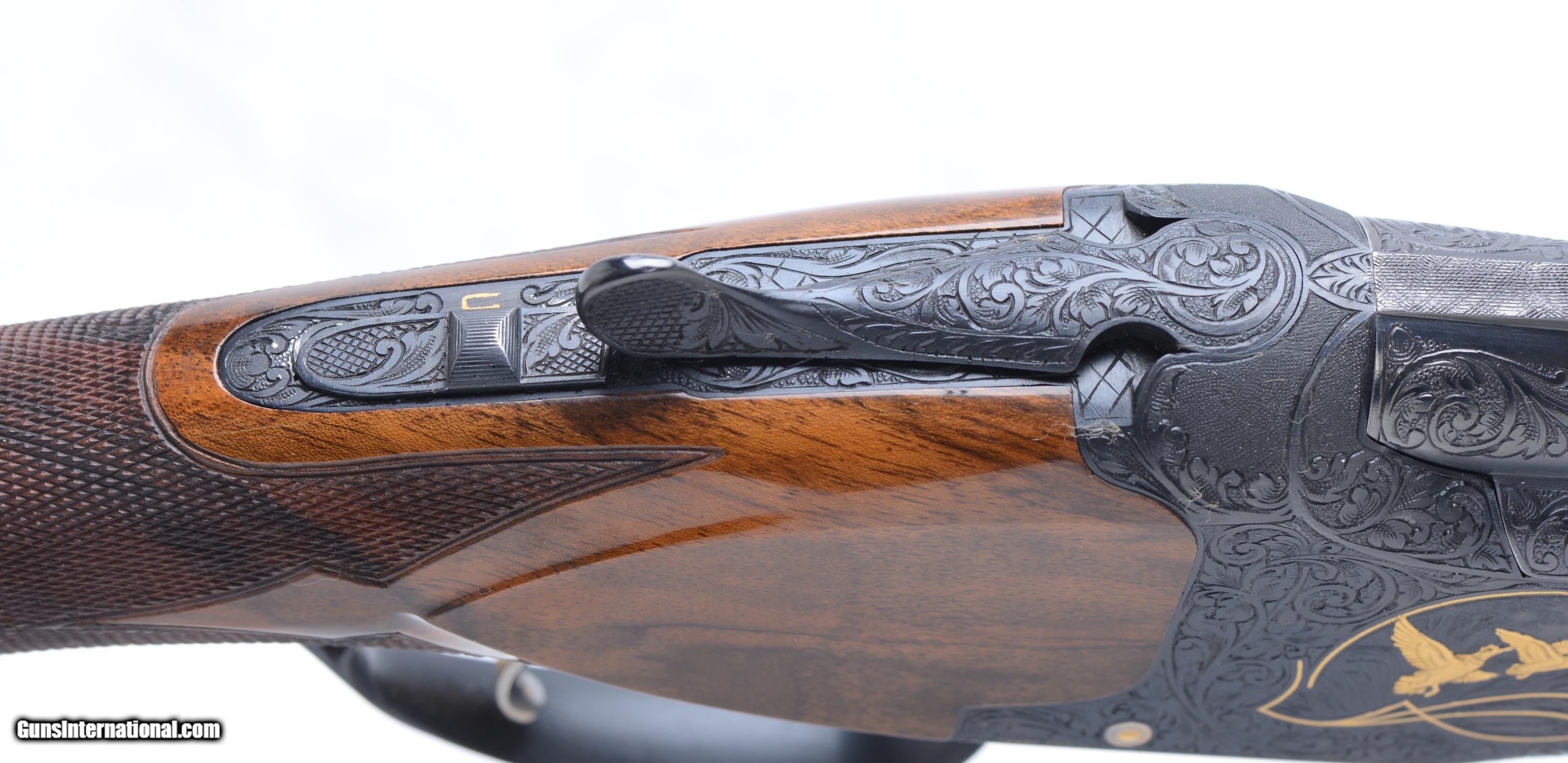 Description: SALE PENDNG Browning Superposed 28 gauge O/U shotgun that was beautifully engraved, in a Midas Grade pattern, by former Browning factory engraver and recognized Master Engraver, Angelo Bee. This Midas engraving has three gold inlaid pheasants in flight on the left side of the receiver; three gold inlaid Mallards on the right side and a gold inlaid quail on the bottom. The inlays are surrounded by fine floral and scroll that matches the engraved top tang, trigger guard, forend iron, top lever and barrels. Built in a field configuration with long tang, round knob, single trigger and factory 26 ½ barrels choked IC/Mod and a hand filed vent rib. The metal finishes are all 98%+ with typical forend “slide” marks on the bottom barrel. Aside from one or two light handling marks the stock is perfect. LOP is 14 1/8” over the Browning buttplate; 1 7/16” DAC and 2” DAH with neutral cast. It weighs a mere 6 lbs. 6 oz. Made in 1960 Bonus features: A set of Briley Match Weight .410 bore sub-gauge tube with 5 choke tube and a Browning luggage case that accomdates the Midas and the tubes (two barrel case) $18,500.00 0F165 SOLD |