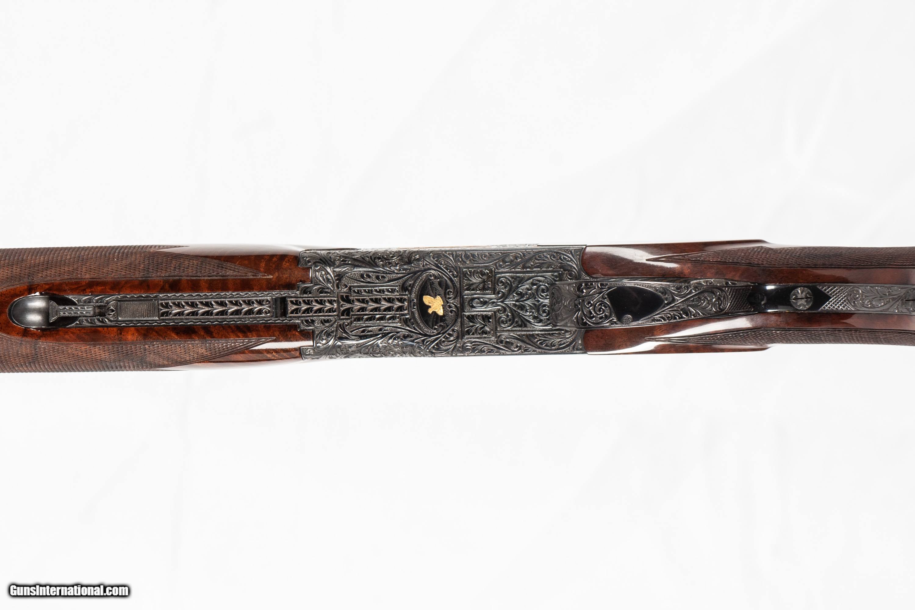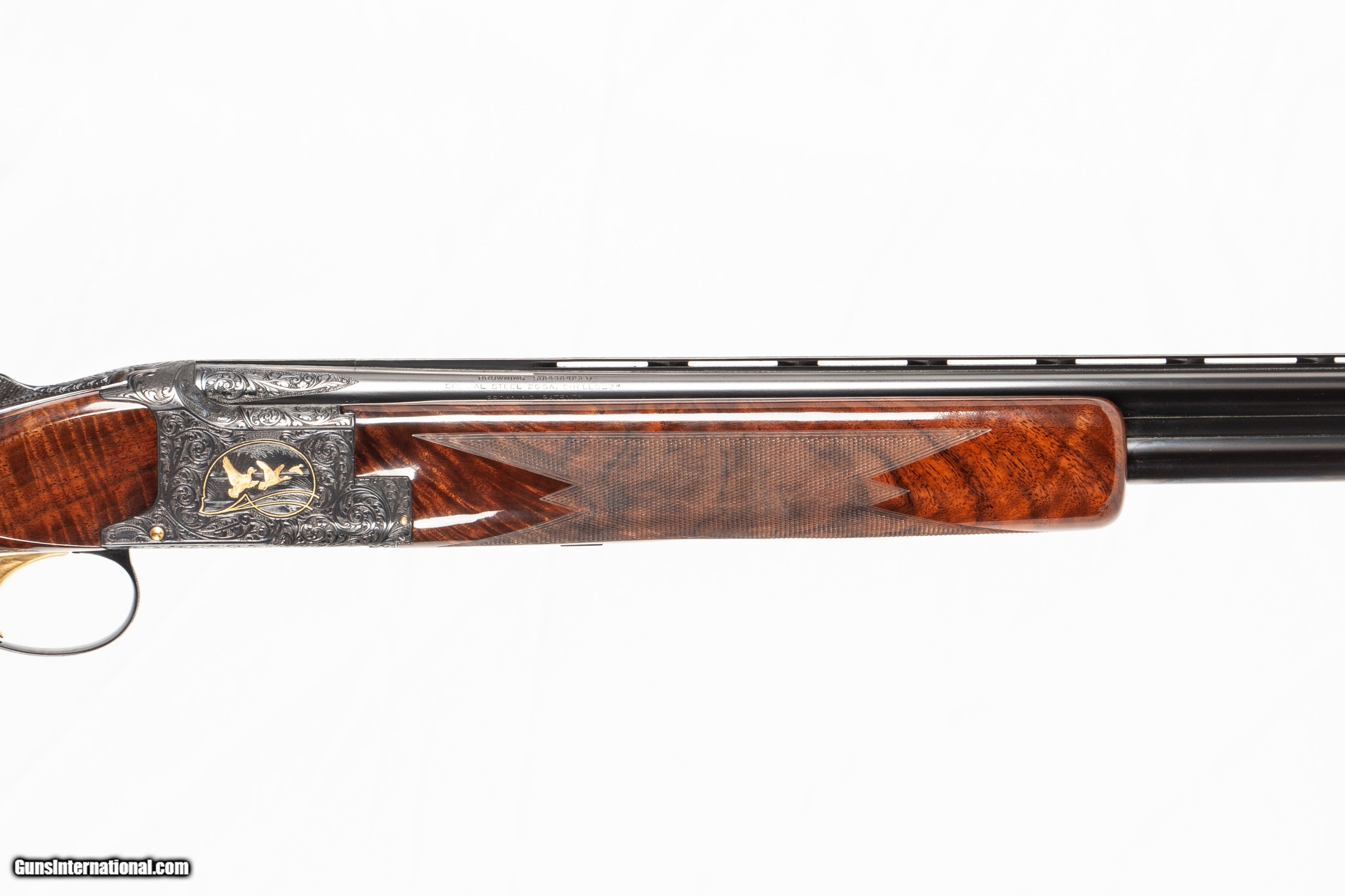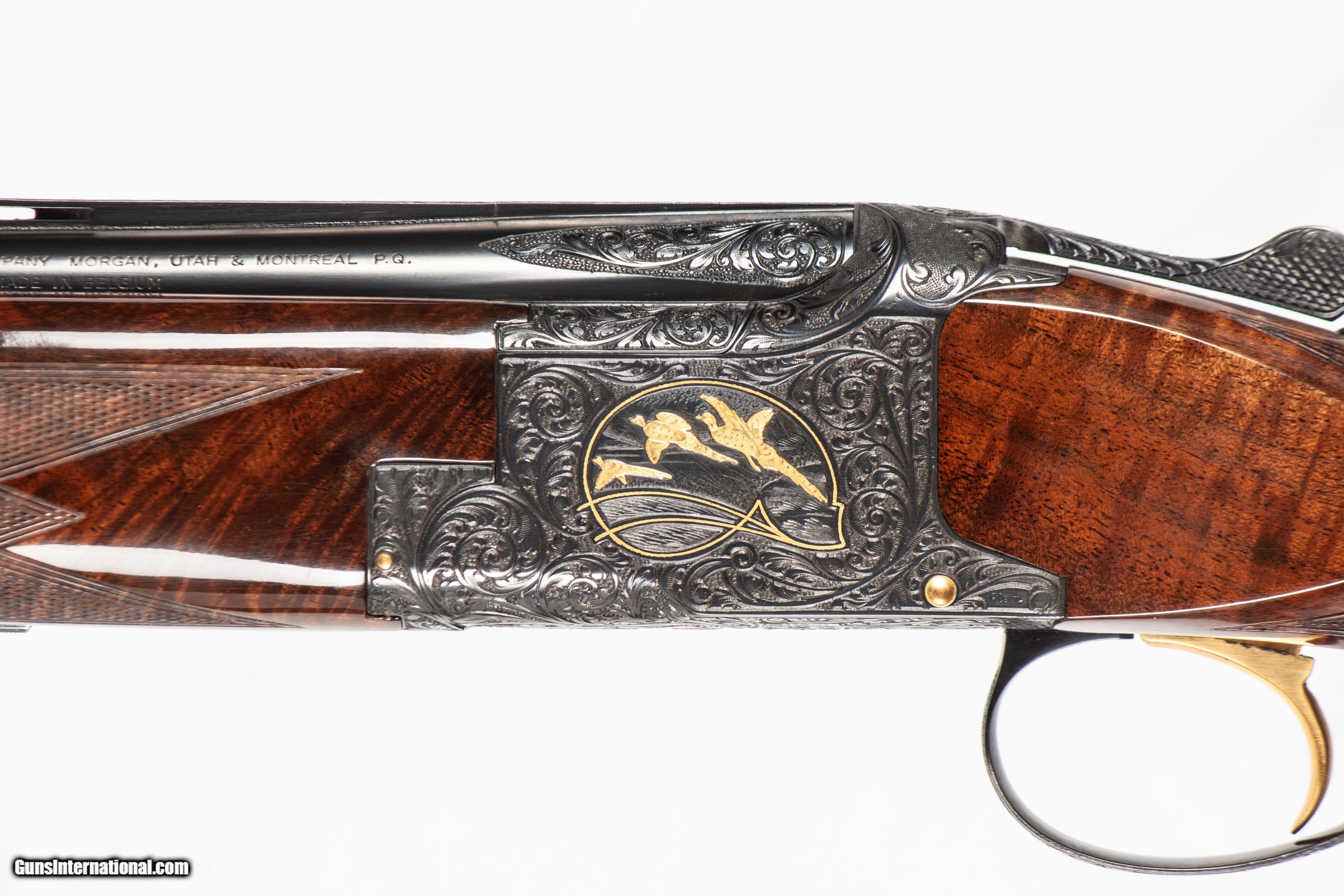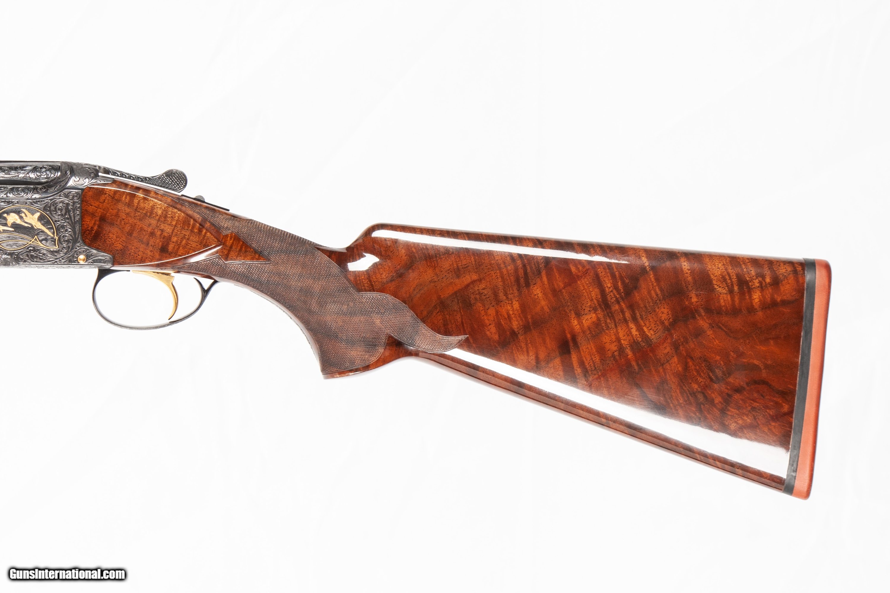 Browning Superposed Midas Grade manufactured in Belgium. 28 inch 20 gauge barrels that have bright & shiny bores 3 inch chambers fixed chokes (modified over improved cylinder under) and a 14 1/2 inch LOP. The frame barrel lugs trigger guard and rear portion of the barrel have been engraved in a floral style the receiver has 3 Pheasants gold inlaid on the left side with the right side having 3 Ducks and the bottom having a Quail in flight. The left side of the receiver is signed R Dewil while the right is signed Wilmotte. This firearm is in excellent condition has the original box and is covered by Dury's Lifetime Warranty.