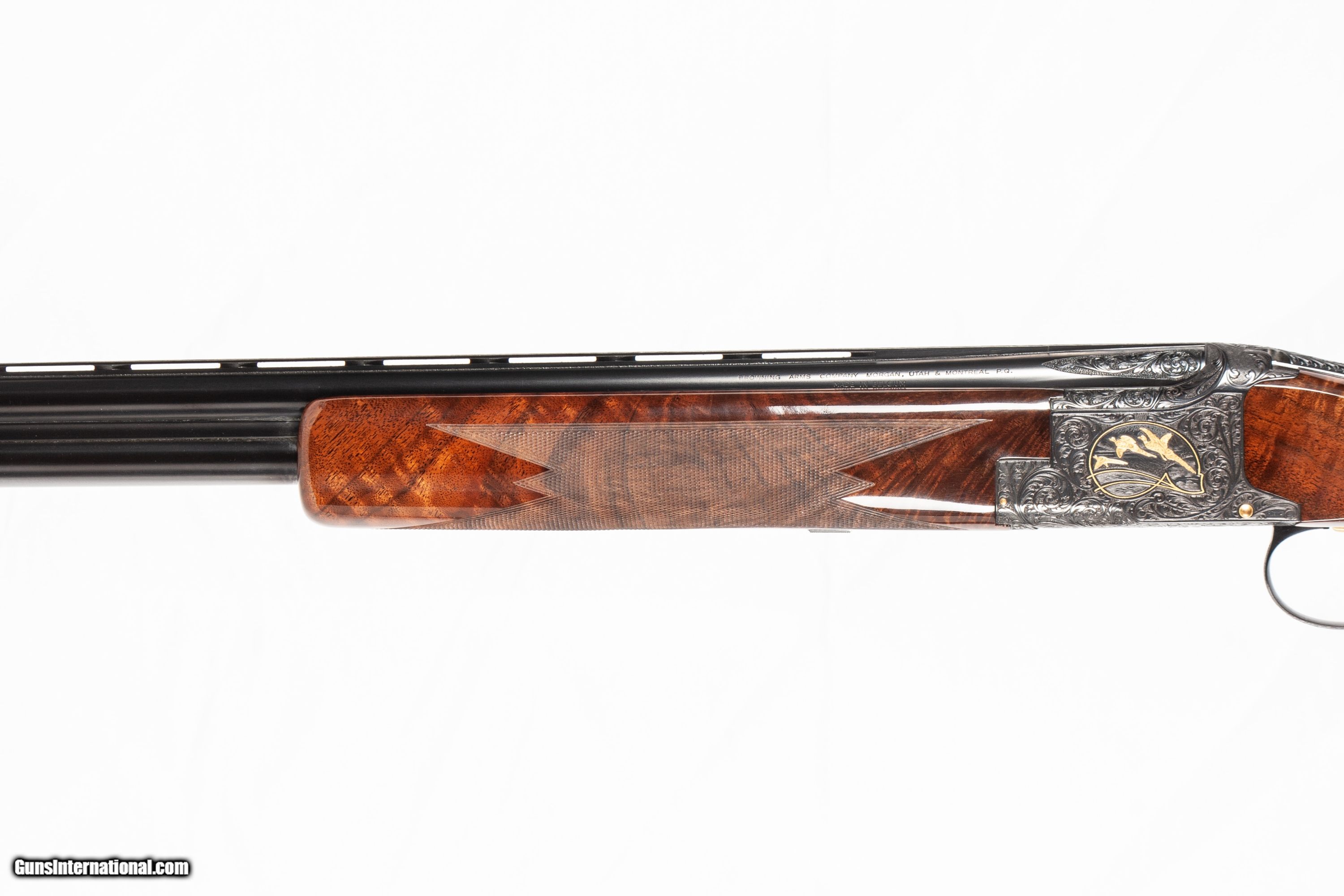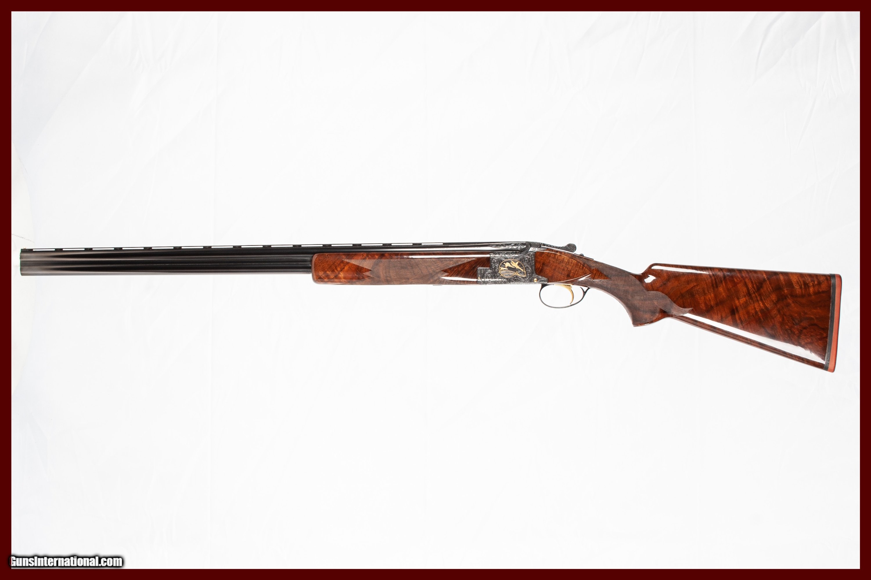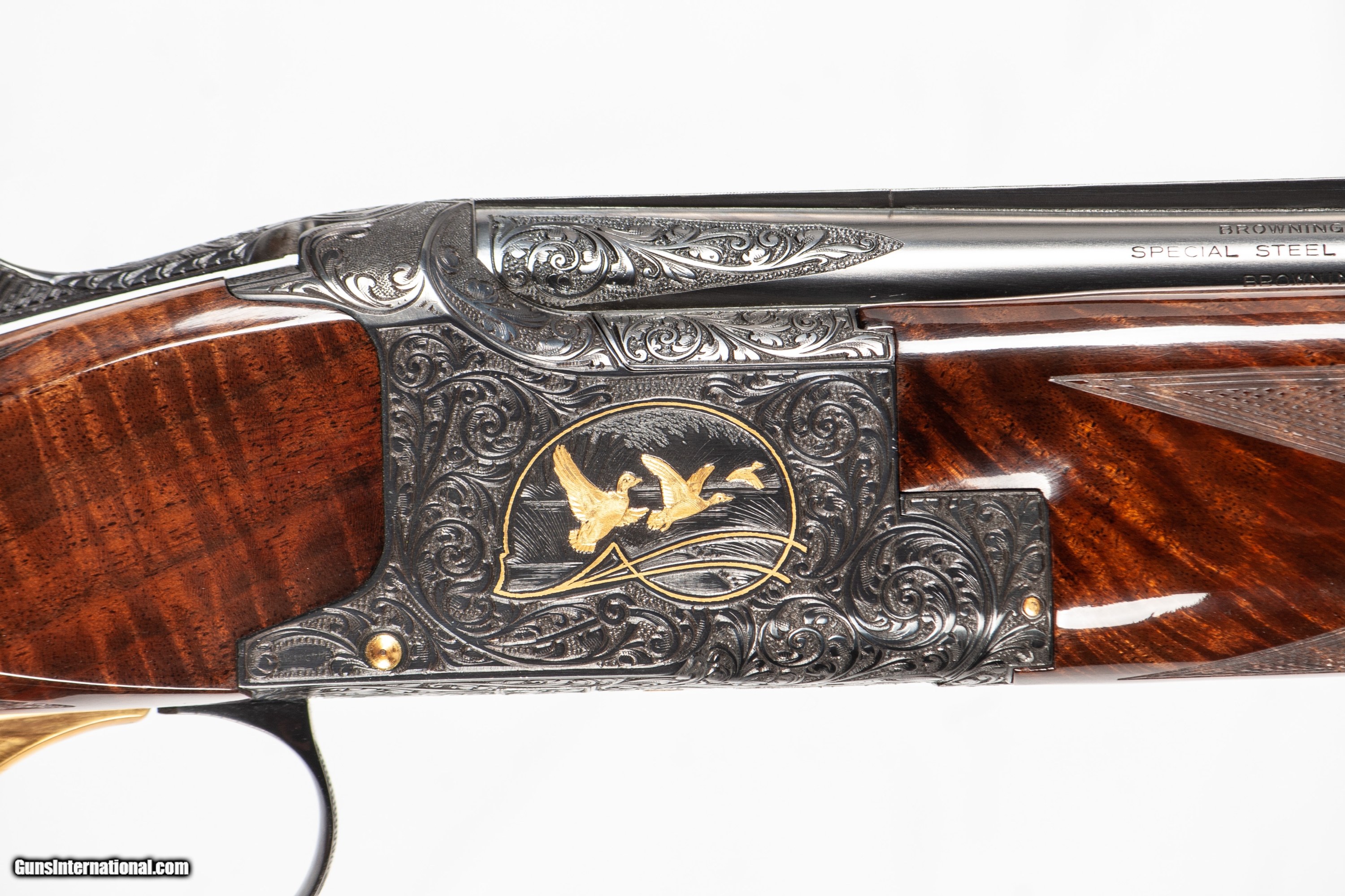 Browning Superposed Midas Grade manufactured in Belgium. 28 inch 20 gauge barrels that have bright & shiny bores 3 inch chambers fixed chokes (modified over improved cylinder under) and a 14 1/2 inch LOP. The frame barrel lugs trigger guard and rear portion of the barrel have been engraved in a floral style the receiver has 3 Pheasants gold inlaid on the left side with the right side having 3 Ducks and the bottom having a Quail in flight. The left side of the receiver is signed R Dewil while the right is signed Wilmotte. This firearm is in excellent condition has the original box and is covered by Dury's Lifetime Warranty.