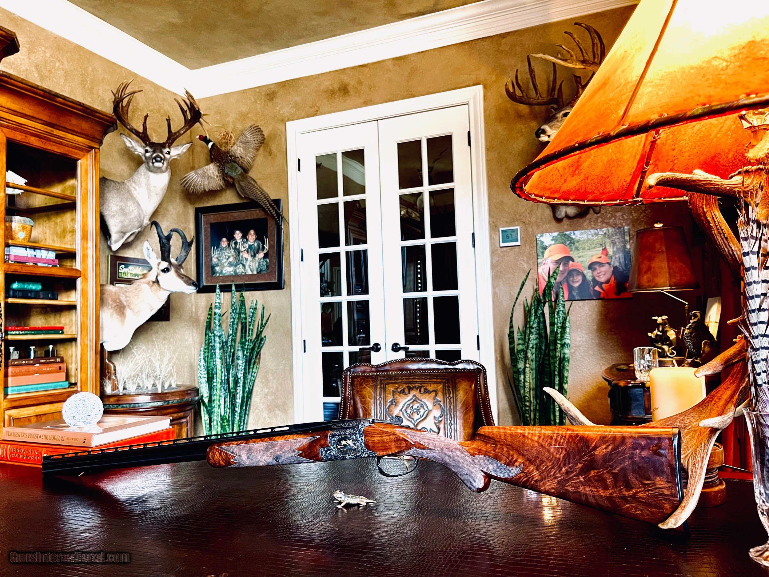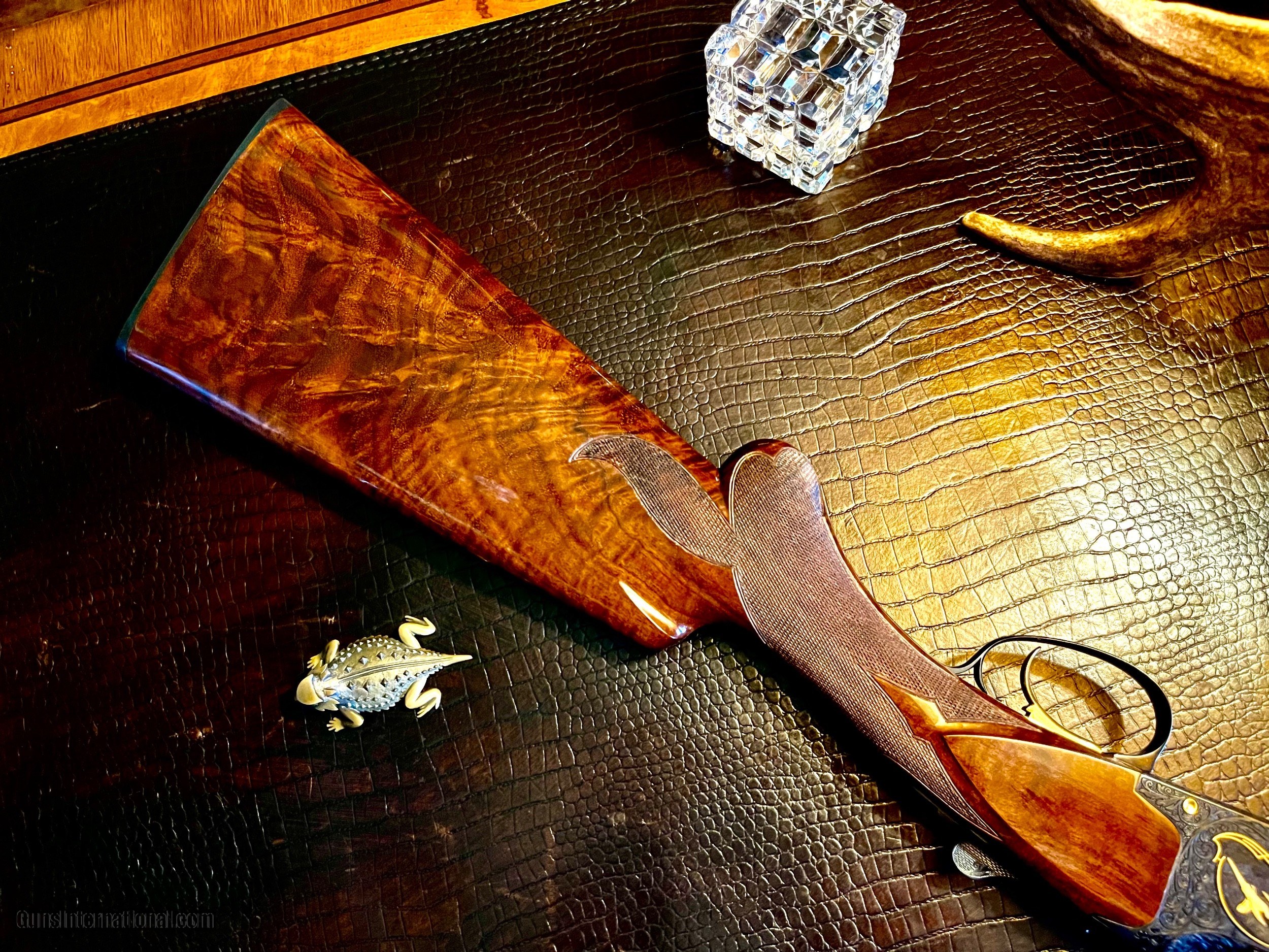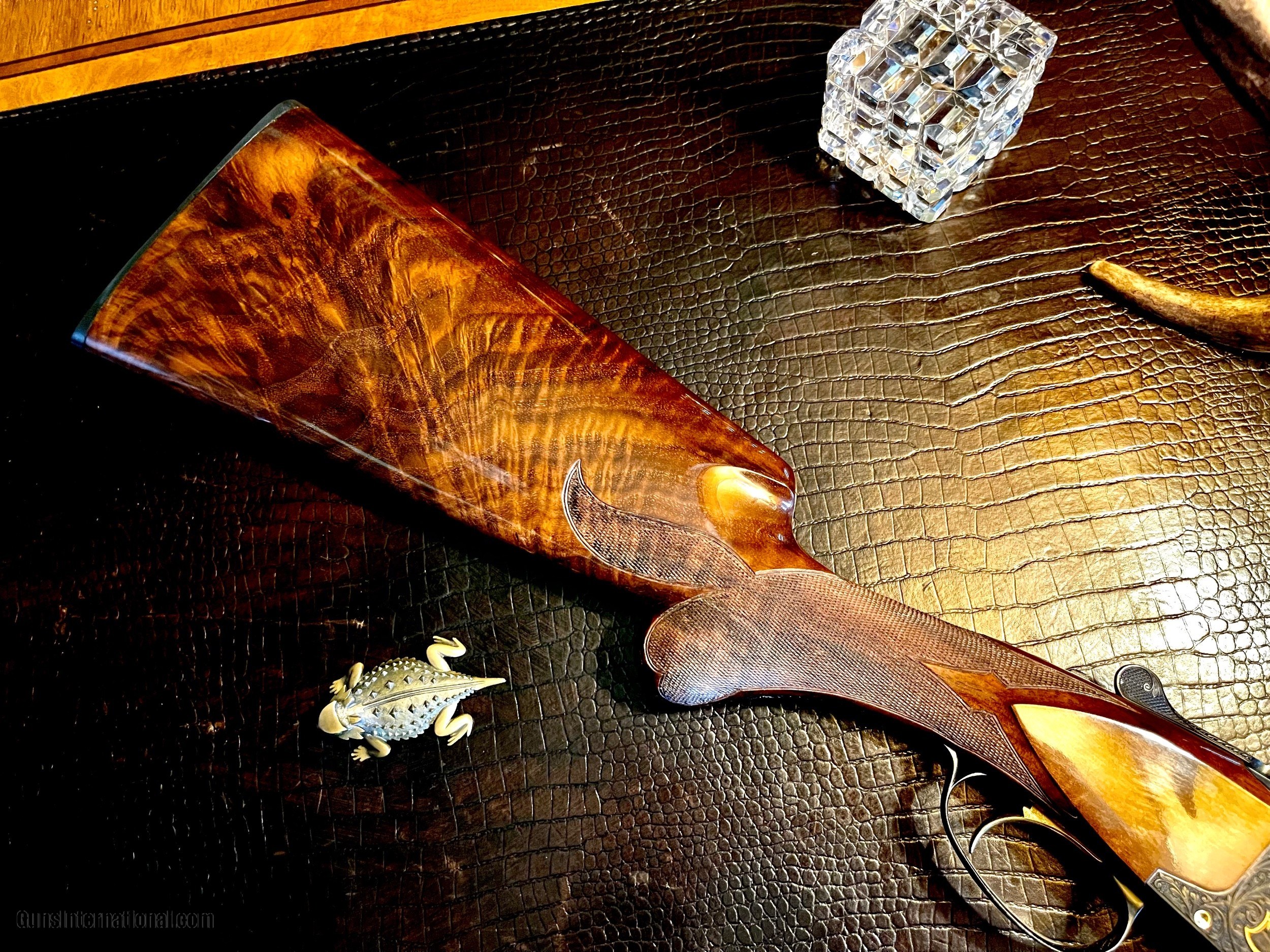 Description: Browning Superposed Midas RKLT - 410ga - 28” - F/F - ca. 1968 - 99% Condition - J. Dujardin Engraved - Fine Special Order Midas The Facts: 1. This gun is 1 of only 17 Midas "hunting grade" made from 1964-1969 which means less than three per year on average were made in this configuration 2. The assumption is made that this was a special order gun because it is a factory RKLT gun - look at the metal to wood fit - Dimensions also suggest this gun came to be via special order. 3. This gun was tested with silver nitrate by my FFL - no salt found 4. Another assumption that could be made is that the gun was salty was was sent back to Browning to be refurbished under warranty and the current wood was added - I lean toward the idea that this gun is a special order because of the dimensions. 5. There is no evidence of field use on this high grade Browning Midas - it is in remarkable condition and there are no disclosures necessary. *****SCROLL DOWN TO SEE SPECIFICATIONS***** Quillen-Worfe Fine Gun Collection & Consignments *****Please read prior to making a purchase*****: