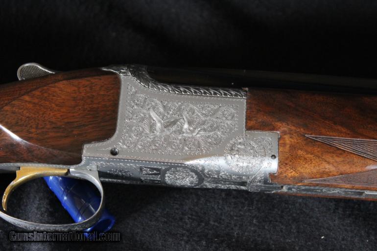 Description: Browning Pigeon Grade Superposed Trap 12 ga. 1963 manufacture S/N 8359 S3. 30” full and modified chokes slight blue loss forward of the forend (slide wear typical) Bores are bright and shiny. Excellent engraving and checkering, receiver coin finish is 97% or better, trigger guard finish shows some wear to bright, 14 ¼” LOP to Browning recoil pad, 1 ¼” DAC 1 ¾” DAH. Excellent finish on nicely finished wood. Single selective trigger. An outstanding Vintage Pigeon Grade. SOLD Curio/Relic: Yes |