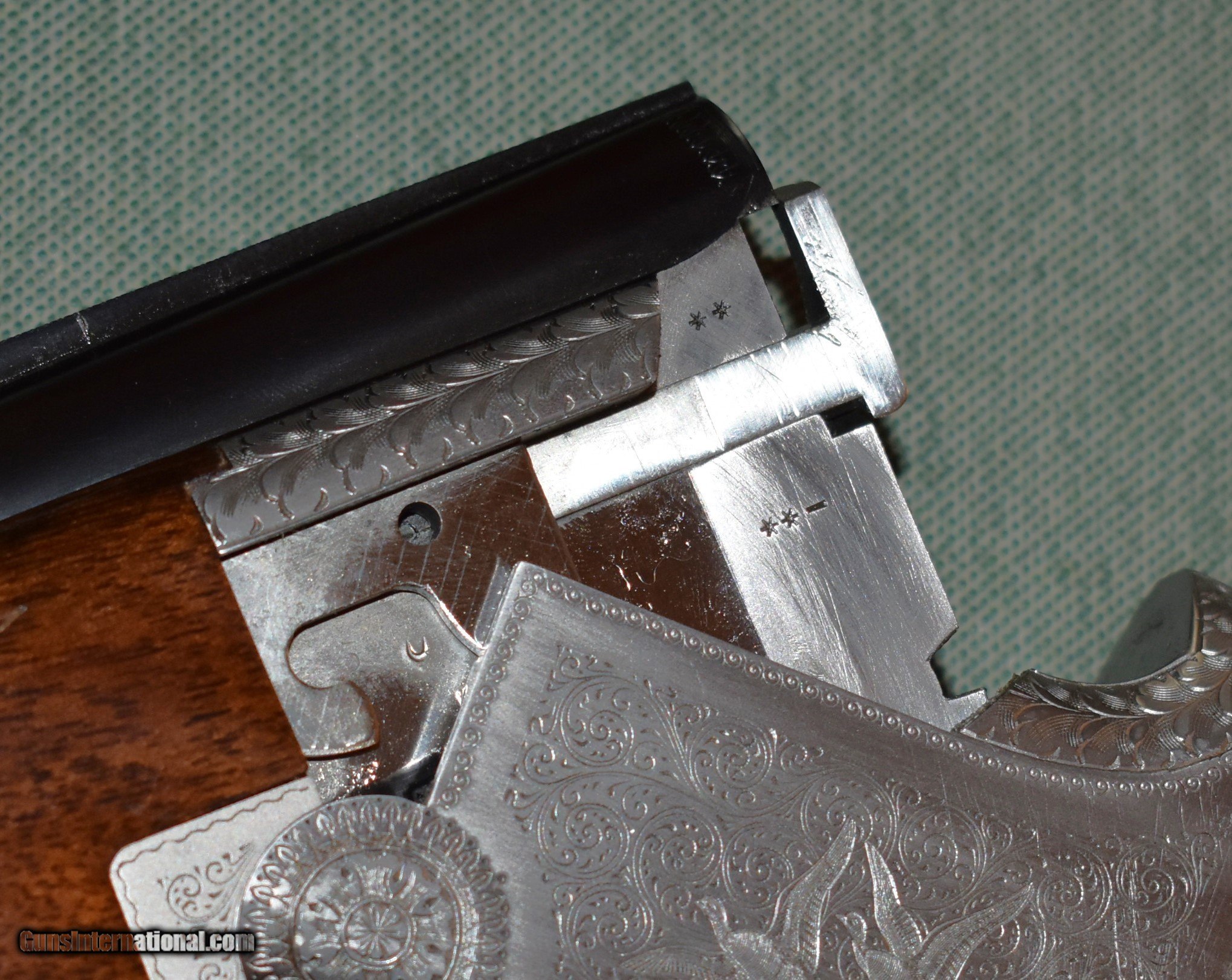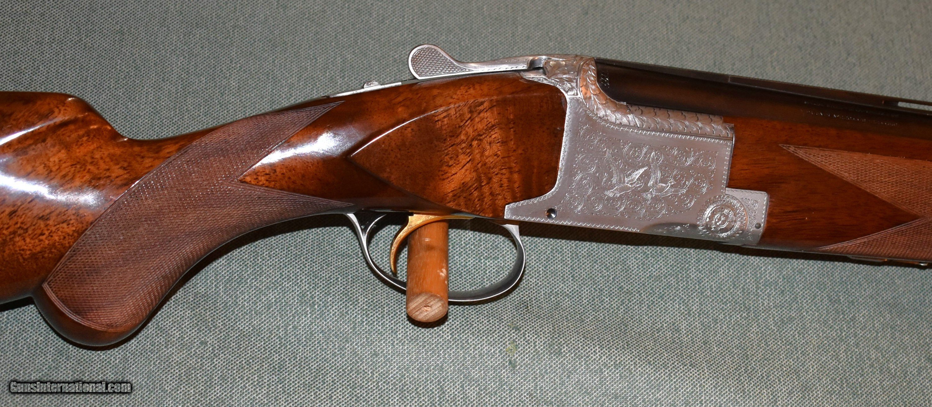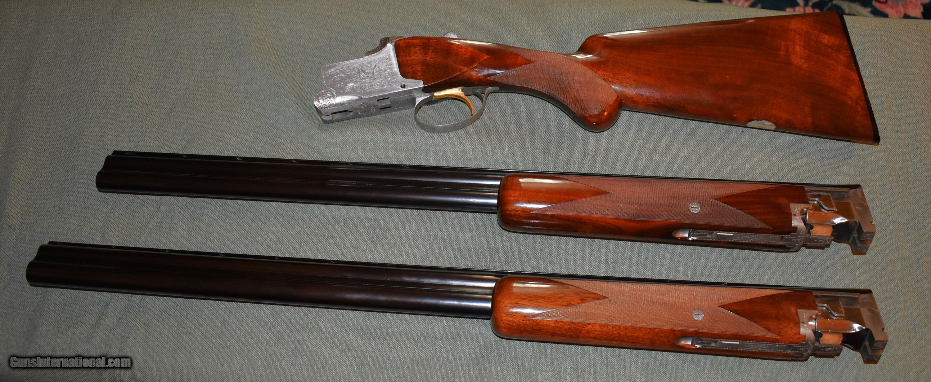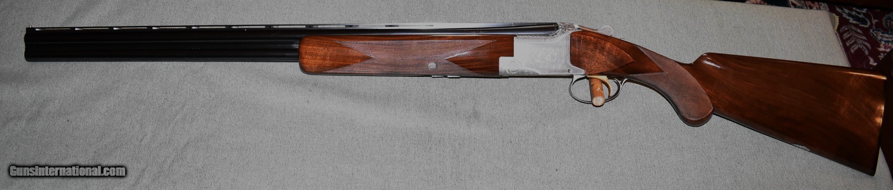 Description: A very unusual Belgian Browning Pigeon Grade 12 gauge,20 gauge 2 barrel set. Both barrels sets are choked improved cylidner and modified. The 12 gauge set is 28" long and the 20 gauge set is 261/2"long. Most 12/20 sets you see are skeet choked. This gun is in excellent original condition retaining 99% of the original blue and wood finishes. Built in 1970,the gun has a round knob short tang stock. It shows no signs of any salt wood any where on the gun. Both sets of barrels fit tightly to the action and are numbered to the receiver. The gun comes in a Browning factory luggage case. A great all around Belgian Browning for hunting or clays. Price includes shipping to your FFL. SOLD Shotgun Gauge: 12 Gauge, 20 Gauge Manufacturer: Browning (FN) Model: Pigeon Grade Serial Number: 35570S70 Barrel Length: 261/2" and 28 Chambers: 23/4 Ejectors: Yes Condition: mint Metal Condition: mint Wood Condition: mint Bore Condition: mint Barrel Type: Browning Special Steel Action: Over Under Triggers: Single Selective Butt Pad: Factory Buttplate Manufacture Date: 1970 Choke Left: modified Choke Right: improved Extras: 2 barrel set Case: Browning Luggage Case |