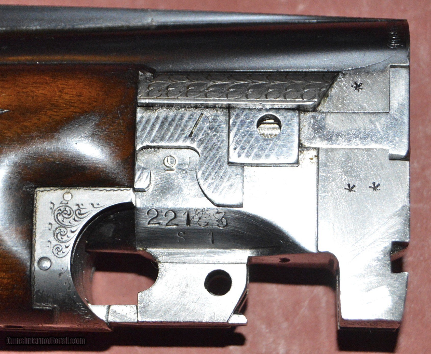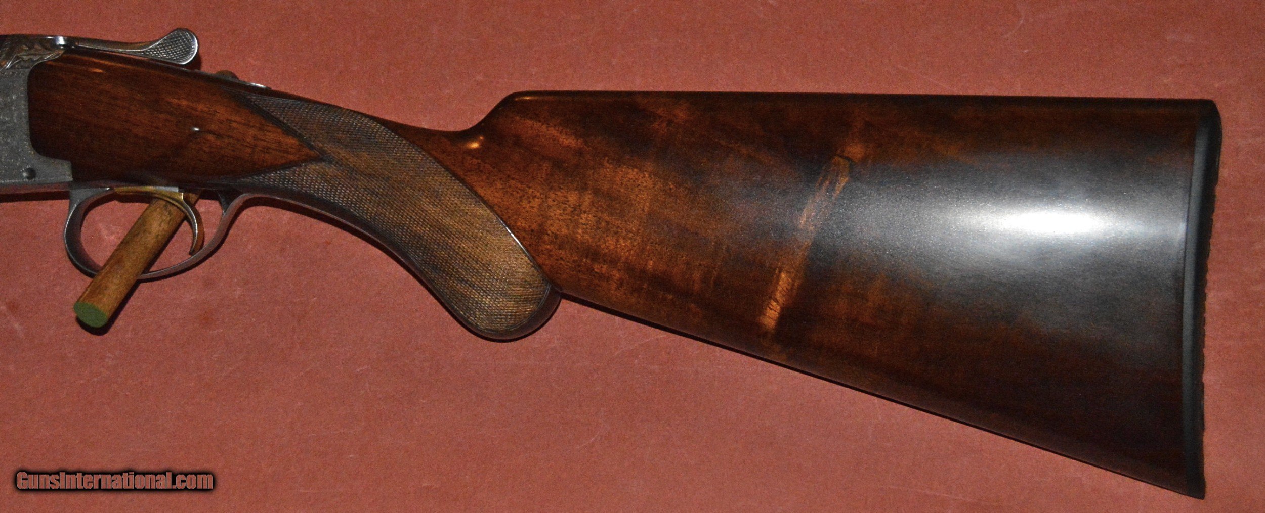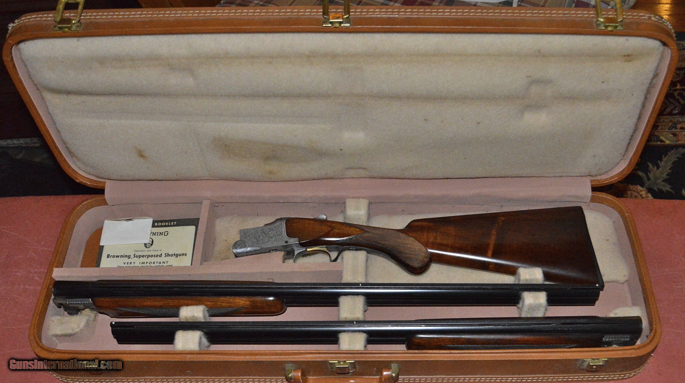 Description: Belgian Browning 20 gauge Pigeon grade Superosed.Built in 1961,this gun has the round knob,long tang stock.Barrel set #1 is vent ribbed 28" long,and choked modified .020" and full .035".Set #2 is vent ribbed,261/2" long,and choked skeet .006" and improved cylinder .012".Both barrels have mint bores and are free of any rust or dents.The gun is in excellent all original condition retaining 98% of the original blue and wood finish.The wood is sound and free of any cracks or damage.The wood is a beautiful dark almost mahogany color and retains the original horn buttplate.The gun is cased in a Browning luggage case.This is a great all purpose set for upland shooting or clays.The gun weighs 6-3 with the 261/2" barrels and 6-5 with the 28" barrels.A graded small bore Superposed at a reasonalble price.C&R eligible. SOLD Curio/Relic: Yes Manufacturer: Browning (FN Belgium) Model: Pigeon Serial Number: 22183 Chambers: 23/4" and 3 Ejectors: yes Metal Condition: excellent Wood Condition: excellent Bore Condition: mint Barrel Type: Browning Special Steel Action: over/under Triggers: single selective Butt Pad: factory buttplate Weight: 6-3 Manufacture Date: 1961 Choke Left: #2 skeet/improved cylinder Choke Right: #1 mod/full Case: Browning luggage |