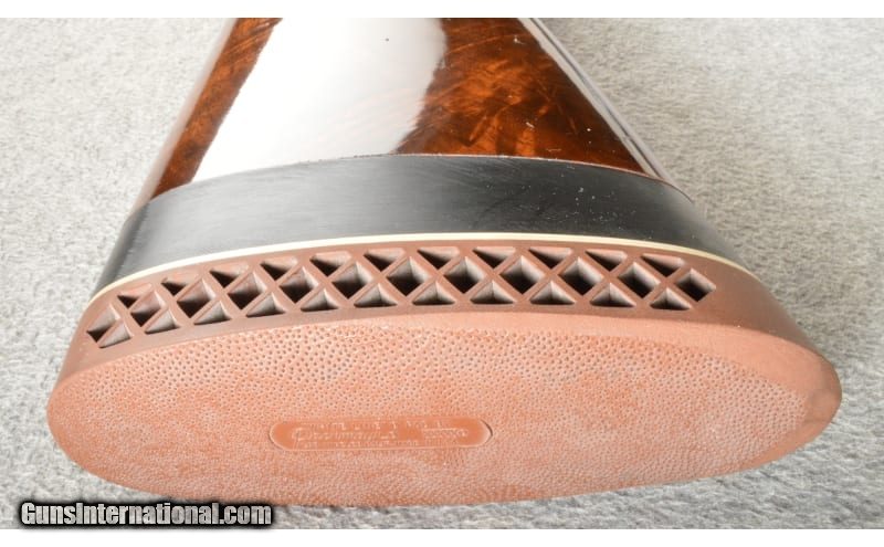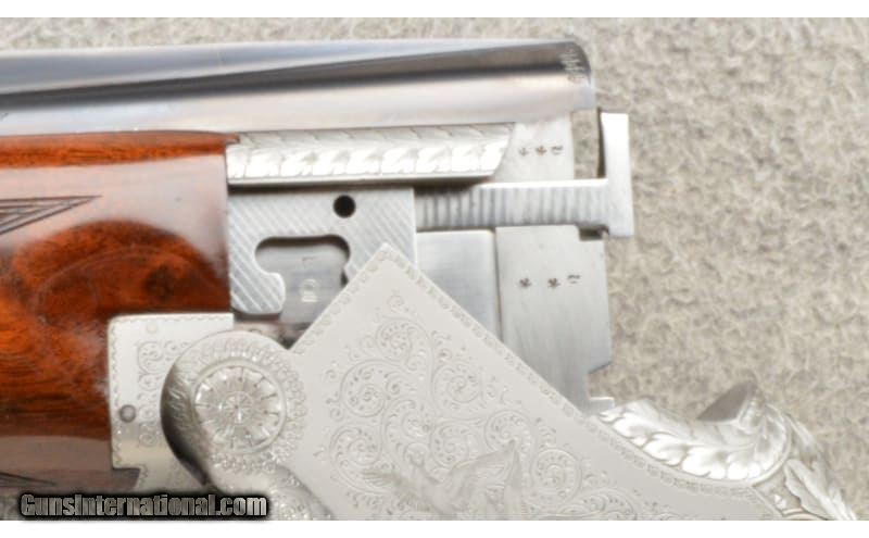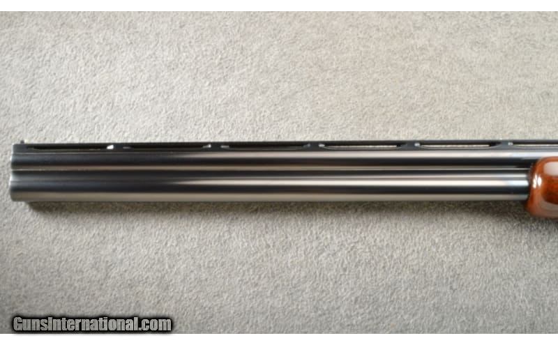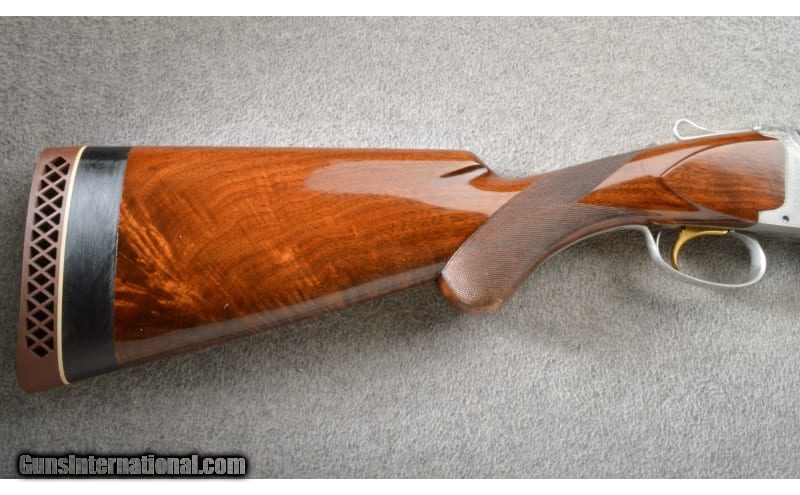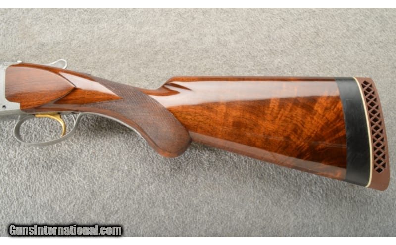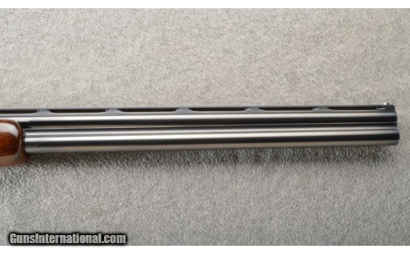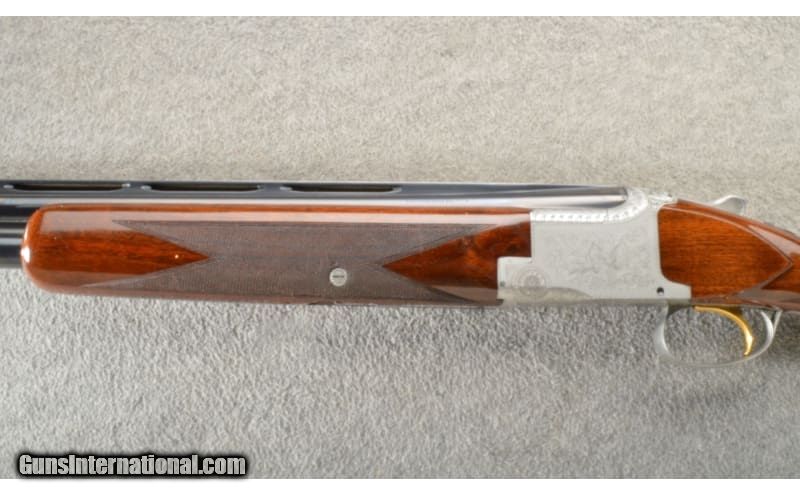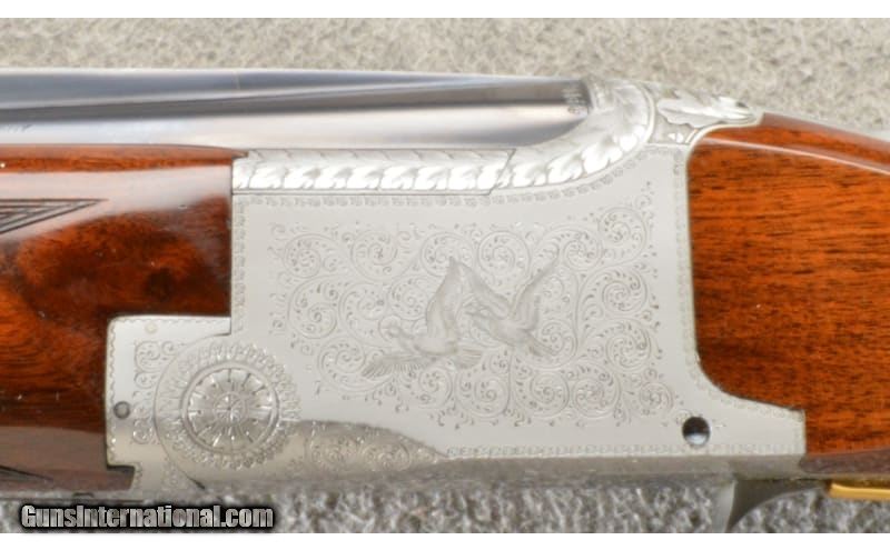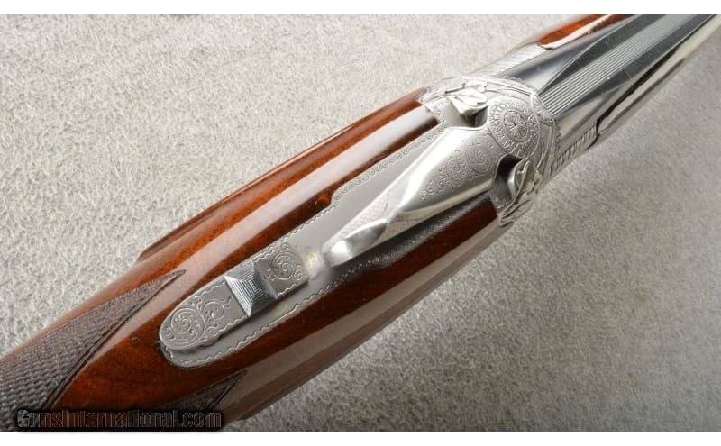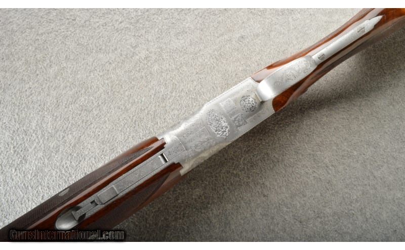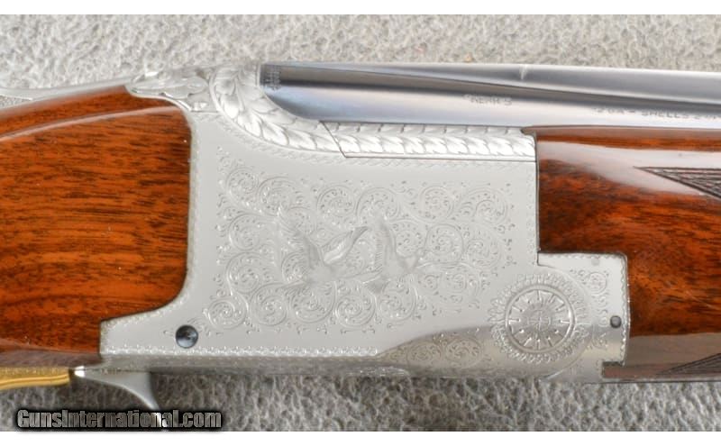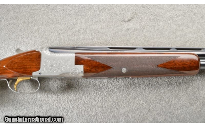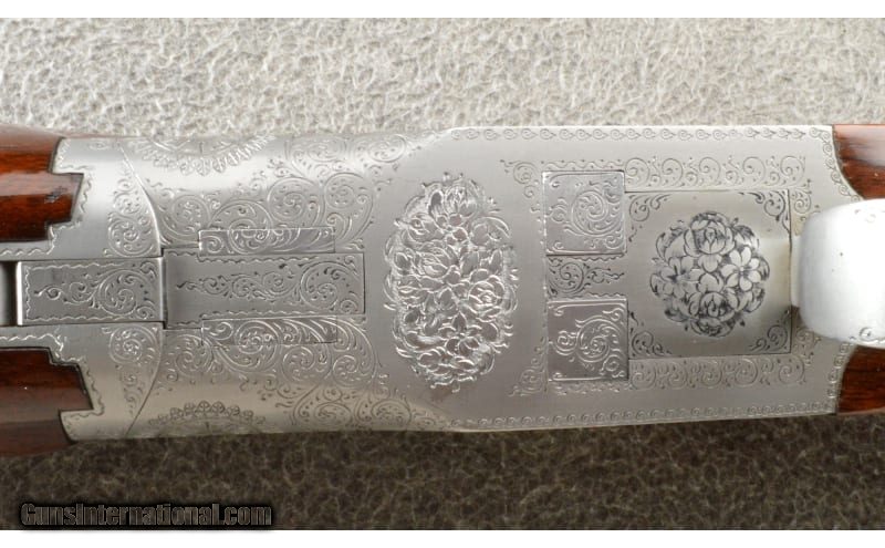 Description: This Browning was manufactured in Belgium in 1964. This gun features a double bead sights on the matte broadway rib, 2 3/4" chambers, choked skeet/skeet with ejectors. The coin finished receiver, trigger guard, break lever are engraved with fine scroll patterns as well as rose bouquets on the sides and bottom of the receiver with two pigeons in flight on each side. There is a leaf design decorating the upper edge of the receiver. Blued 28" barrels with standard markings. Gold washed single trigger, tang mounted safety and barrel selector with gold "O", "U" and "S". The stock is a high gloss checkered forearm with a round knob pistol grip. The rubber recoil pad is vented Pachmayr. The stock dimensions are: drop at comb 1 1/2"; drop at heel 2 3/8"; length of pull 14 1/8". Overall, this gun has some light use age wear but is still in excellent condition. Serial 23717S4. 12 Gauge SOLD Chambers: 2 3/4" chambers. Metal Condition: Minor finish wear on the barrels from the fore end. The engraving and markings are clear and crisp. Wood Condition: "A few scattered light nicks, scuffs. Bore Condition: Bright smooth bores. Barrels: 28" barrels. Triggers: Single. Stock Dimensions: LOP 14 1/8". Fore End: Checkered. Butt Pad: Rubber. Weight: 8 LBS Sights: Bead. Chokes: Fixed. Item Location: Owatonna, MN |