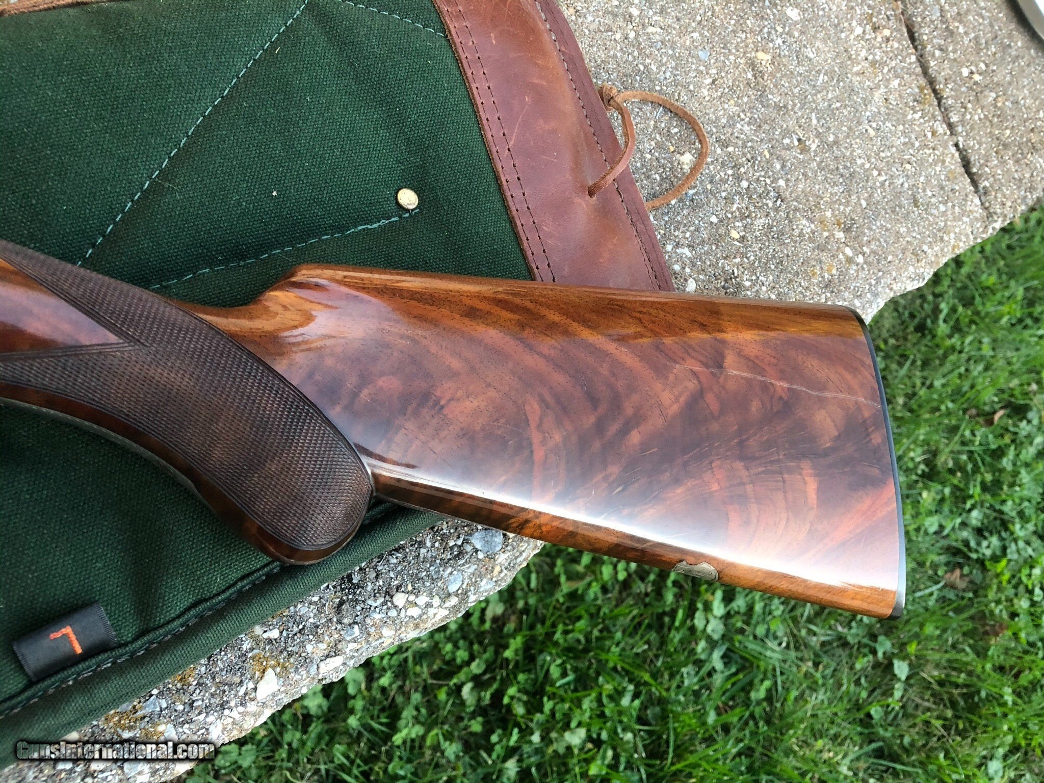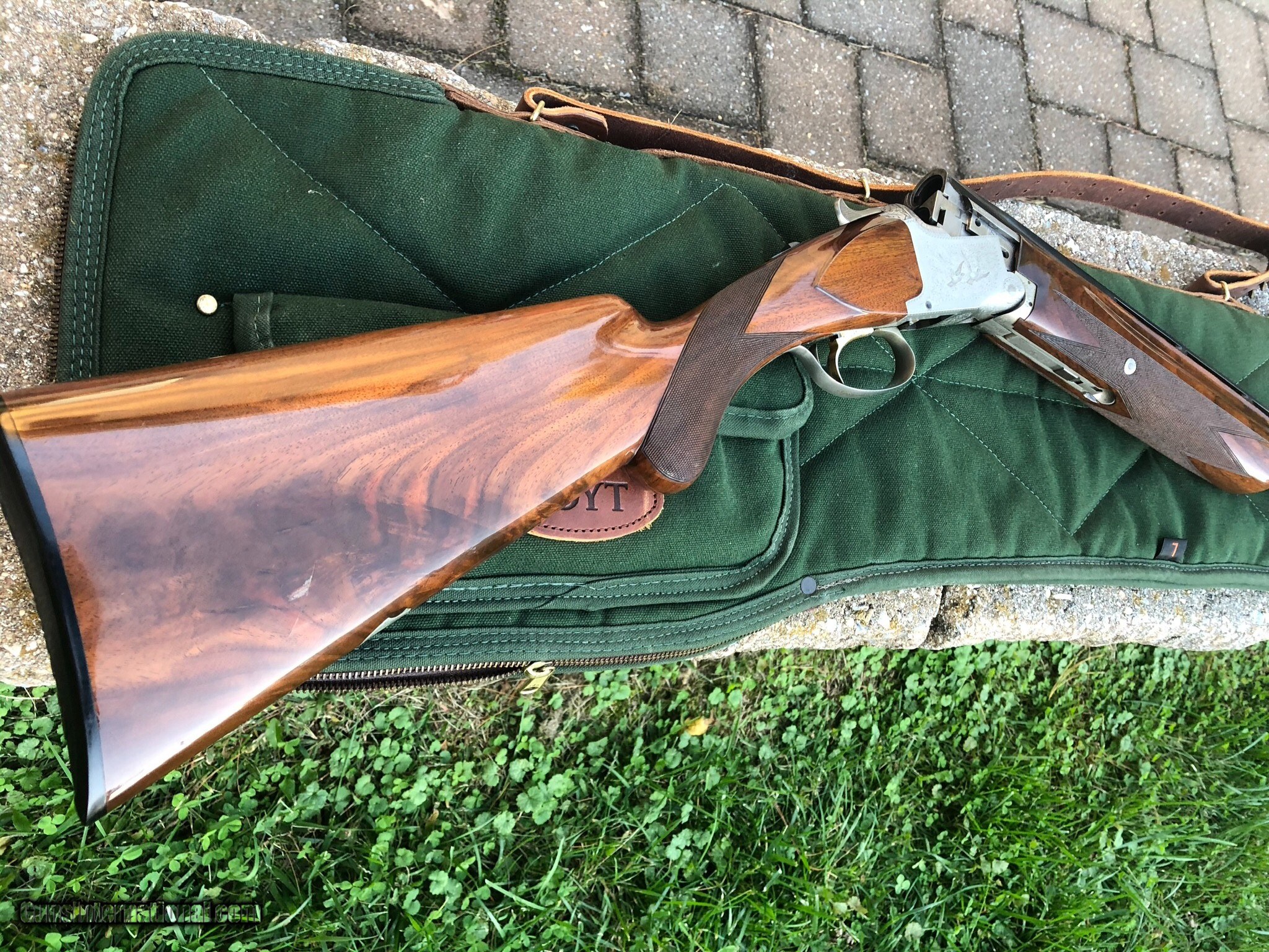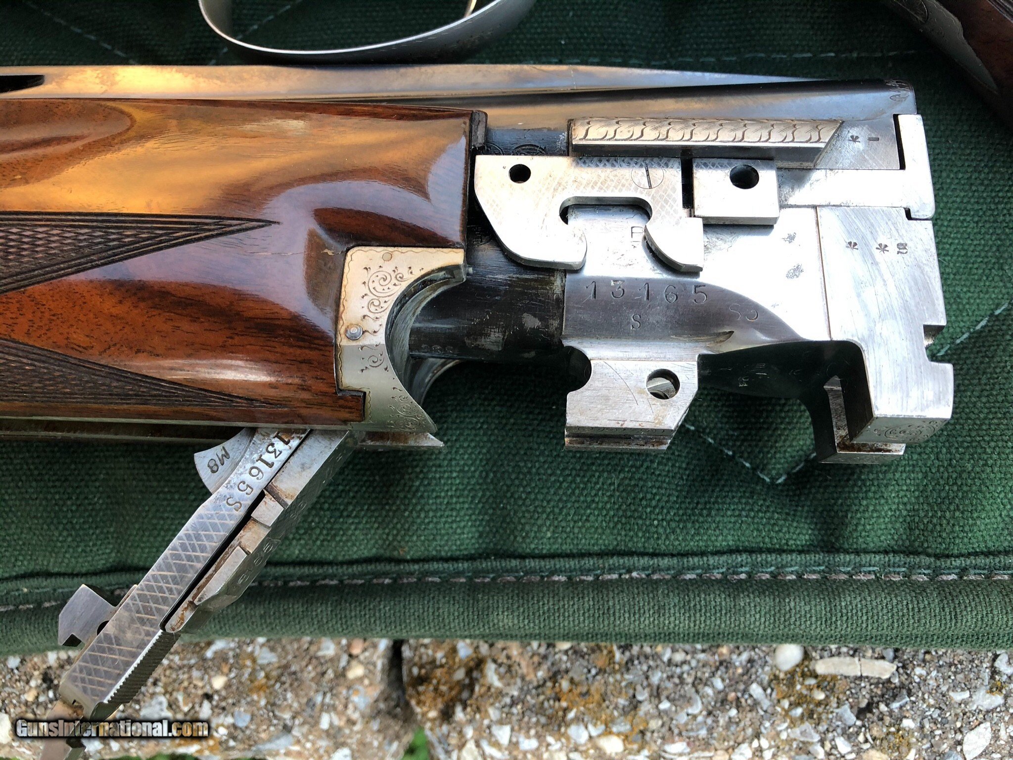 Description: This is a very unusual Belgium Browning Pigeon Grade Superposed 12 bore. It’s got 26 3/8 inch barrels with a Broadway vent rib. The stock is a nicely figured Lightning style with factory buttplate. This is a 1963 vintage long tang gun. The forearm is the fuller target style, seen on trap guns of that era. The chokes are skeet—**s and improved modified *— and the mike at .005 and .032! This gun has excellent bores and mechanics. The blue is 95% and the wood is very nice with some scratches visible. It has the original Browning buttplate. Dimensions are 14 1/4 x 1 3/8 x 2 3/8 inches. It weighs 7 3/4 pounds and shoots very nicely. There is an initial shield in the stock which indicates the original owner was a physician. I contacted the Browning historian, but unfortunately the original invoice is missing. Clearly someone wanted something rather unique when they ordered this Superposed. I’ve used it at skeet and sporting clays and it works quite well. So, if you like and appreciate fine shotguns and want something a bit different, consider this one. You’ll be pleased. Insured Shipping is $65 to the lower 48. Use buy now and I’ll prepay it to your dealer. SOLD |