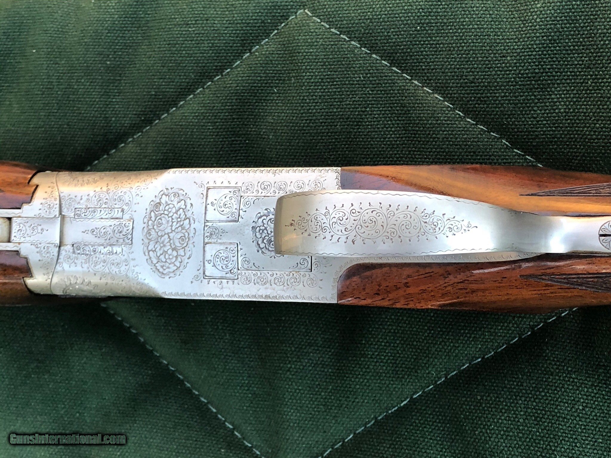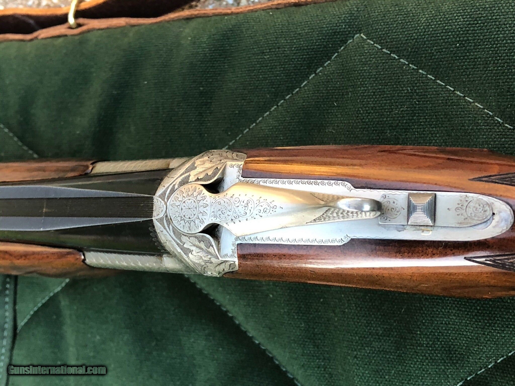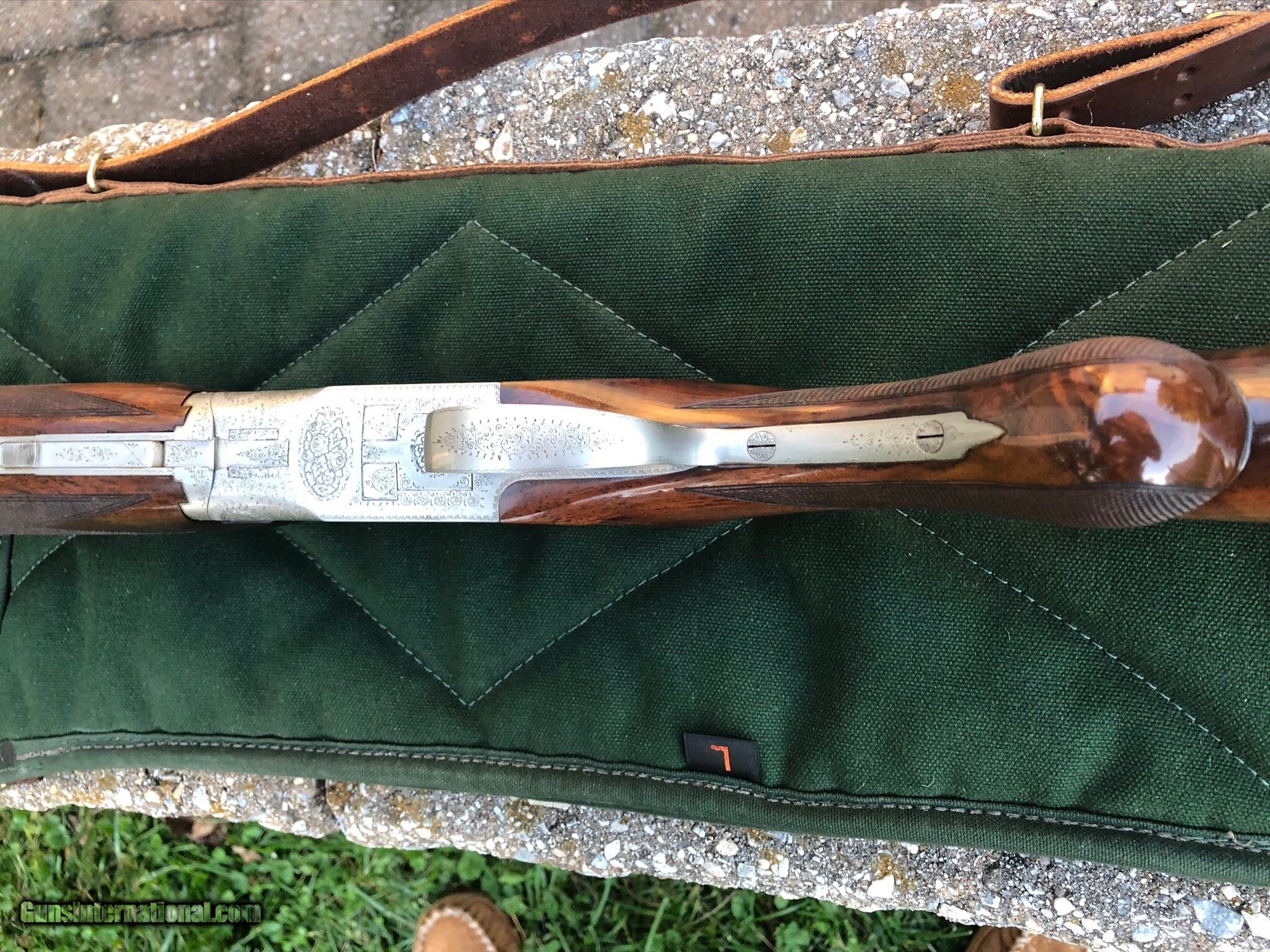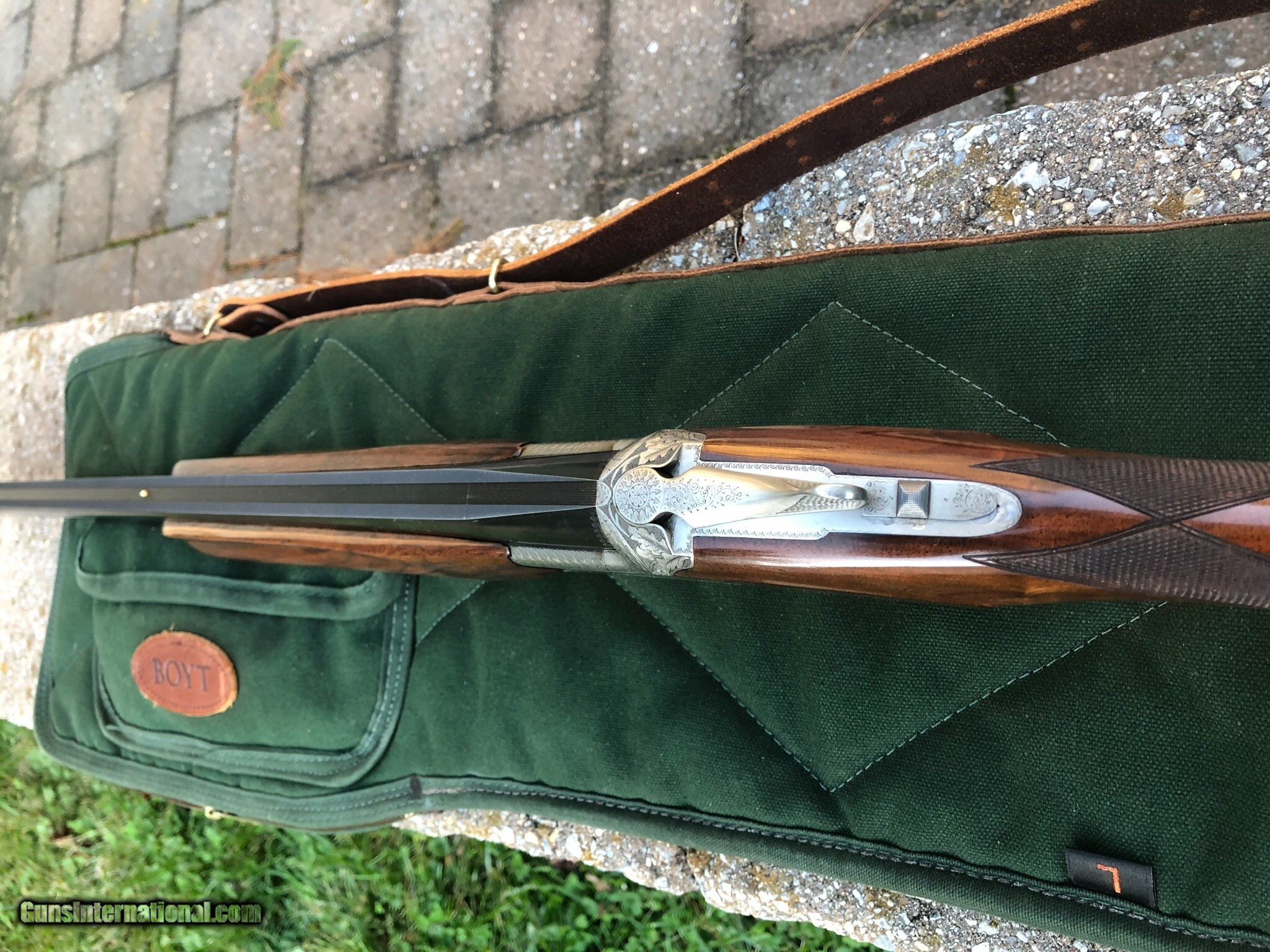 Description: This is a very unusual Belgium Browning Pigeon Grade Superposed 12 bore. It’s got 26 3/8 inch barrels with a Broadway vent rib. The stock is a nicely figured Lightning style with factory buttplate. This is a 1963 vintage long tang gun. The forearm is the fuller target style, seen on trap guns of that era. The chokes are skeet—**s and improved modified *— and the mike at .005 and .032! This gun has excellent bores and mechanics. The blue is 95% and the wood is very nice with some scratches visible. It has the original Browning buttplate. Dimensions are 14 1/4 x 1 3/8 x 2 3/8 inches. It weighs 7 3/4 pounds and shoots very nicely. There is an initial shield in the stock which indicates the original owner was a physician. I contacted the Browning historian, but unfortunately the original invoice is missing. Clearly someone wanted something rather unique when they ordered this Superposed. I’ve used it at skeet and sporting clays and it works quite well. So, if you like and appreciate fine shotguns and want something a bit different, consider this one. You’ll be pleased. Insured Shipping is $65 to the lower 48. Use buy now and I’ll prepay it to your dealer. SOLD |