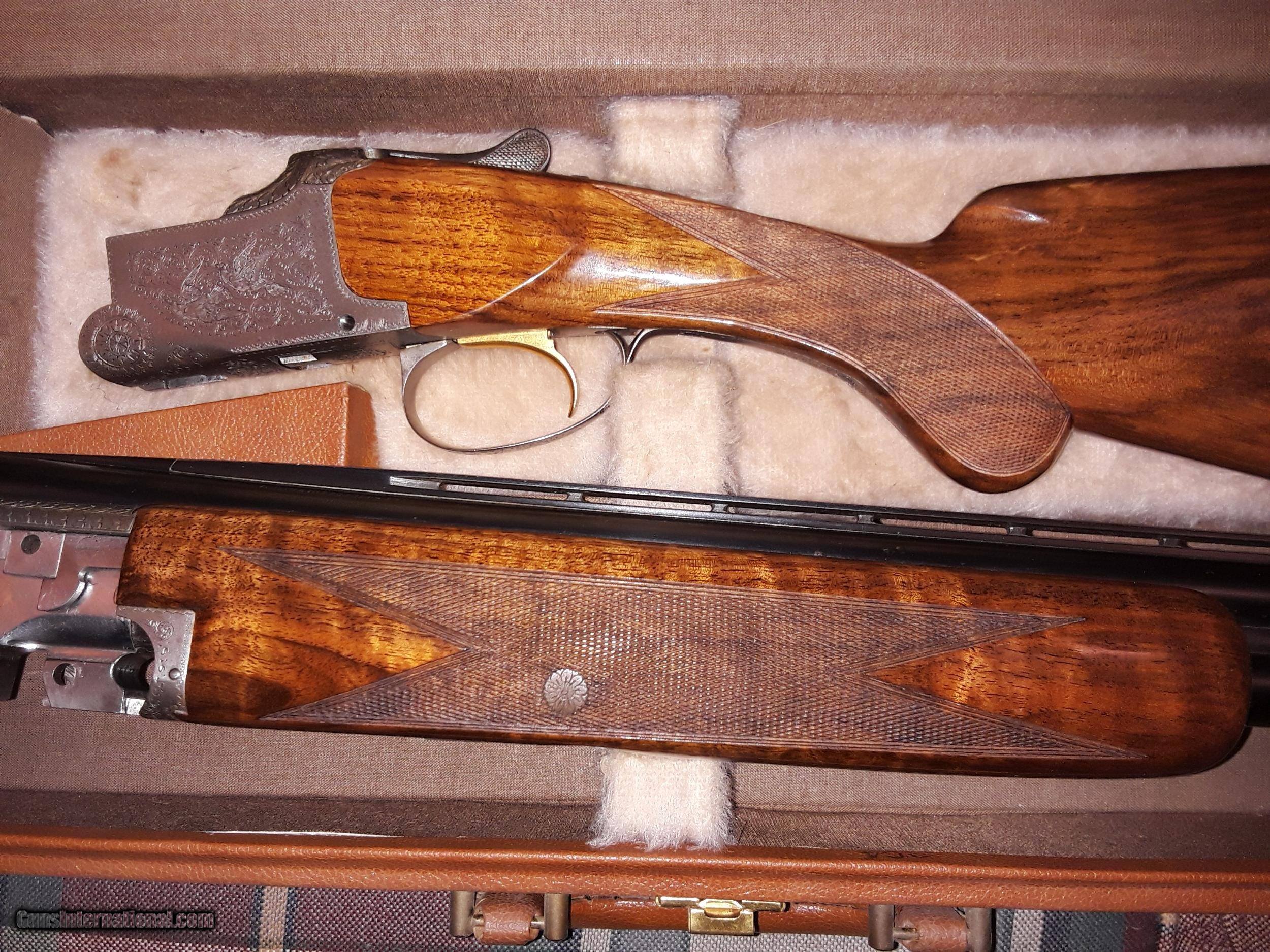 Description: Sad to see it go but someone will enjoy it more. Superposed 20 ga 28" pigeon grade made in 58-59 28" full over mod chokes. Slight blue wear on barrel ends slight grey wear on receiver from carry. Wood has been refinished by Browning because no one likes an ugly gun. Aside from the refinished wood it's 100% original. Unsigned.I'm including a later 60's era Airways case to pprotect it during shipping. Clean case with key and hang tag. SOLD |