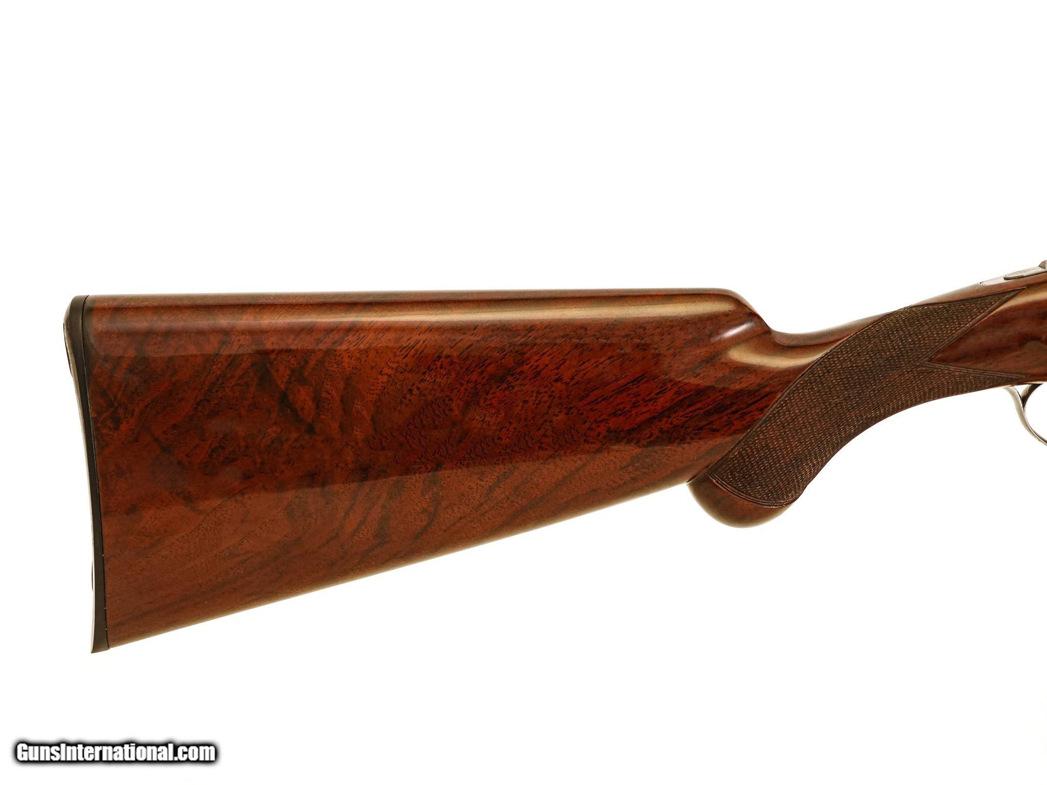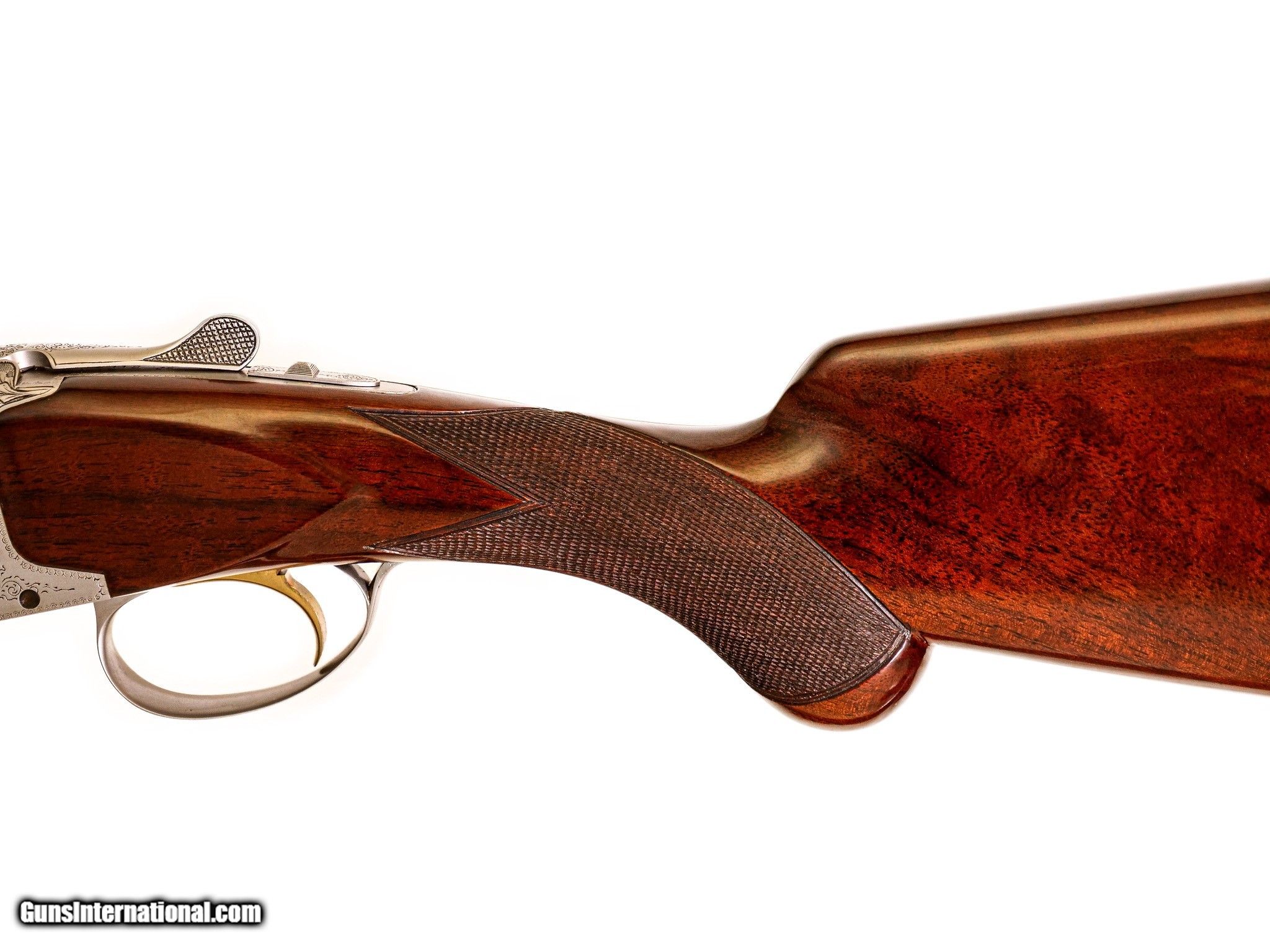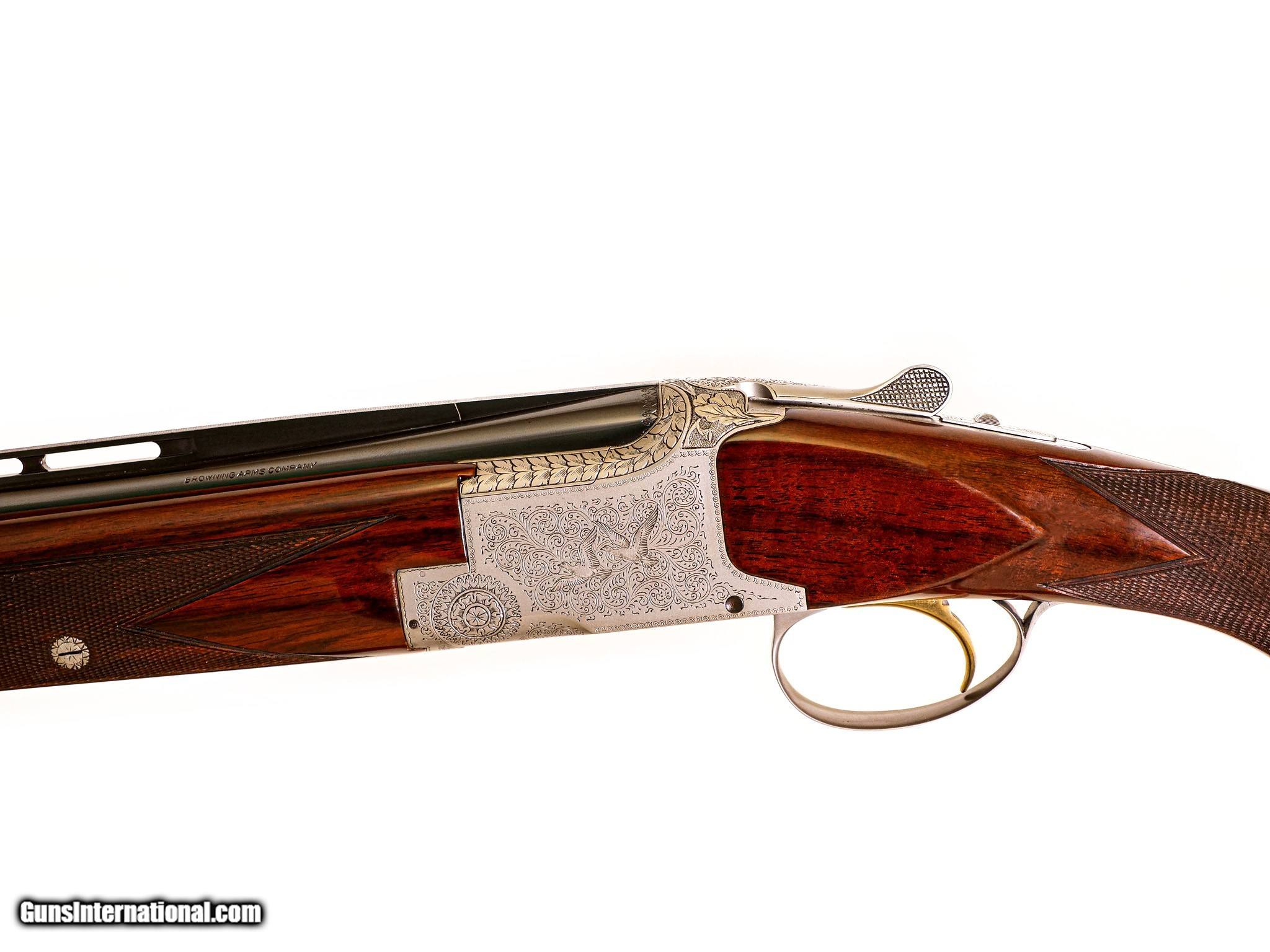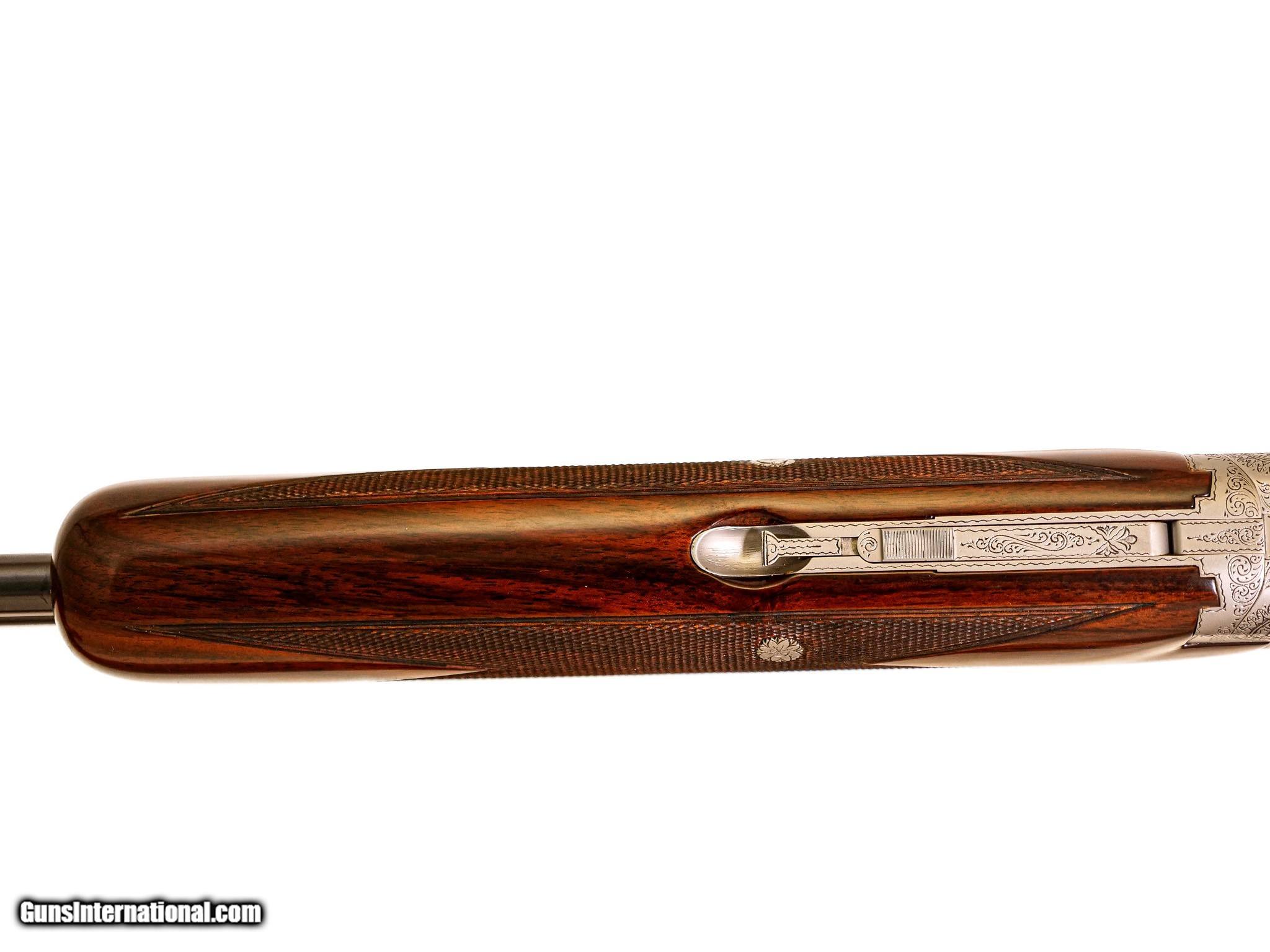 Description: Browning - Pigeon Grade, .410ga. 26" Barrels Choked SK/SK. 1968 Belgian round knob short tang, Browning butt plate, gold single selective trigger, automatic ejectors, nicely figured stock, field forend, gun is in 99%+ perfect and as-new condition, appears unfired, obtained from a private collector, great example of a perfect collector grade small bore Browning. Inv: 52186 6 lbs. 10 oz. 14 ¼” x 1 ½” x 2 3/8” $12,500.00 SOLD |