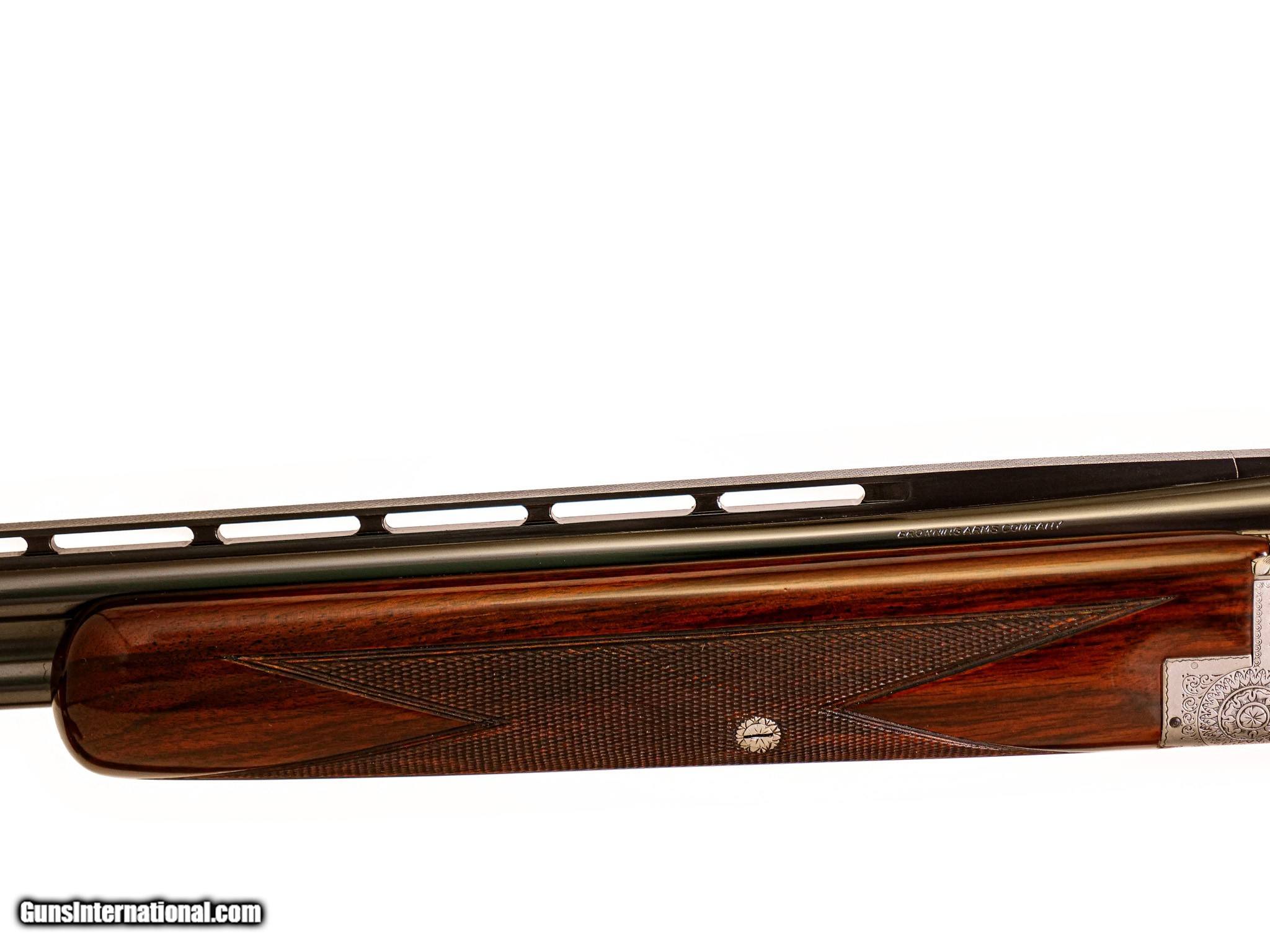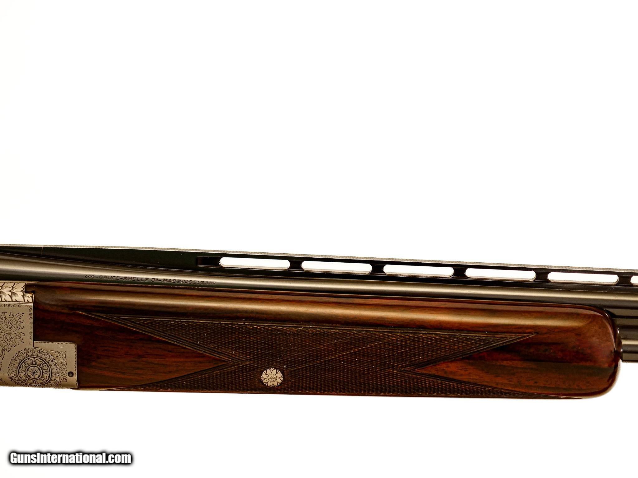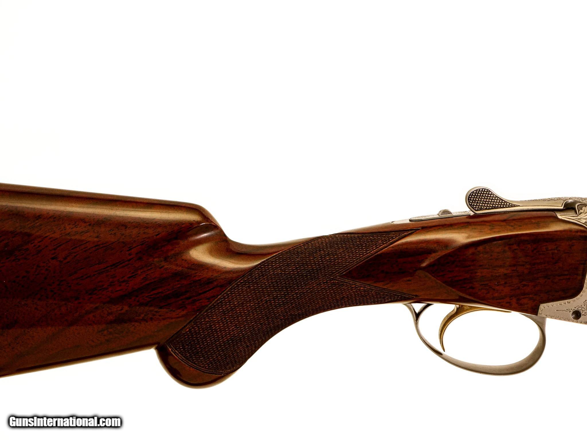Description: Browning - Pigeon Grade, .410ga. 26" Barrels Choked SK/SK. 1968 Belgian round knob short tang, Browning butt plate, gold single selective trigger, automatic ejectors, nicely figured stock, field forend, gun is in 99%+ perfect and as-new condition, appears unfired, obtained from a private collector, great example of a perfect collector grade small bore Browning. Inv: 52186 6 lbs. 10 oz. 14 ¼” x 1 ½” x 2 3/8” $12,500.00 SOLD |