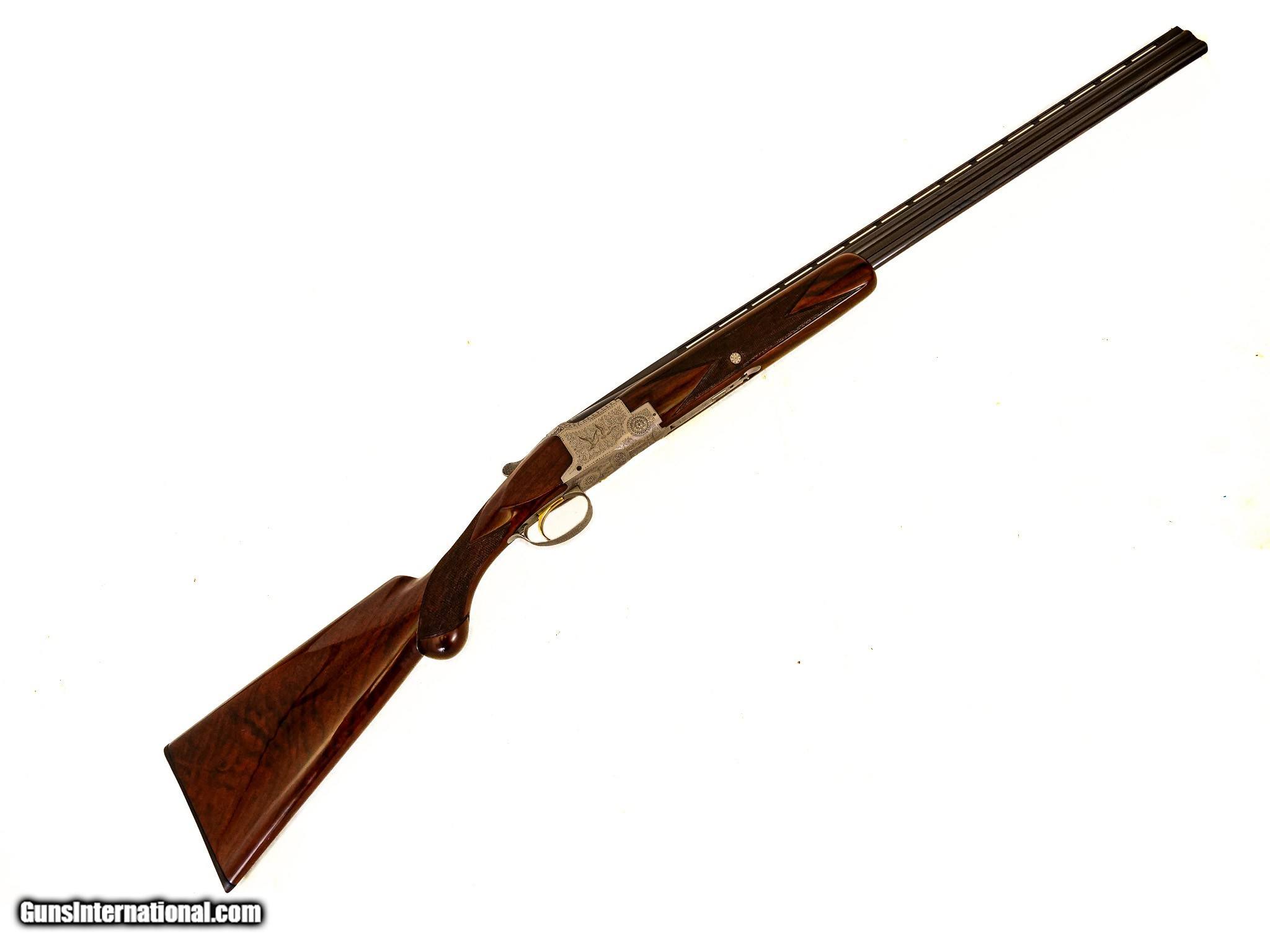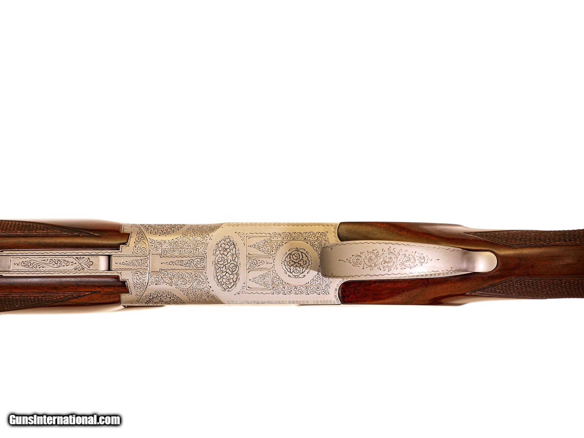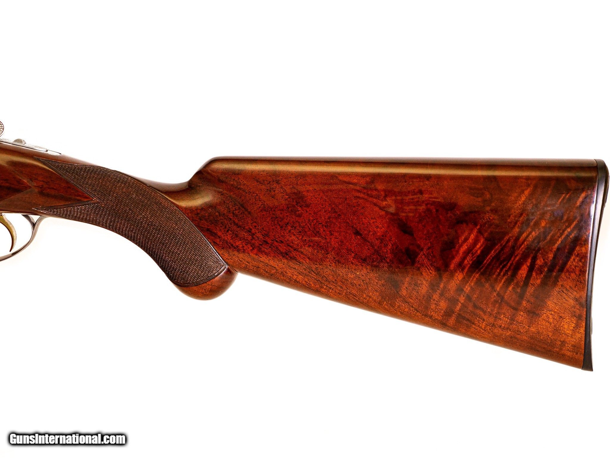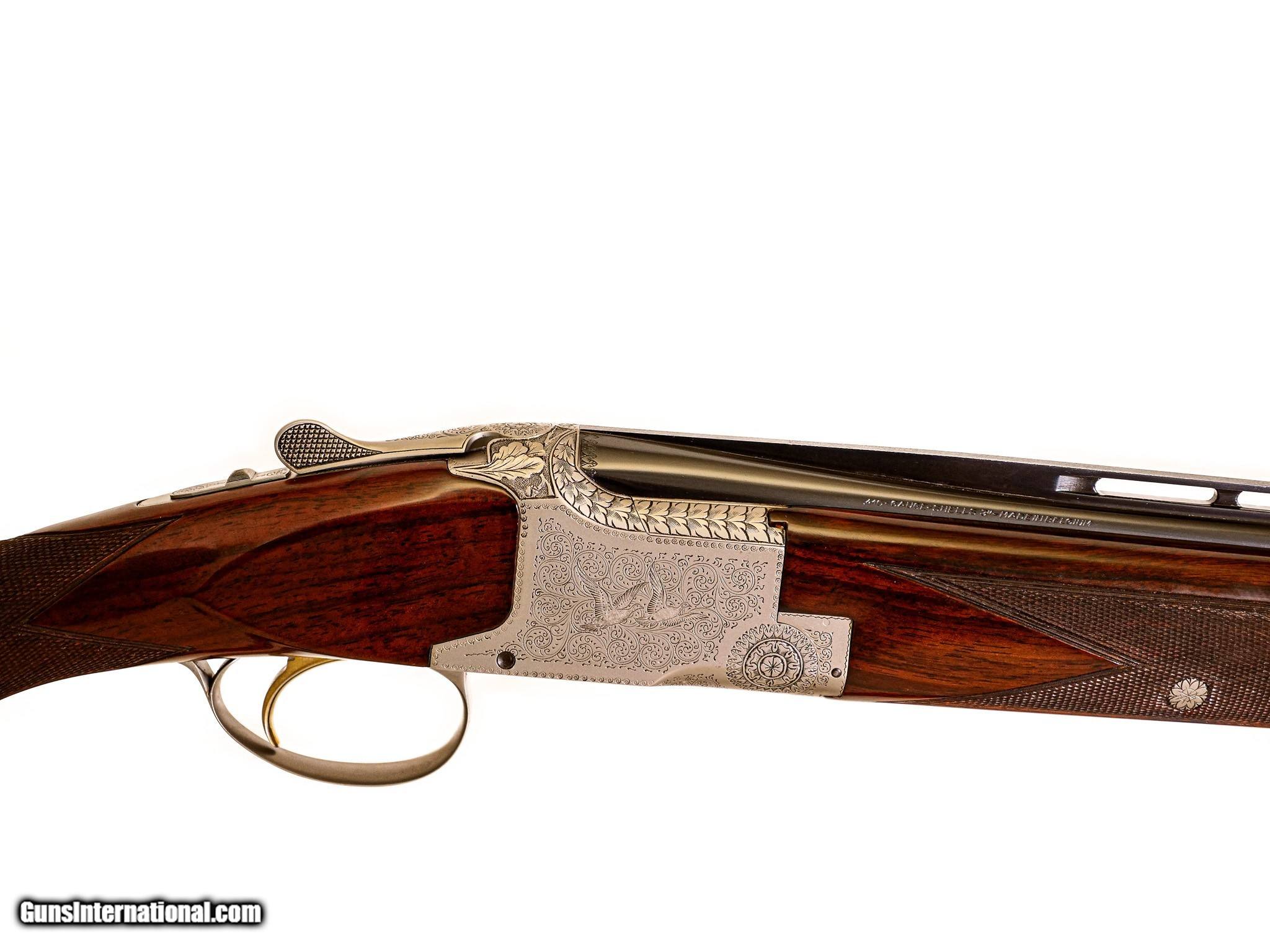 Description: Browning - Pigeon Grade, .410ga. 26" Barrels Choked SK/SK. 1968 Belgian round knob short tang, Browning butt plate, gold single selective trigger, automatic ejectors, nicely figured stock, field forend, gun is in 99%+ perfect and as-new condition, appears unfired, obtained from a private collector, great example of a perfect collector grade small bore Browning. Inv: 52186 6 lbs. 10 oz. 14 ¼” x 1 ½” x 2 3/8” $12,500.00 SOLD |