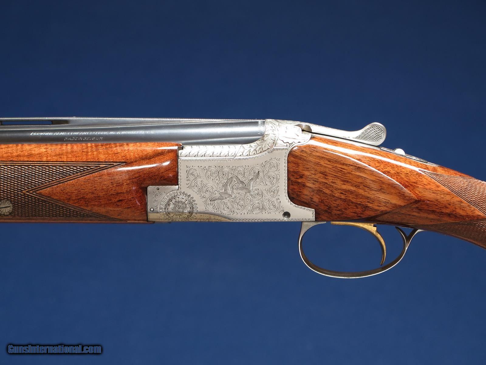 Description: Browning Superposed Pigeon grade 20ga 2 BBL set. 1965 mfg long tang, round knob. 26 in IC & Mod + was 28 in but barrels cut to 25 1/4 in cyl & cyl. 14 3/8 LOP butt plate. 96-97% in luggage case. SOLD |