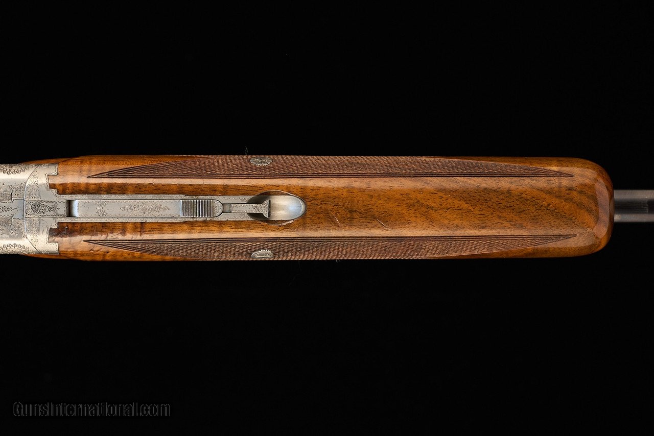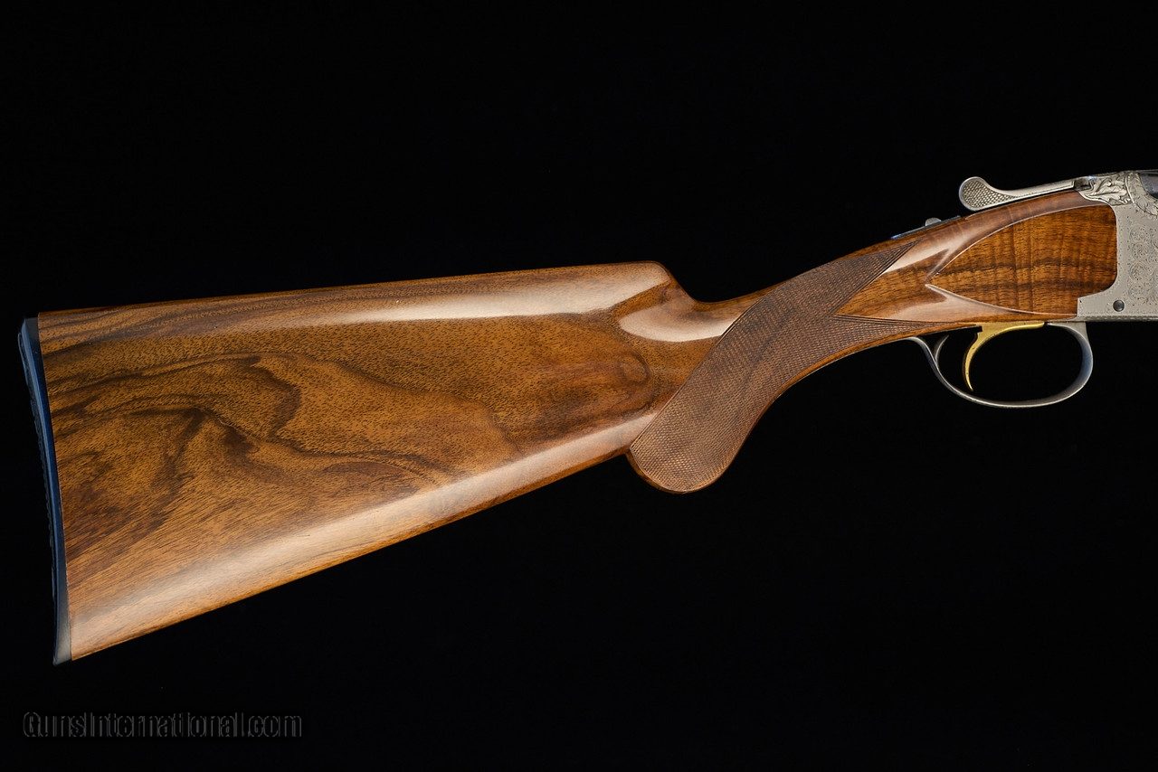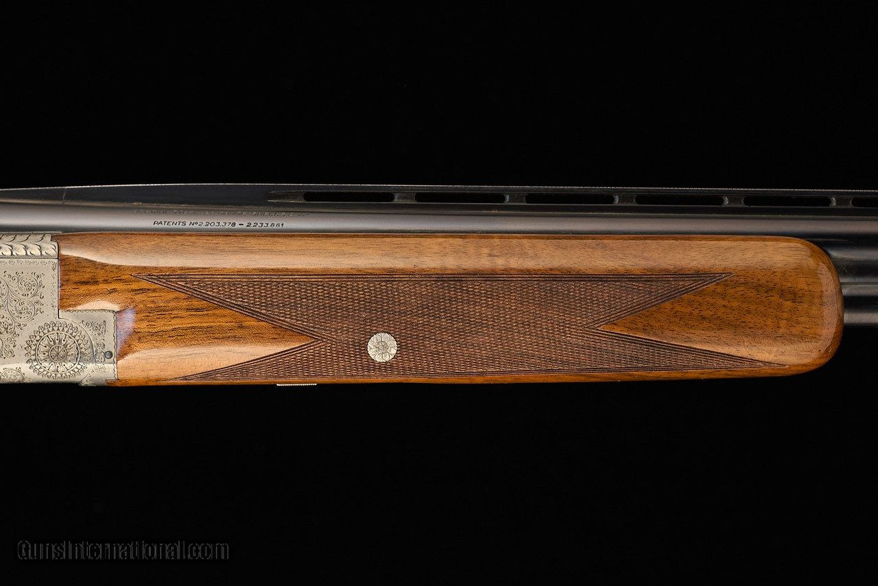 Round knob long tang (RKLT) stock, single selective inertia trigger, non-auto safety, ejectors, matted vent rib, large front bead, gold trigger, and Pigeon grade checkering on a well figured walnut stock. Belgian proofed 1965 gun with 2 ¾” chambers.