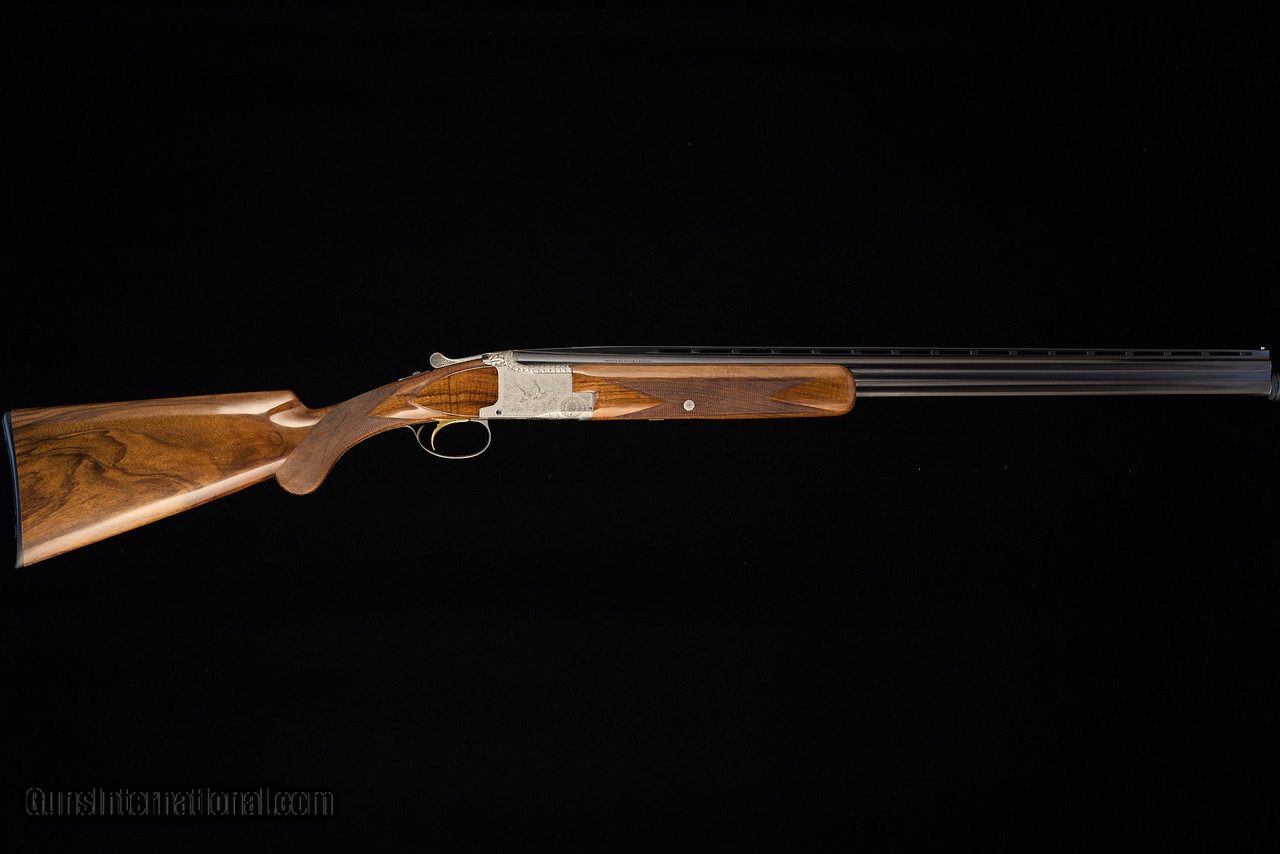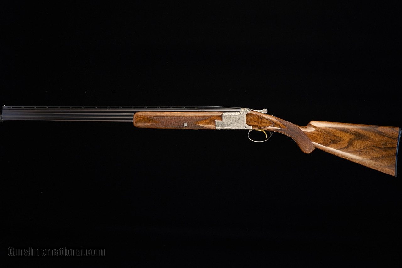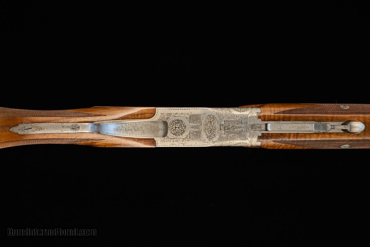 Round knob long tang (RKLT) stock, single selective inertia trigger, non-auto safety, ejectors, matted vent rib, large front bead, gold trigger, and Pigeon grade checkering on a well figured walnut stock. Belgian proofed 1965 gun with 2 ¾” chambers.