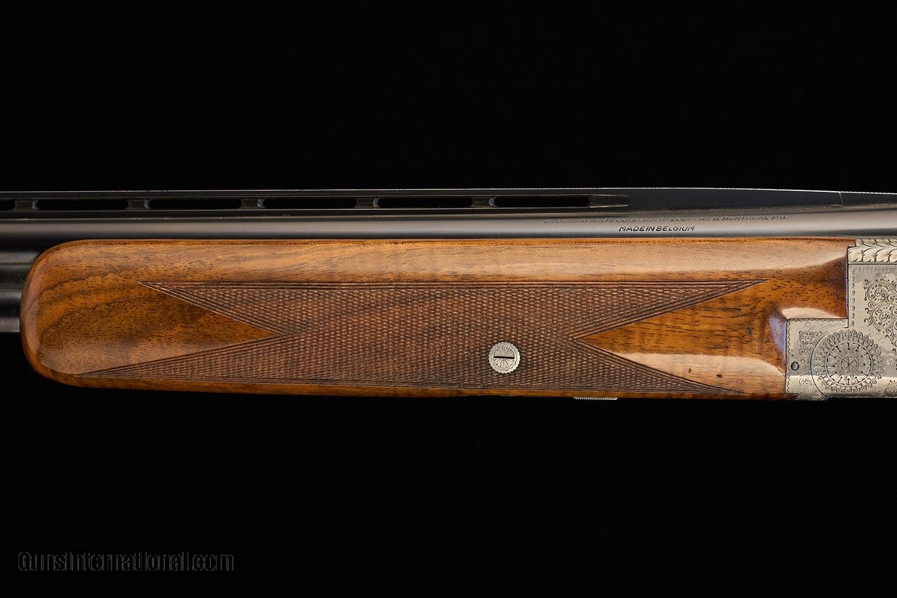 Browning’s Pigeon grade engraving adorns the gun. Both the action and furniture are finished in French grey. The gun is in excellent overall condition. The stock and forend in excellent condition with some scratches and compression marks consistent with light field use. Checkering remains crisp and clean. The bores are mirror-like and pristine. Excellent bluing on barrels with very minor loss ahead of the forend from taking apart the gun. Muzzles beginning to silver due to use of a slip. The gun is on face with top lever right of center. The ejectors are in time.
