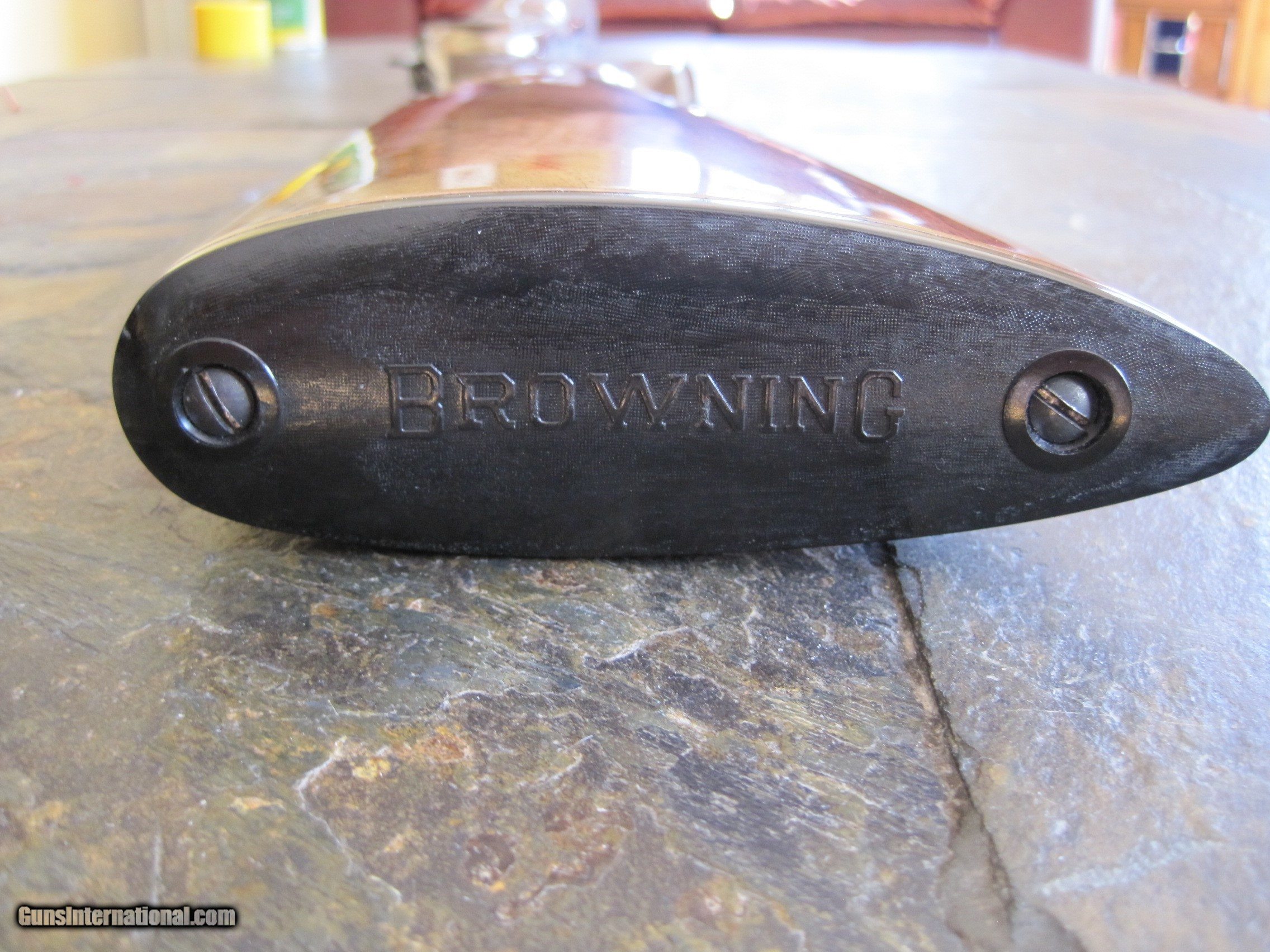 Description: Browning Superposed Pigeon Grade, 28 gauge. Manufactured in approx 1969/1970. Chokes are skeet, vent rib barrel is 26.5". Gold plated single selective trigger. Features a silver grey receiver with 2 smaller pigeons surrounded by fine scroll engraving on each side of the frame; the receiver bottom and tangs also exhibit fine scroll work. Beautiful high grade walnut. Original Browning butt plate. This gun is as new in the original box, the box is numbered to the gun. Includes the original owners manual. This Browning has been sent to Browning for salt inspection, clean up and refurbish as it did initially indicate some salt exposure. Documentation is available from Browning regarding the clean-up. It is now 100 per cent and a beautiful hard to find original 28 gauge pigeon grade in the original box from 50 years ago. Must ship to an FFL. SOLD |