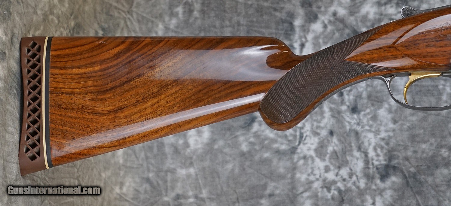 Description: Pre-Owned Browning Superposed Pigeon Grade Field 12GA with 30" fixed choke (IM/F) barrels, narrow game rib. French gray finished action Pigeon Grade featuring game scenes and scrolls, re-finished (signs of corrosion and wear covered by new finish, signs of restored rust damage, re-finish has covered engravers' signature and it is now it is not legible). Barrels have been re-blued, shows new bluing wear and signs of restoration. Factory round knob, long-tang pistol grip stock-refinished with handling marks and minor checkering wear. Manufactured in 1951-pre Salt gun. Does not include case. SOLD Shotgun Gauge: 12 Gauge |