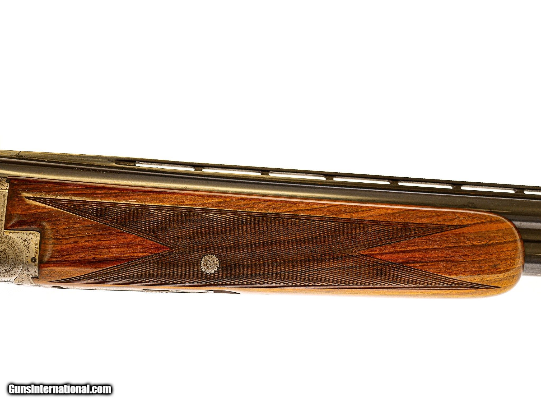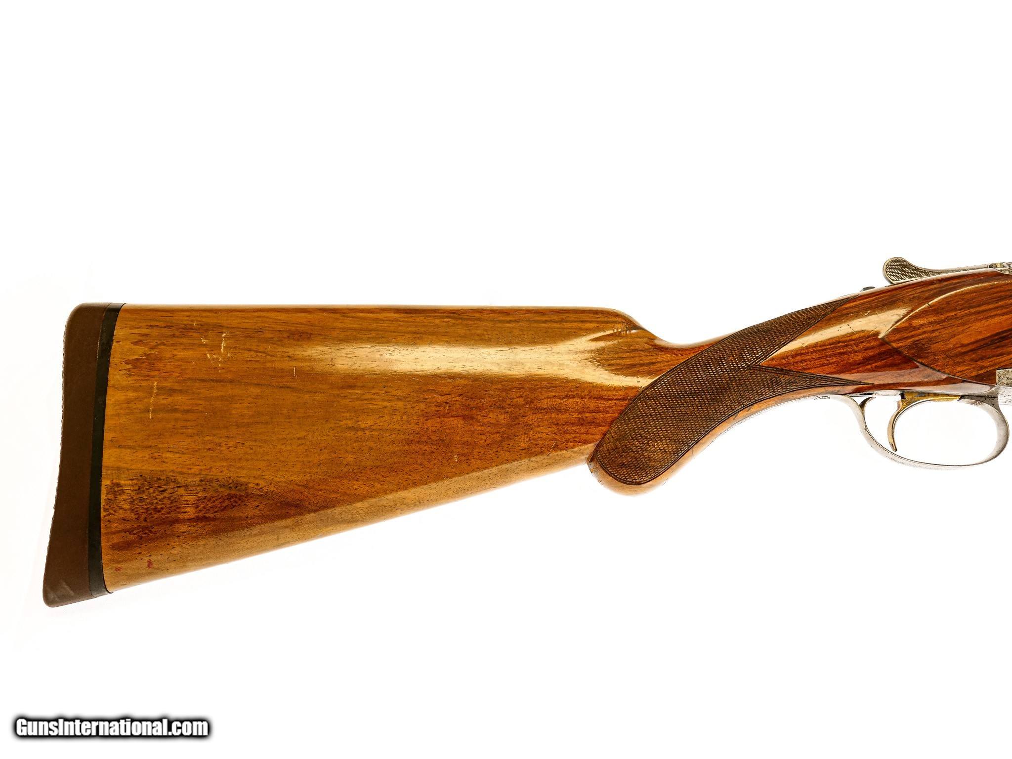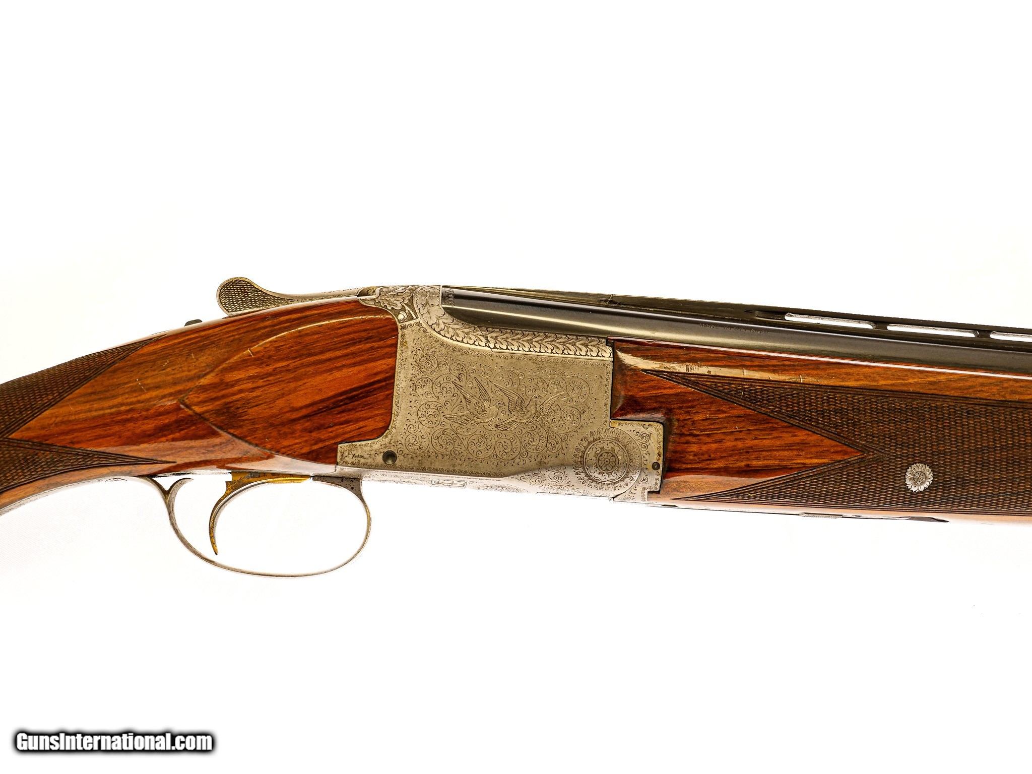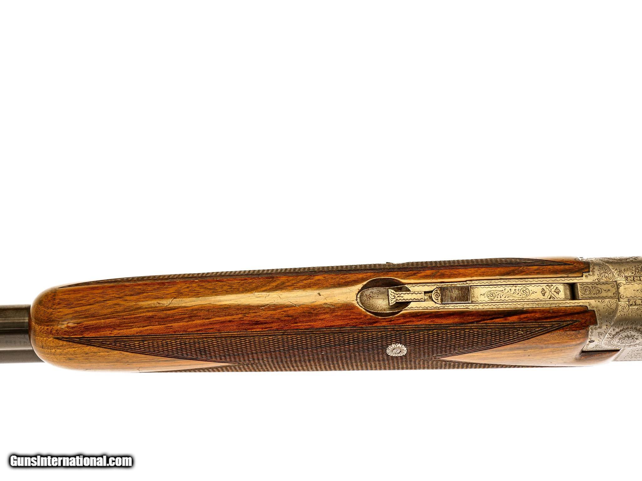 Description: Browning - Superposed Pigeon Grade, Made In Belgium, 12ga. 28" Barrels Choked IC/F. 28" Barrels Choked IC/Full, round knob long tang, ¾” pad, field forend, gold single selective trigger, field forend, ventilated rib, automatic ejectors, double signed Funken engraved gun, 1954 manufacture, normal wear, light handling marks in wood, minor wear on receiver from carrying, 90% barrel bluing, clean and still very tight gun, available for immediate delivery. Inv: 52070 7 lbs. 12 oz. 14 ½” x 1 ½” x 2 ¼” $3,250.00 SOLD |