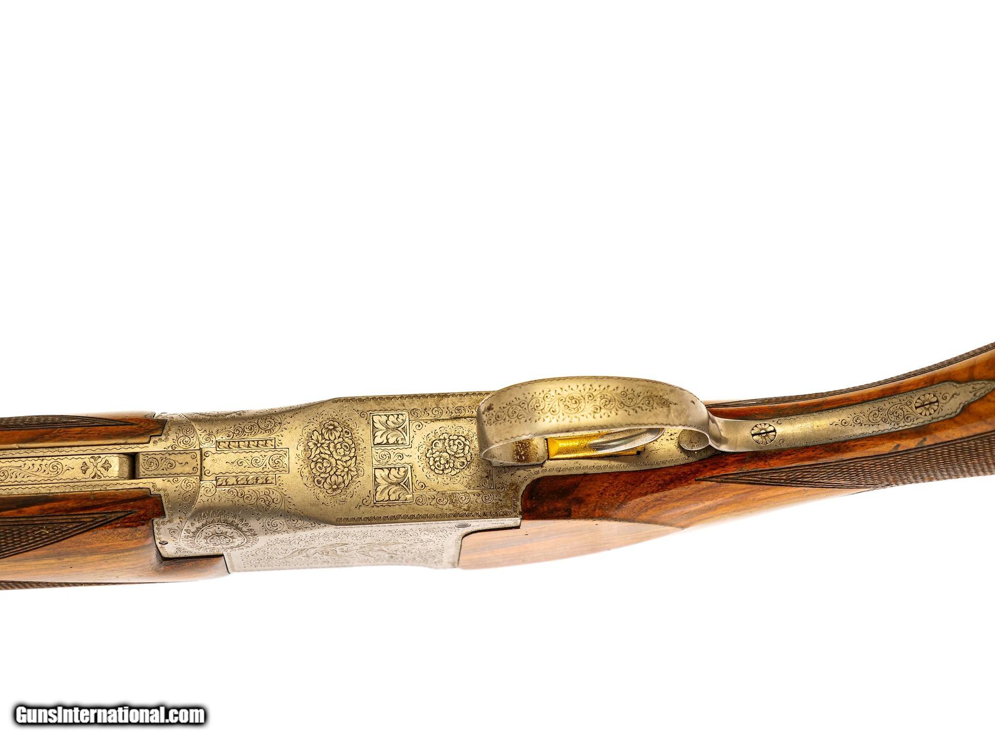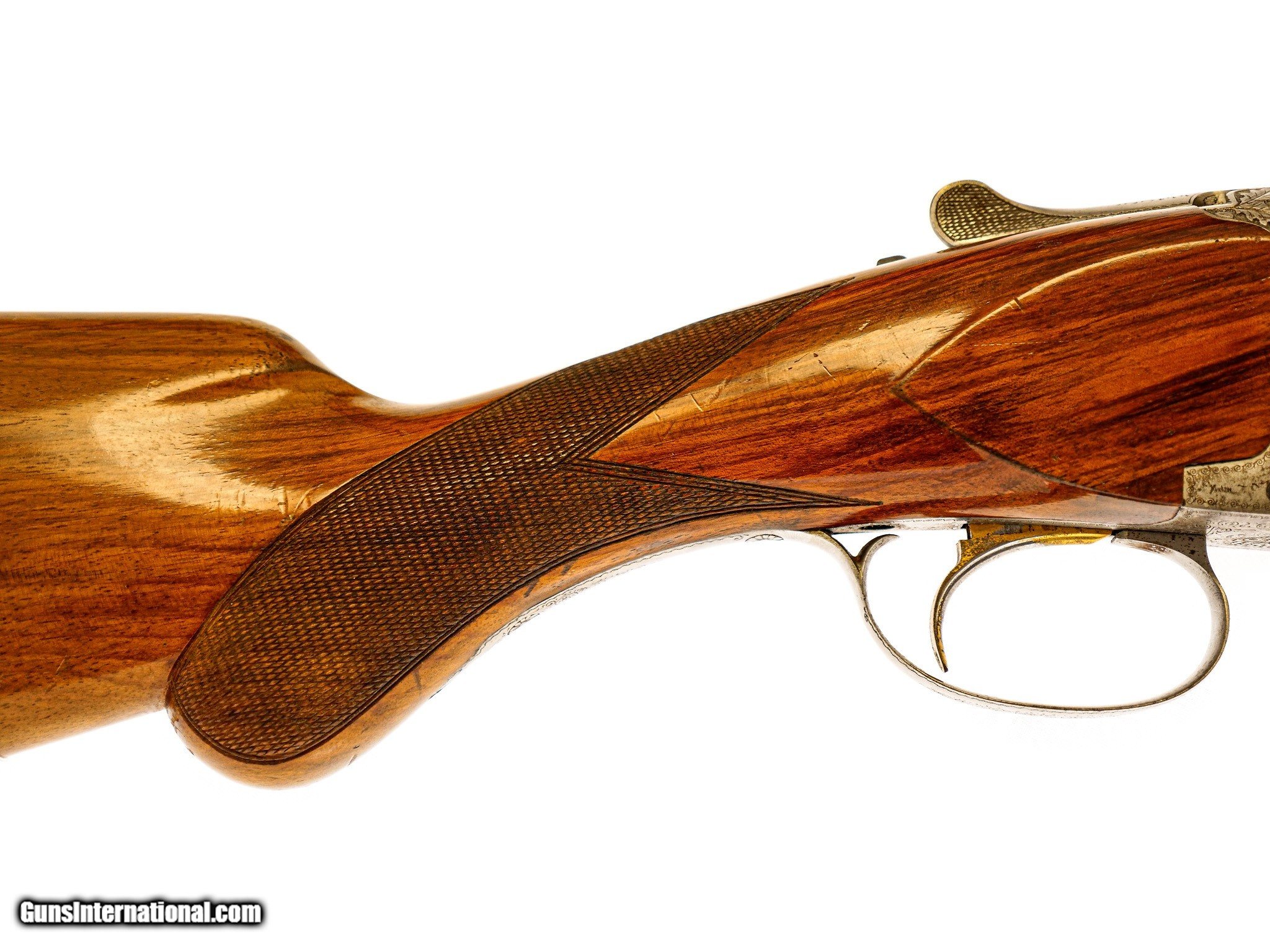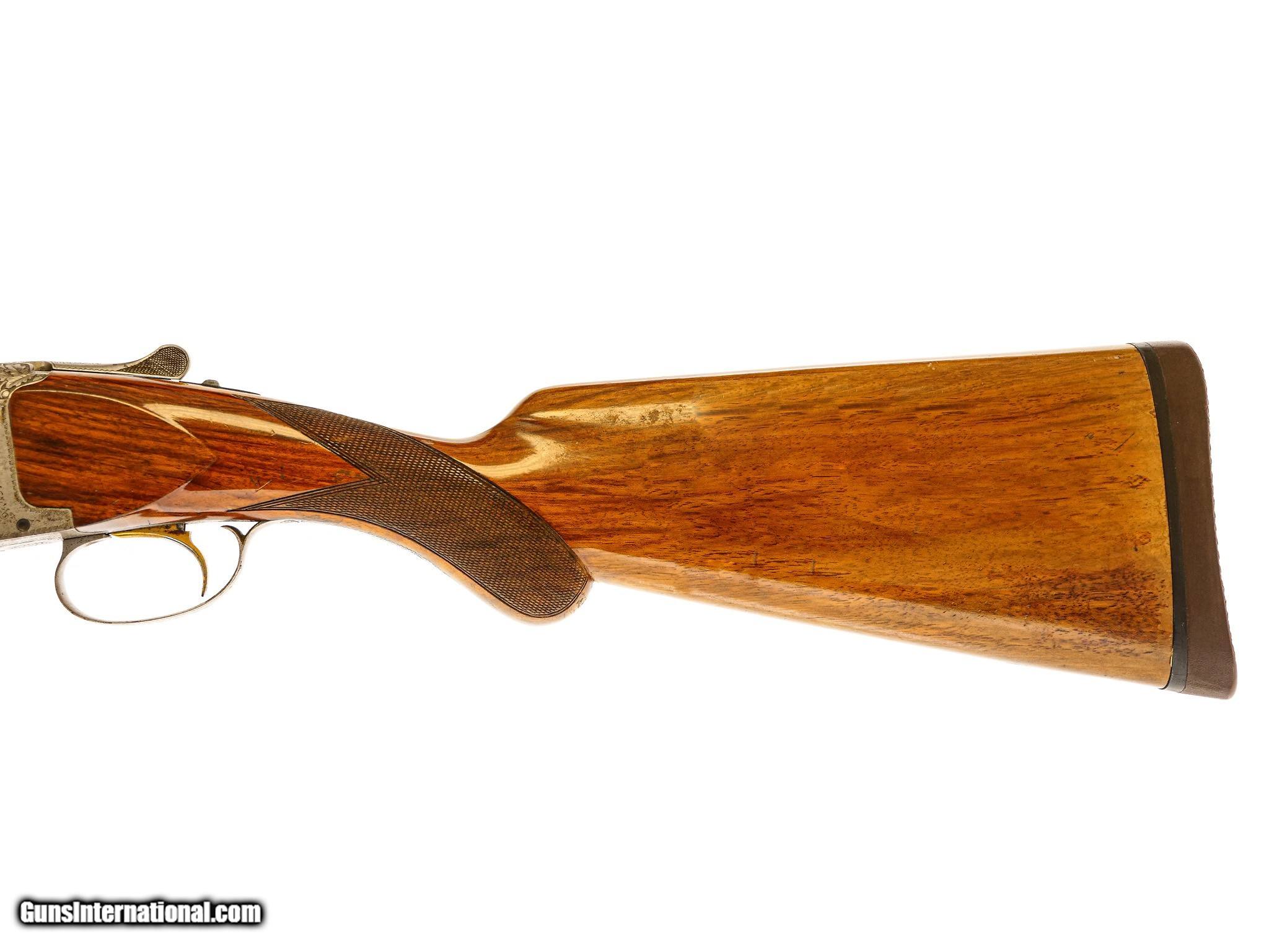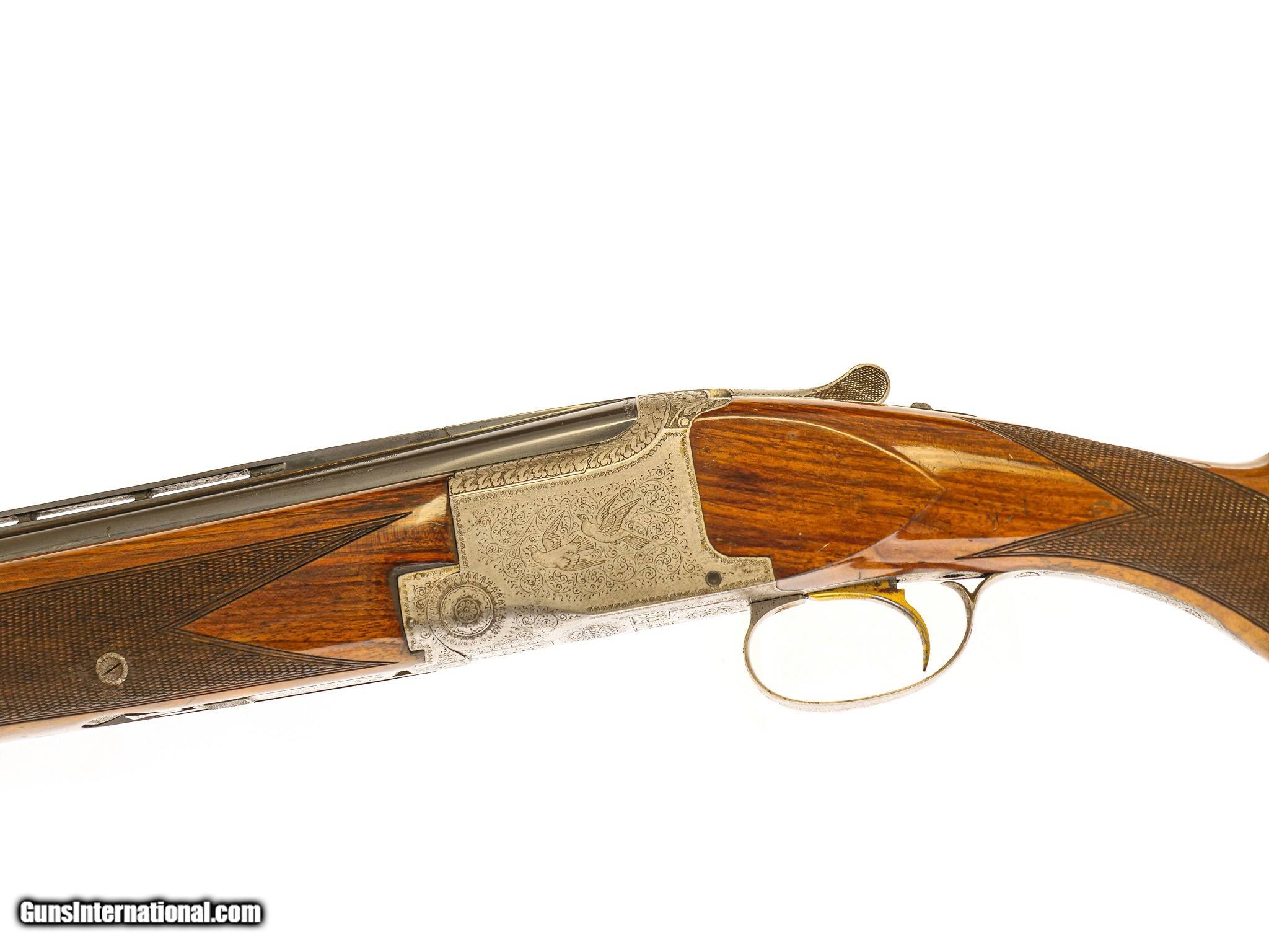 Description: Browning - Superposed Pigeon Grade, Made In Belgium, 12ga. 28" Barrels Choked IC/F. 28" Barrels Choked IC/Full, round knob long tang, ¾” pad, field forend, gold single selective trigger, field forend, ventilated rib, automatic ejectors, double signed Funken engraved gun, 1954 manufacture, normal wear, light handling marks in wood, minor wear on receiver from carrying, 90% barrel bluing, clean and still very tight gun, available for immediate delivery. Inv: 52070 7 lbs. 12 oz. 14 ½” x 1 ½” x 2 ¼” $3,250.00 SOLD |