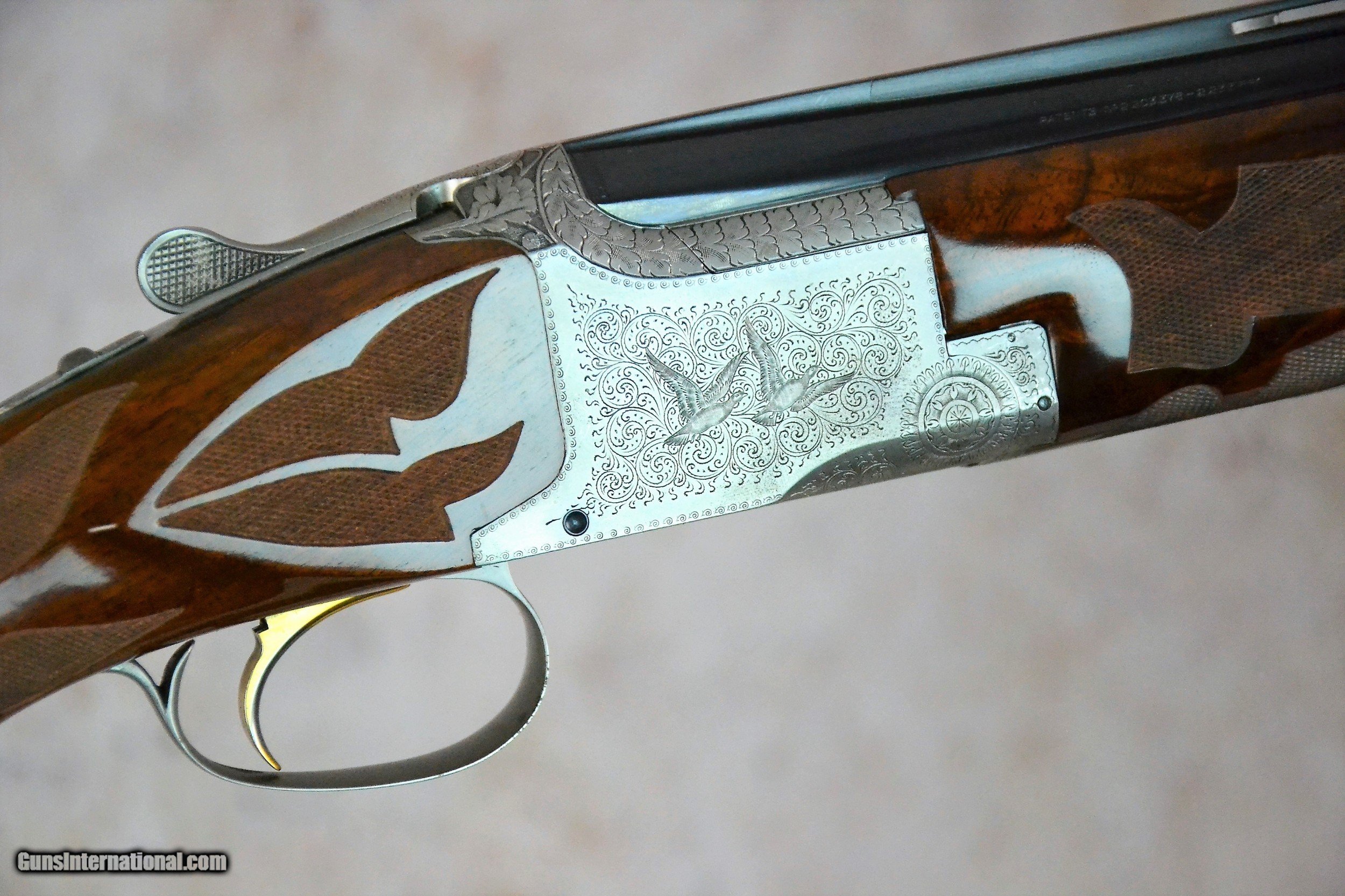 Description: Browning Superposed Pigeon Grade Skeet 12g 28" SN:#80962S7~~Pre-Owned~~ This shotgun has a gorgeous Umberger custom stock-as new-Kolar tube set all gauges. Federal firearms laws do not allow us to ship firearms directly to you. Please contact us for ordering and shipping information. Gauge: 12g Barrel Weight: 4lb 2oz with Forearm Barrel Length: 28" Chamber: 2 3/4" Bore Diameter: 18.4 Chokes: Fixed Sk/Sk Rib: 8mm Flat Rib Stock Dimensions Drop at nose: 1 1/2" Drop at heel: 2 1/4" Cast Off: 1/8 RH with Palm Swell Forend Style: Skeet Length of pull: 14 1/2" Comb: MonteCarlo Weight: 8lb 1oz SOLD |