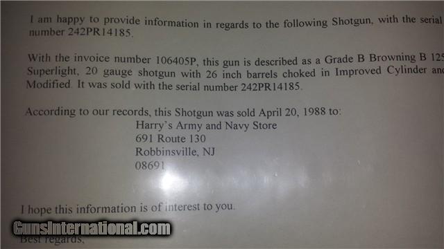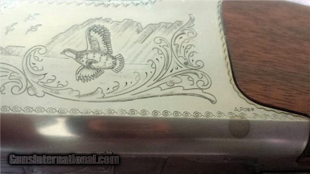 Description: I have for sale a 20 gauge Browning B Grade Super light built in Belgium in 1988. This may be the perfect upland gun. With it's 26 inch barrels choked Improved Cylinder and Modified, single selective trigger, straight grip, Schnabel forend, and weighing only 5 pounds 13 ounces you can chase Grouse and Quail all day with this lovely piece. Gun is in unfired new condition with packing grease still in the action. Very nice engraving signed by Browning Master engraver Agustus Poes. It features flushing quail on one side,and Duck on the other, and an English Setter on the bottom of the receiver. Stock dimensions are 1 5/8 X 2 1/2 X 14 1/4 over the original Browning butt plate. Gorgeous wood with wonderful grain no flaws that I can find anywhere. Take a look at the attached photos and you will see just how lovely this little gun is. It comes in a nice Browning Makers case and a Browning letter of Authenticity from the Browning historian dept. This gun will please even the most picky Browning collector and will certainly make any upland hunter smile from ear to ear. Contact me at 719-466-7665 for any questions. Please not the brown color on the side of the chambers is just packing grease from Browning, being the gun is unfired. SOLD Manufacturer: Browning Model: B125 Superposed Superlight Bore: 20ga. Chambers: 2 3/4 Ejectors: yes Condition: Unfired Metal Condition: Like New Wood Condition: Like new Bore Condition: unfired Barrels: 26 Triggers: single Gauge Info: 20ga Stock: English Chokes: IMP/MOD |