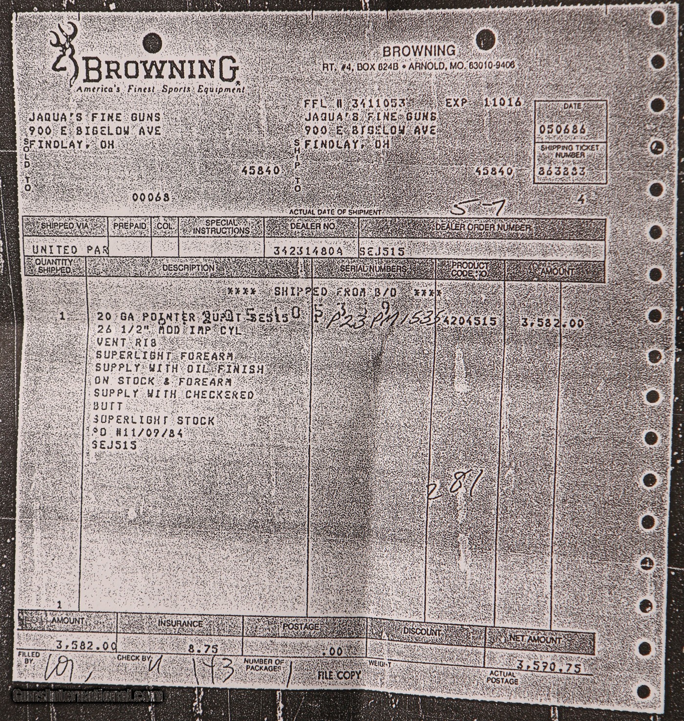 Description: A REAL Superposed - Special Ordered with Options. Not upgraded. Not refinished. Factory Original! 1980 - Browning B-25 Supeposed - Pointer Grade - SuperLight - 20ga, 2-3/4", 26-3/8" IC / M, LOP 14-3/8", Drop 1-3/8" to 2-1/4", Slight Cast Off, Weight - 5 lbs. 10 oz.