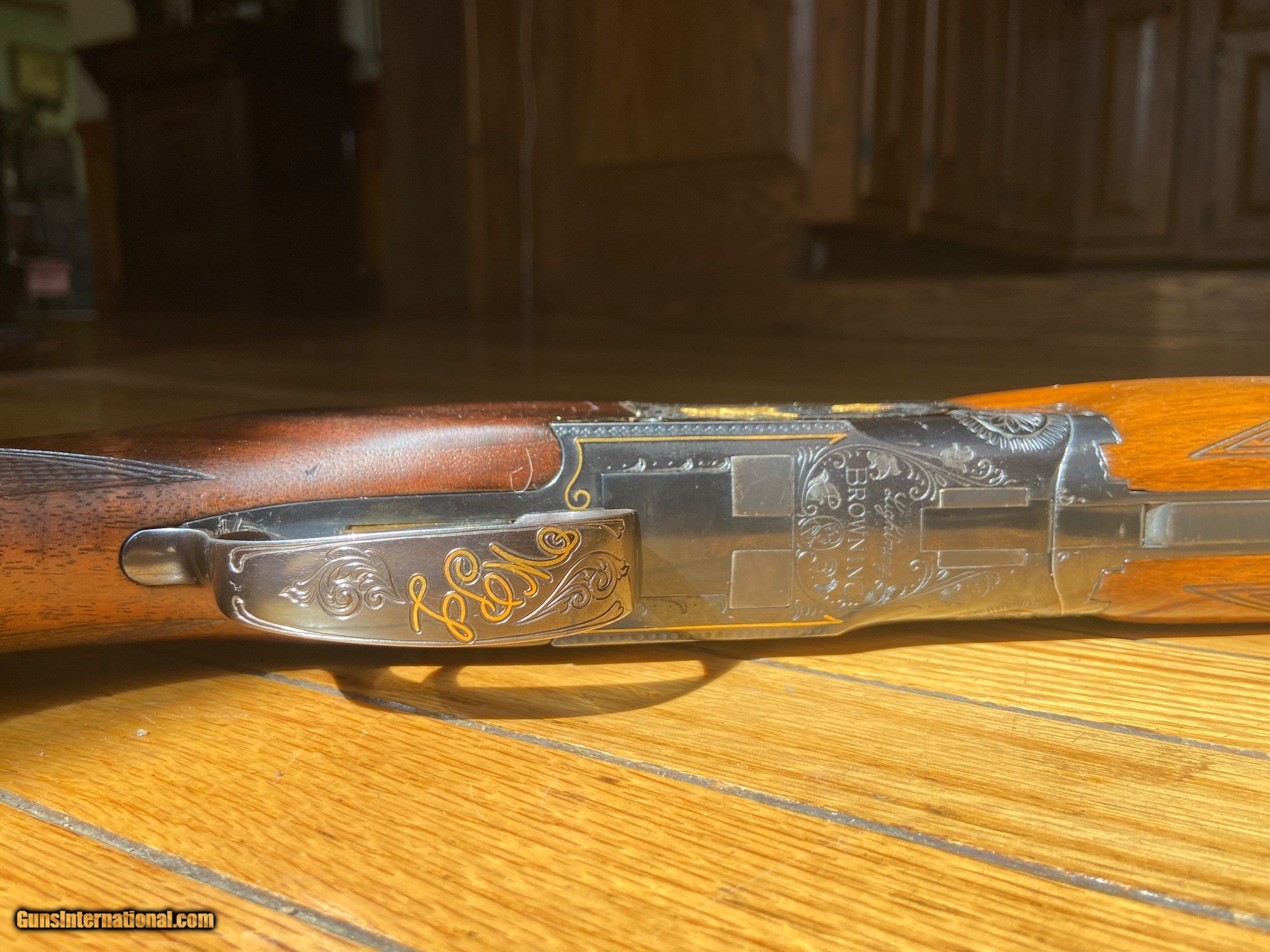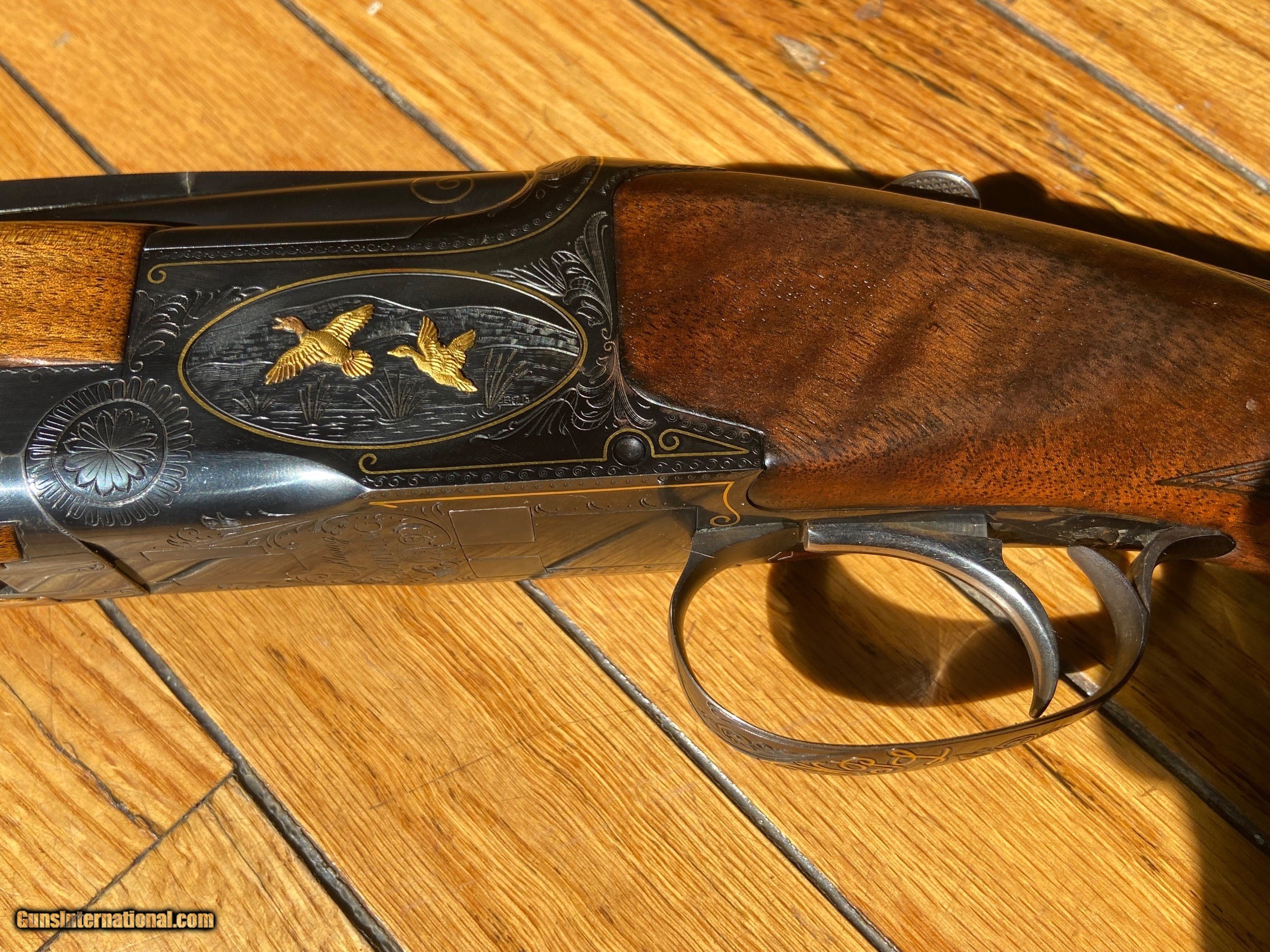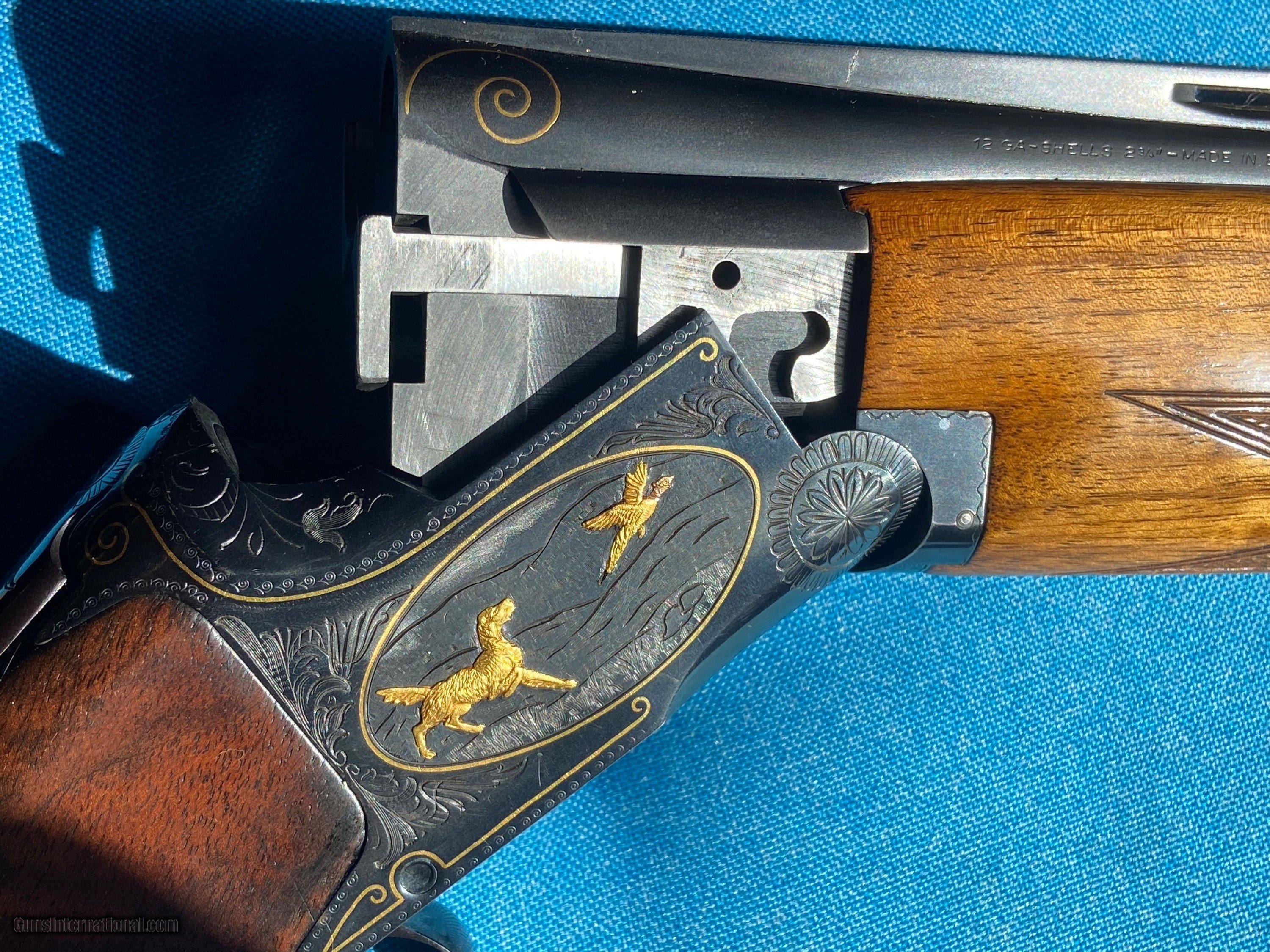 Description: 1967 FN Belgian browning Lightning superposed-no salt possibly unique, looking like a pointer grade, pointer grades we researched were slightly different, Because of the oval outline I believe this is most likely a custom engraved after It left the factory There is additional gold wire in lay on back and front of barrels and receiver , very attractive. And a initial monogram in gold on trigger bow. This was either what I think they call a banquet gun or a presentation gun made a custom shop The back stock looks like a Miscolored replacement, other than that I would say she's 98% and very tight with little use, if you were to order just going today you know what it what it would cost. Any questions please be free to call. SOLD Curio/Relic: Yes Manufacturer: Browning |