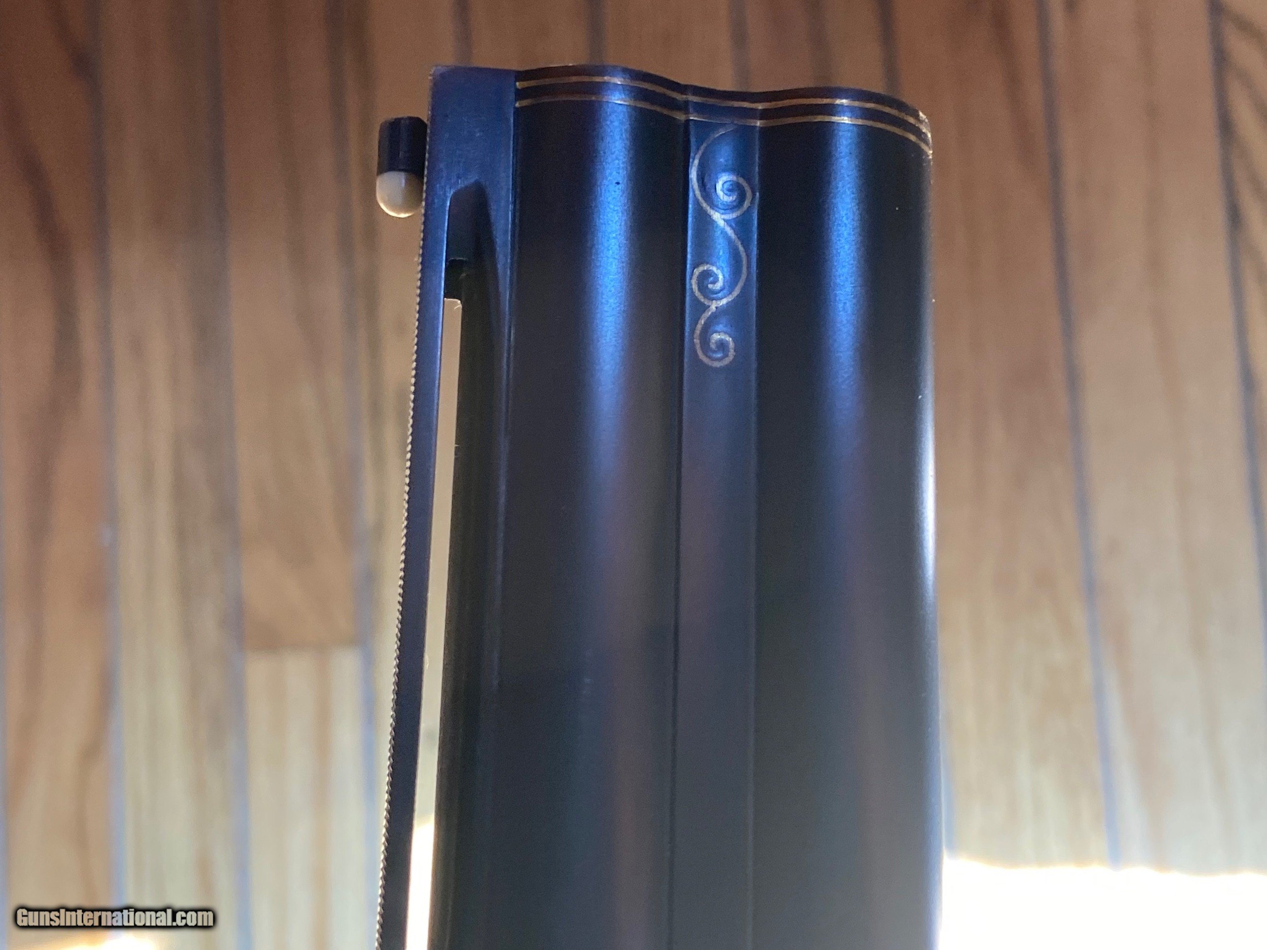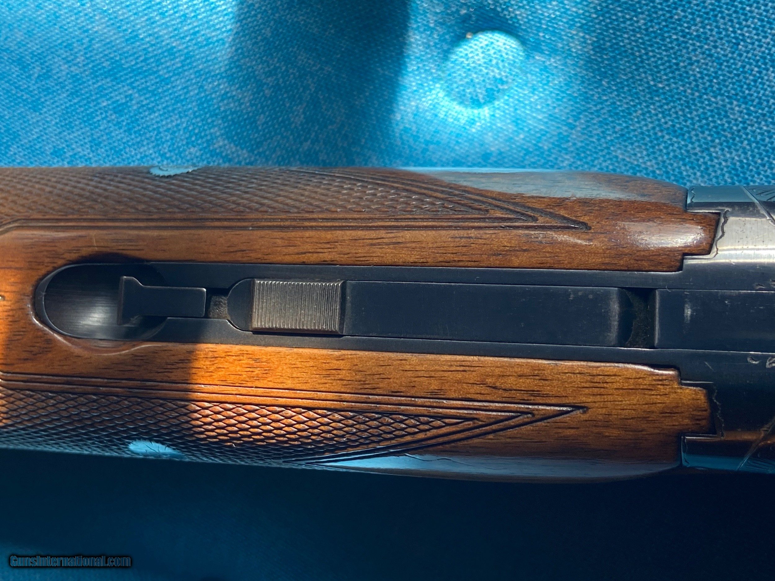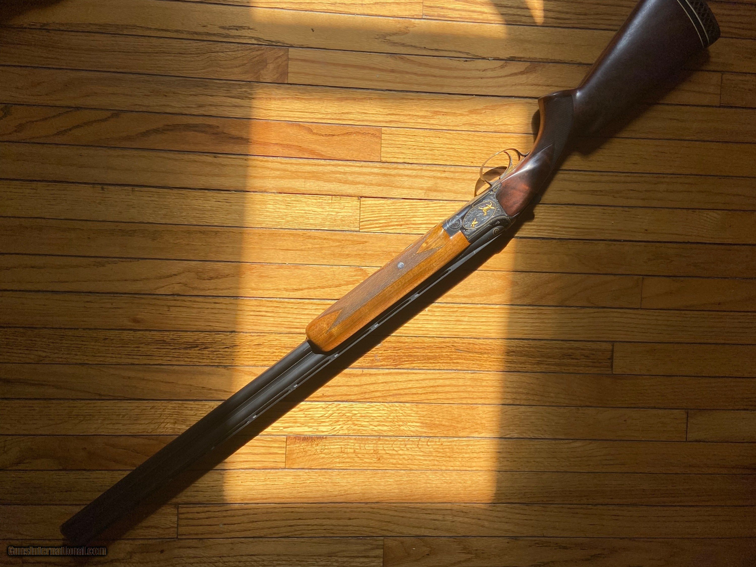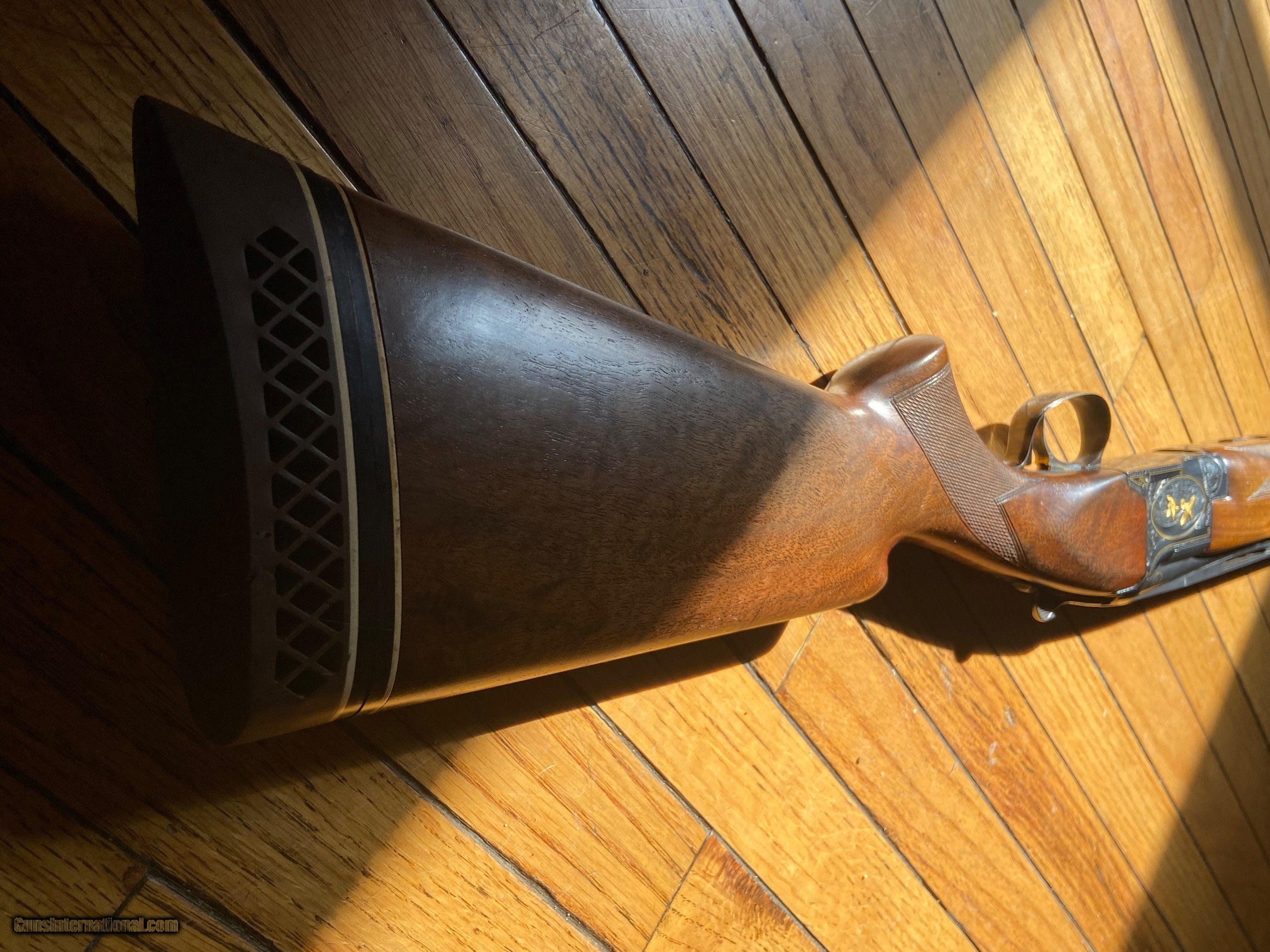 Description: 1967 FN Belgian browning Lightning superposed-no salt possibly unique, looking like a pointer grade, pointer grades we researched were slightly different, Because of the oval outline I believe this is most likely a custom engraved after It left the factory There is additional gold wire in lay on back and front of barrels and receiver , very attractive. And a initial monogram in gold on trigger bow. This was either what I think they call a banquet gun or a presentation gun made a custom shop The back stock looks like a Miscolored replacement, other than that I would say she's 98% and very tight with little use, if you were to order just going today you know what it what it would cost. Any questions please be free to call. SOLD Curio/Relic: Yes Manufacturer: Browning |