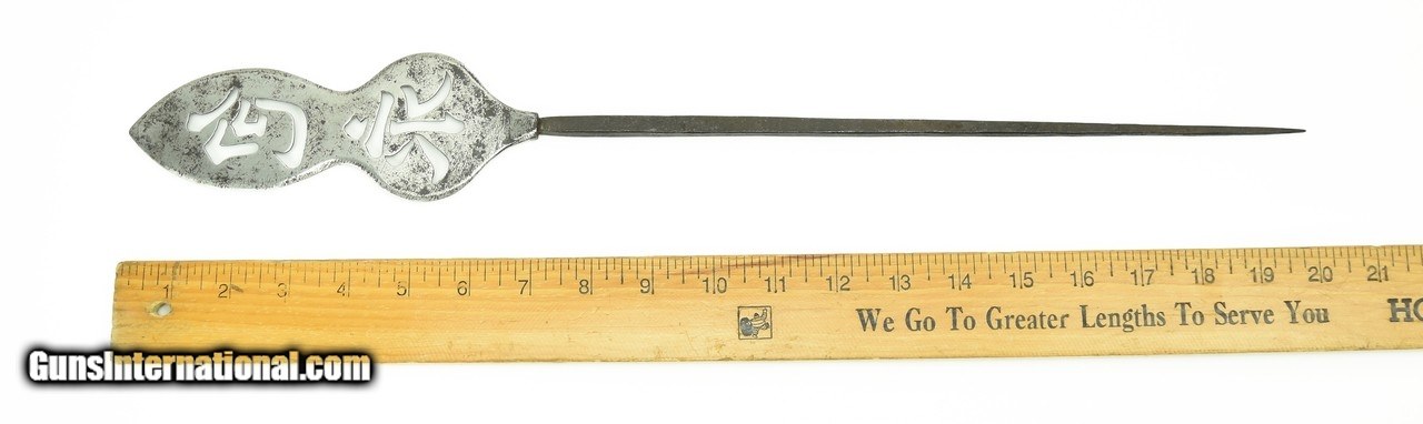 Description: "Unusual Sukashi presentation Arrowhead by Kane Naga. 18th/19th Century. Pierced with Kanji of the Smith’s name. No Shirasaya. 7" or 17.8 cm long, 20 1/8" or 51.1cm overall length. Ex- Paul Goodman Collection. SOLD |