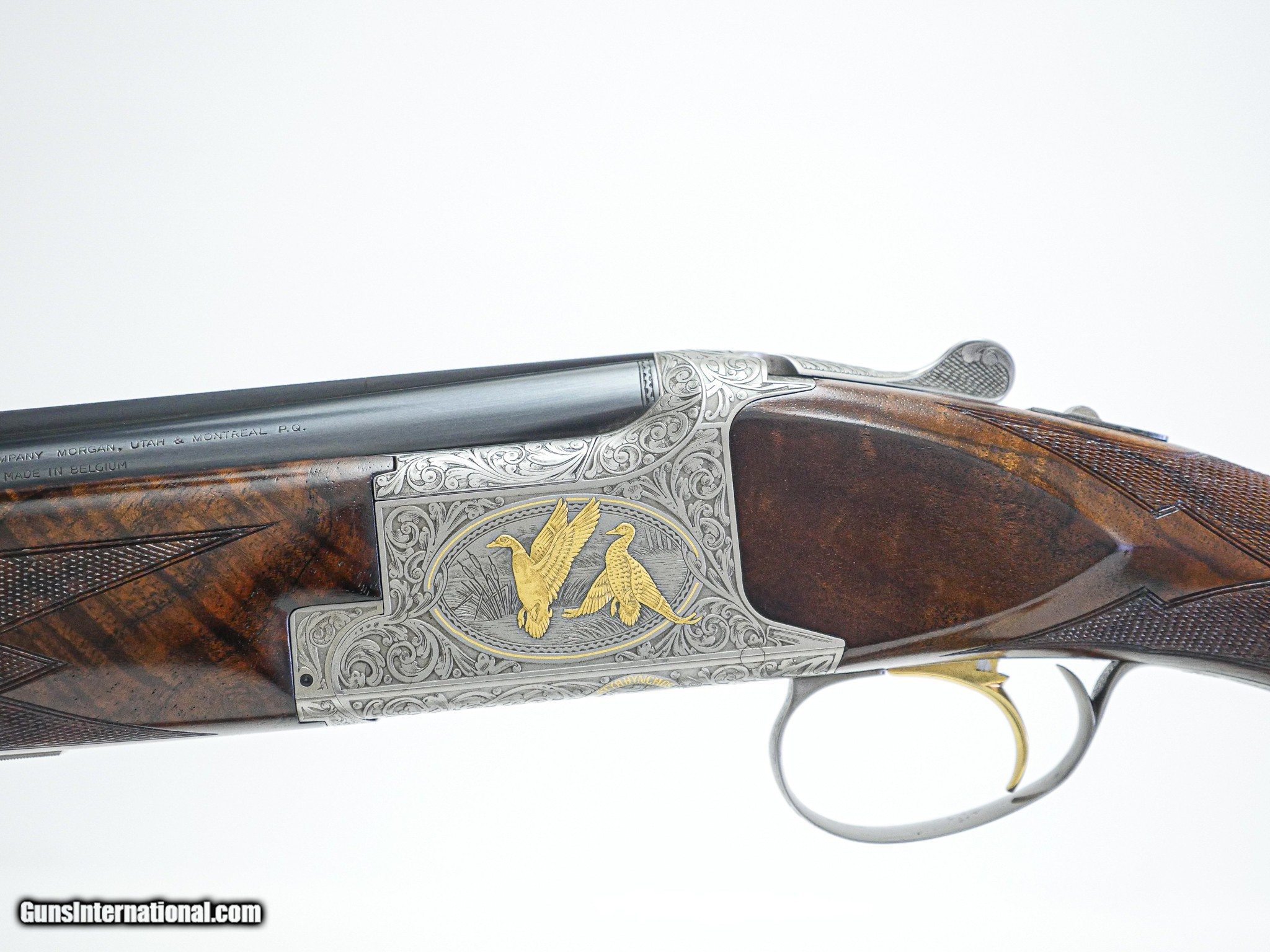 Description: Browning - American Mallard, 12ga. 28" Barrels Choked IM/F. Belgian American Mallard commemorative, #029 of 500 limited edition, superior highly figured walnut checkered butt, round knob pistol grip stock, Long tang trigger guard, Fabulous engraving, magnificent bold scroll, raised gold mallard, very high grade gun in its walnut presentation case, available for immediate delivery. S&H - $50.00. Inv: 27292 7 lbs. 0.4 oz. 14 3/8" x 1 ½" x 2 ½" $9,995.00 SOLD |