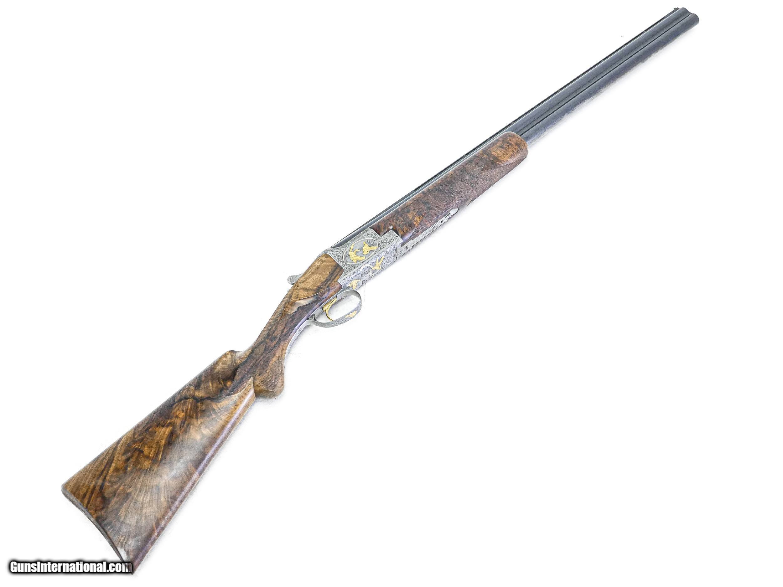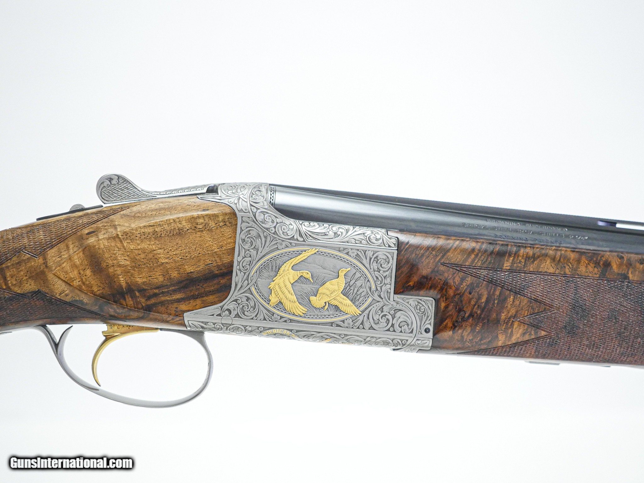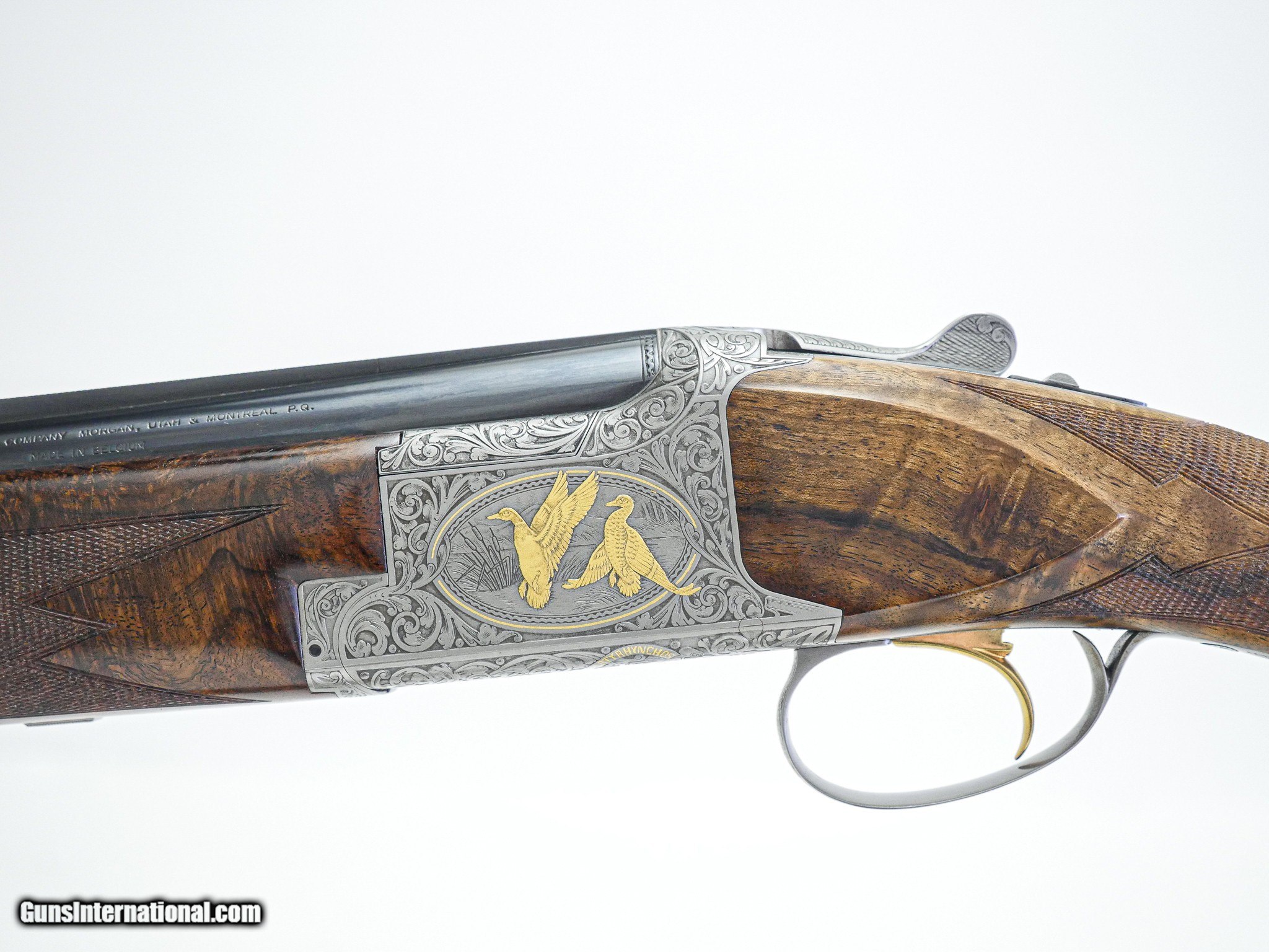 Description: Browning - American Mallard, 12ga. 28" Barrels Choked M/F. Most stunning wood imaginable, round knob long tang, oil finish, Midas pattern checkering, gold single selective trigger, automatic ejectors, vent rib, skip line checkered butt, field forend, round superlight frame, number 38 of 500, gold highly detailed inlays of mallards surrounded by full coverage acanthus scroll engraving over a French grayed finish, 100% as new and unfired, the finest collector grade example you will encounter, includes factory full length wooden case with red velveteen interior, $50 S&H, available for immediate delivery, this is the nicest one you will ever see, no excuses. Inv: 43978 7 lbs. 4 oz. 14 3/8" x 1 ½" x 2 3/8" MAKE OFFER SOLD |