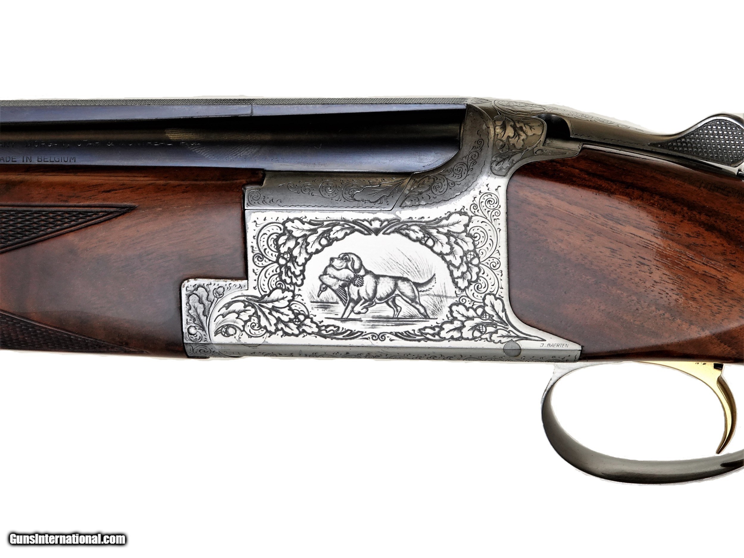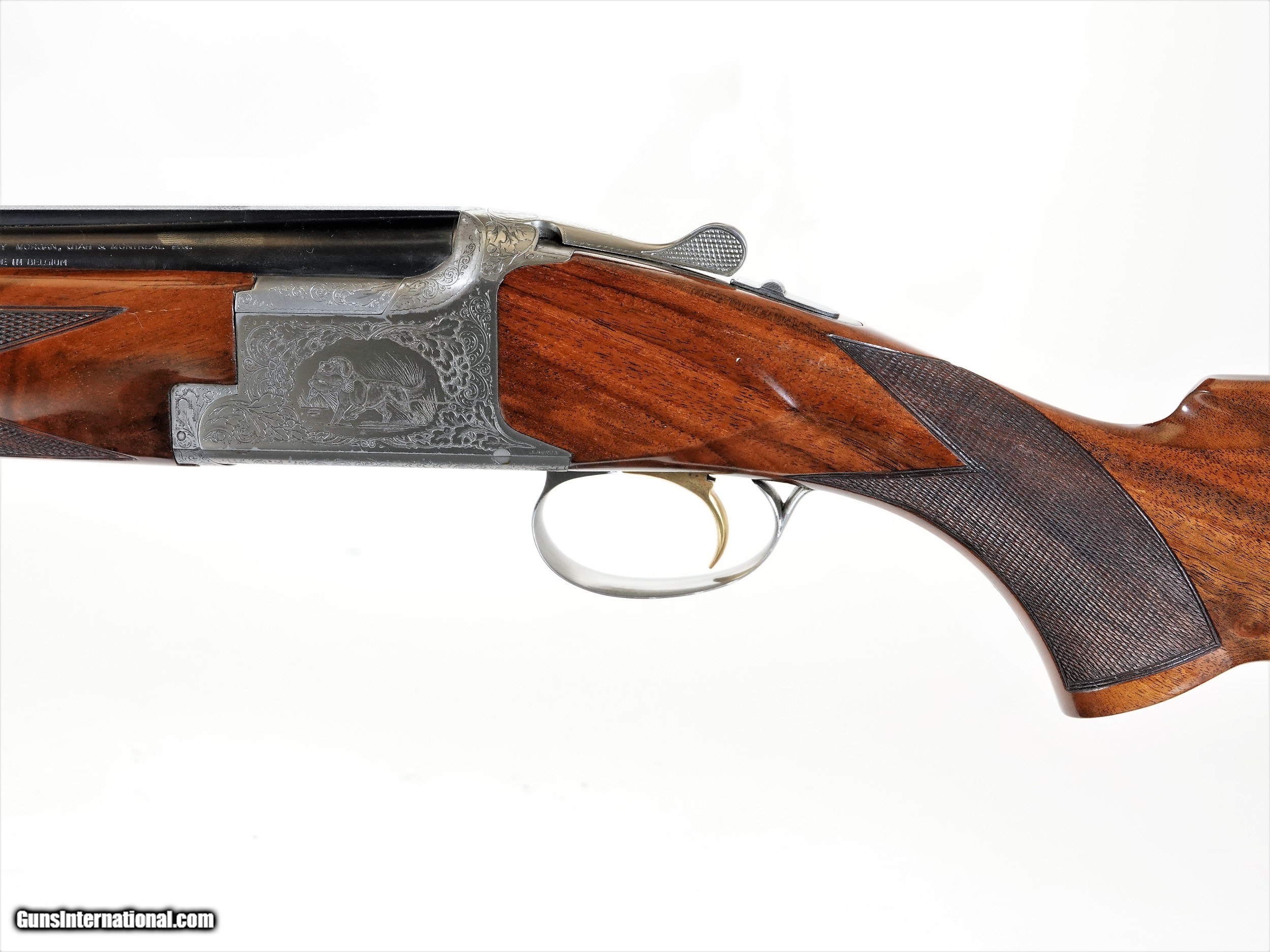 Description: Browning - P1, 12ga. 30" Barrels. Fitted with choke tubes, long tang square knob, highly figured wood, factory Browning recoil pad, Schnabel forend, gold single selective trigger, automatic ejectors, high gloss finish, signed by factor master engraver Jose Baerten, includes case. Inv: 30813 14 ½" x 1 ½" x 1 ½" 7 lbs. 9 oz. $6,995.00 SOLD |
