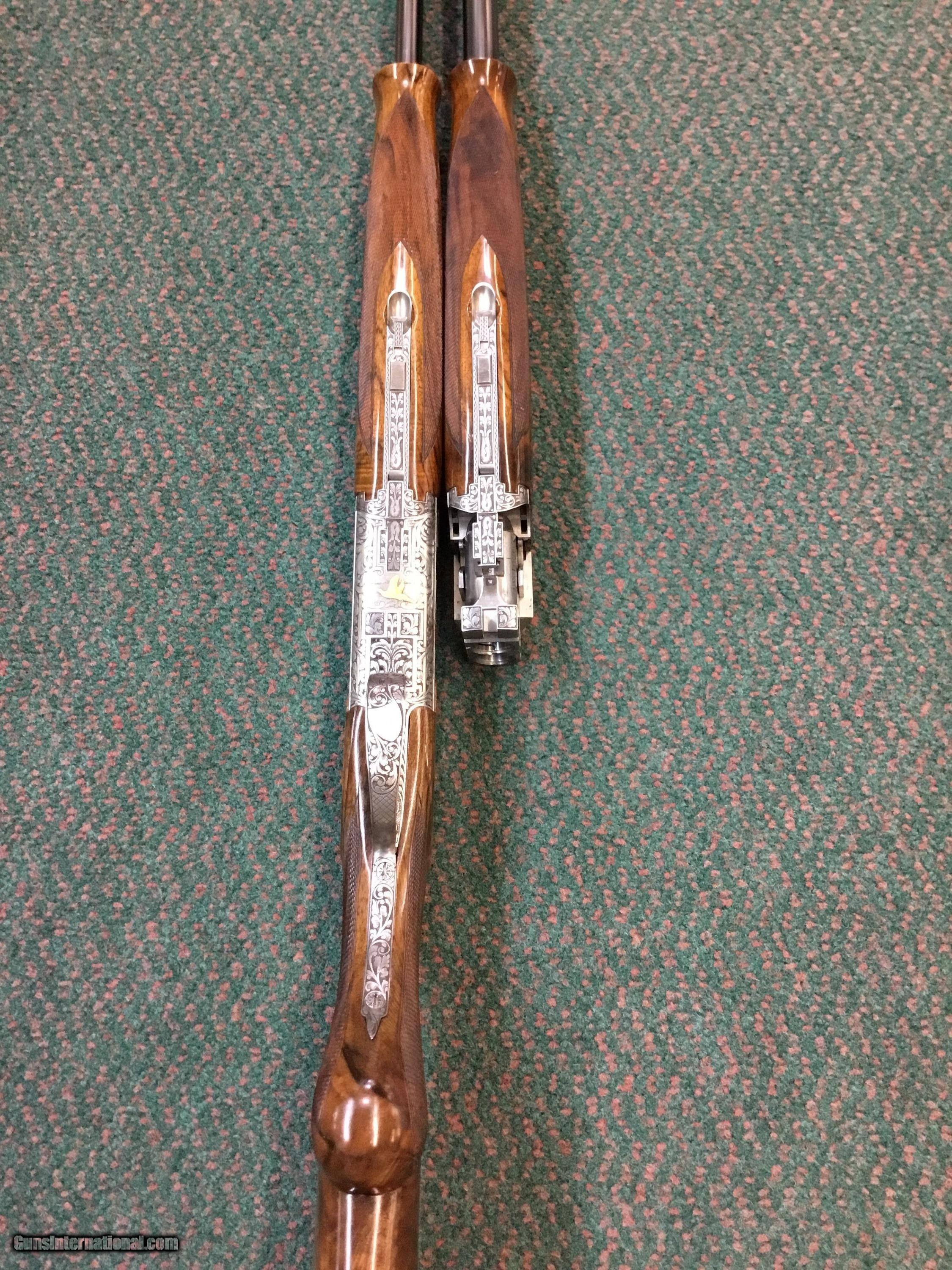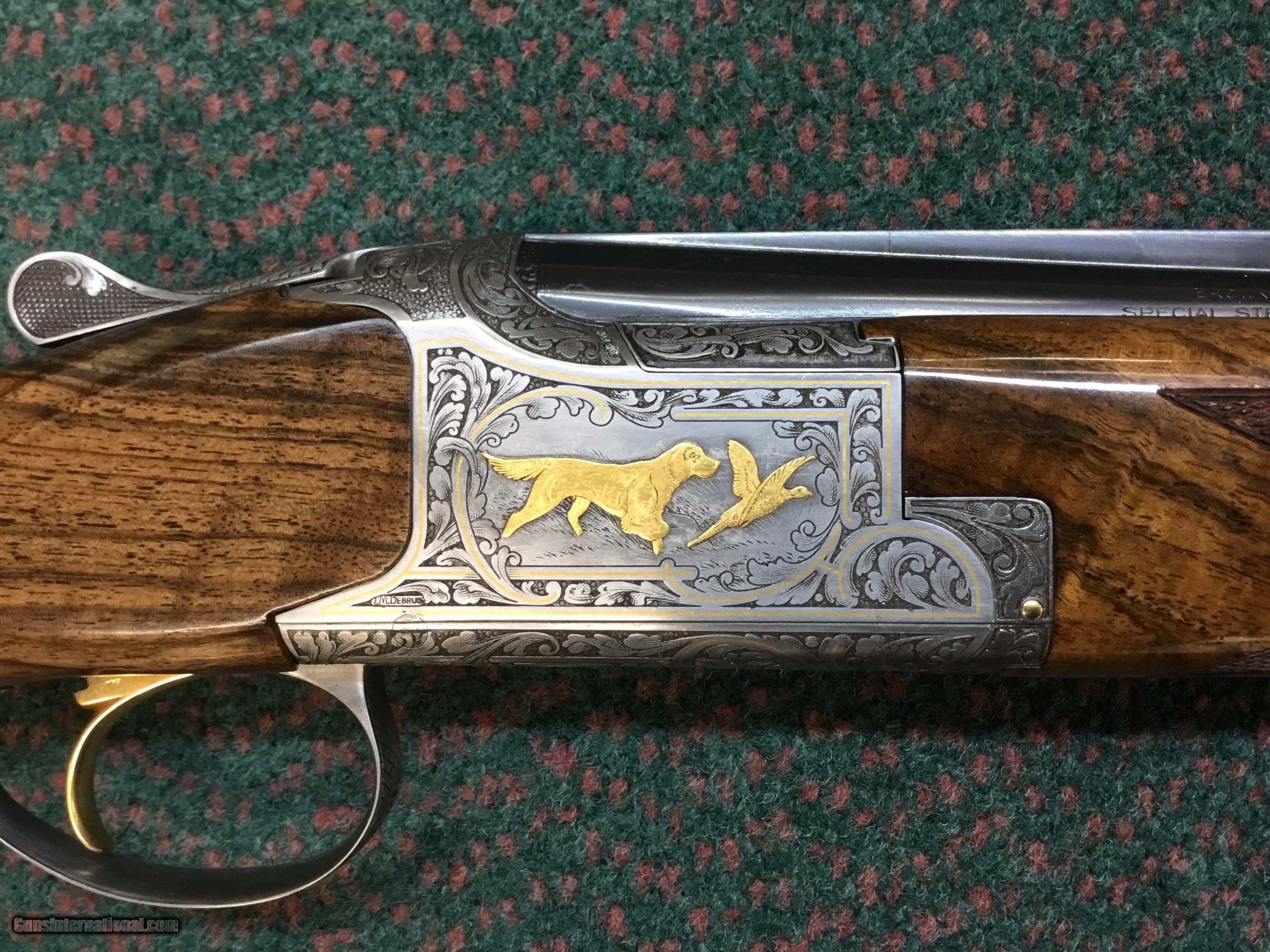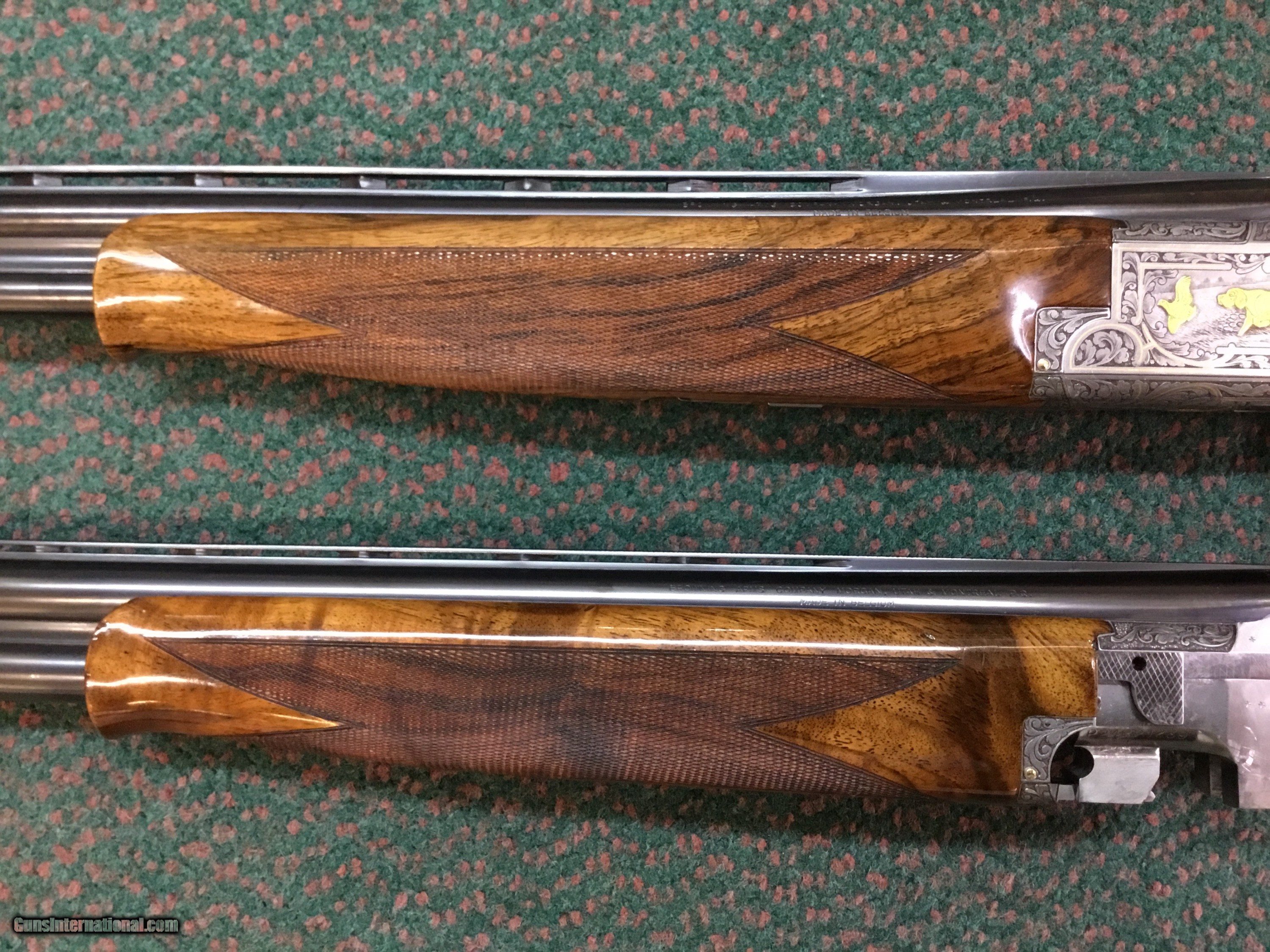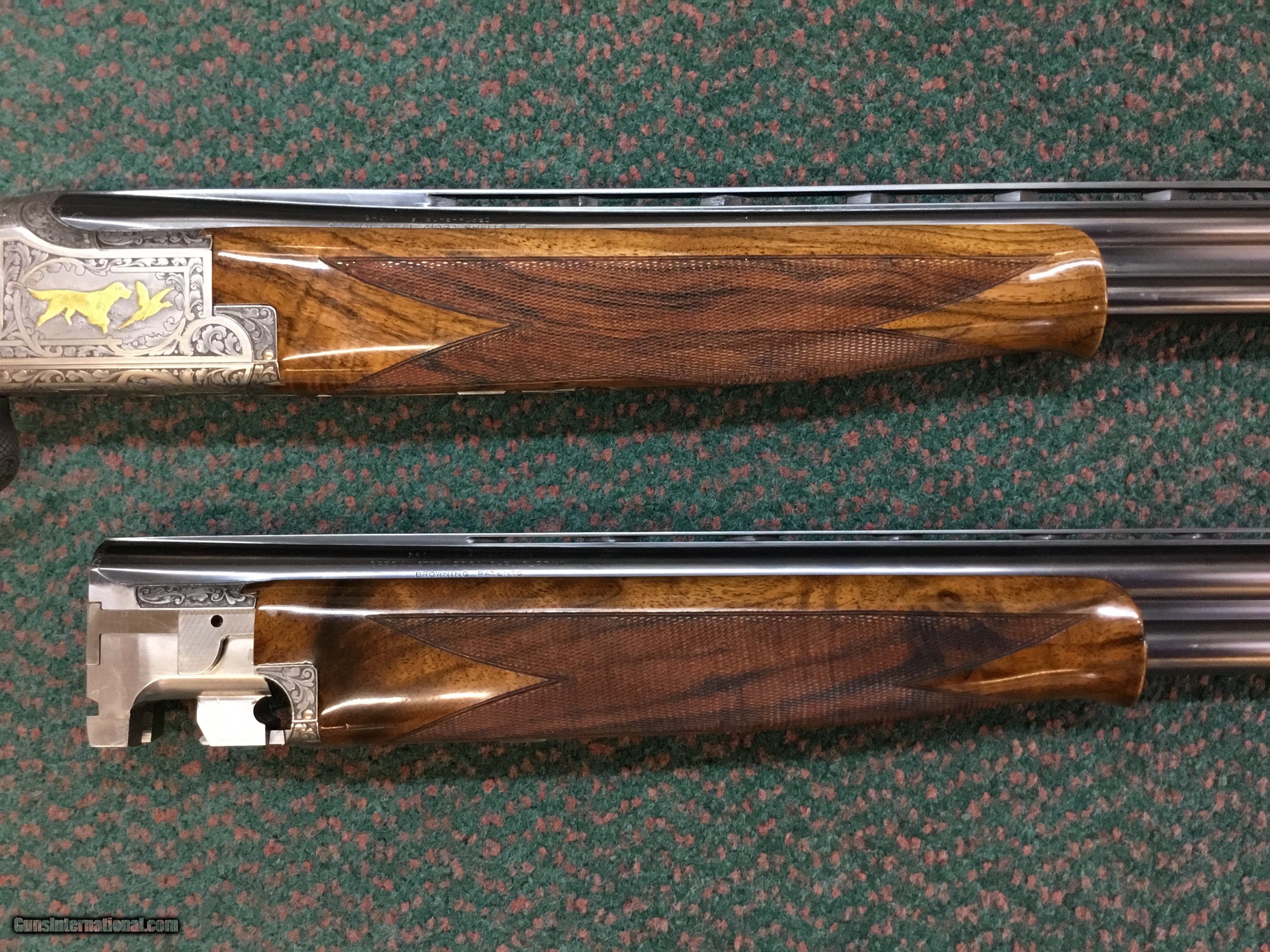 Description: Browning Superposed P3, RKLT, 20 ga/410 ga two barrel set, engraved by FN master engraver Jean Marie Debrus in Browning's P3 pattern, featuring a setter and pheasant on right, pointer and quail on the left, pigeon on the bottom of the receiver Al inlaid in gold. Butt stock and forearms are English walnut, butt stock has checkered butt, 14 1/2" LOP, 1 9/16" drop at the comb, 2 3/16" at the heel. schnabel forearms all checkered in fine line checkering. Both sets of barrels are 26 3/8" , vented rib , screw in chokes, 99% perfect, comes with two barrel hard case buyer pays actual insurance and shipping SOLD Shotgun Gauge: 20 Gauge, .410 Gauge |