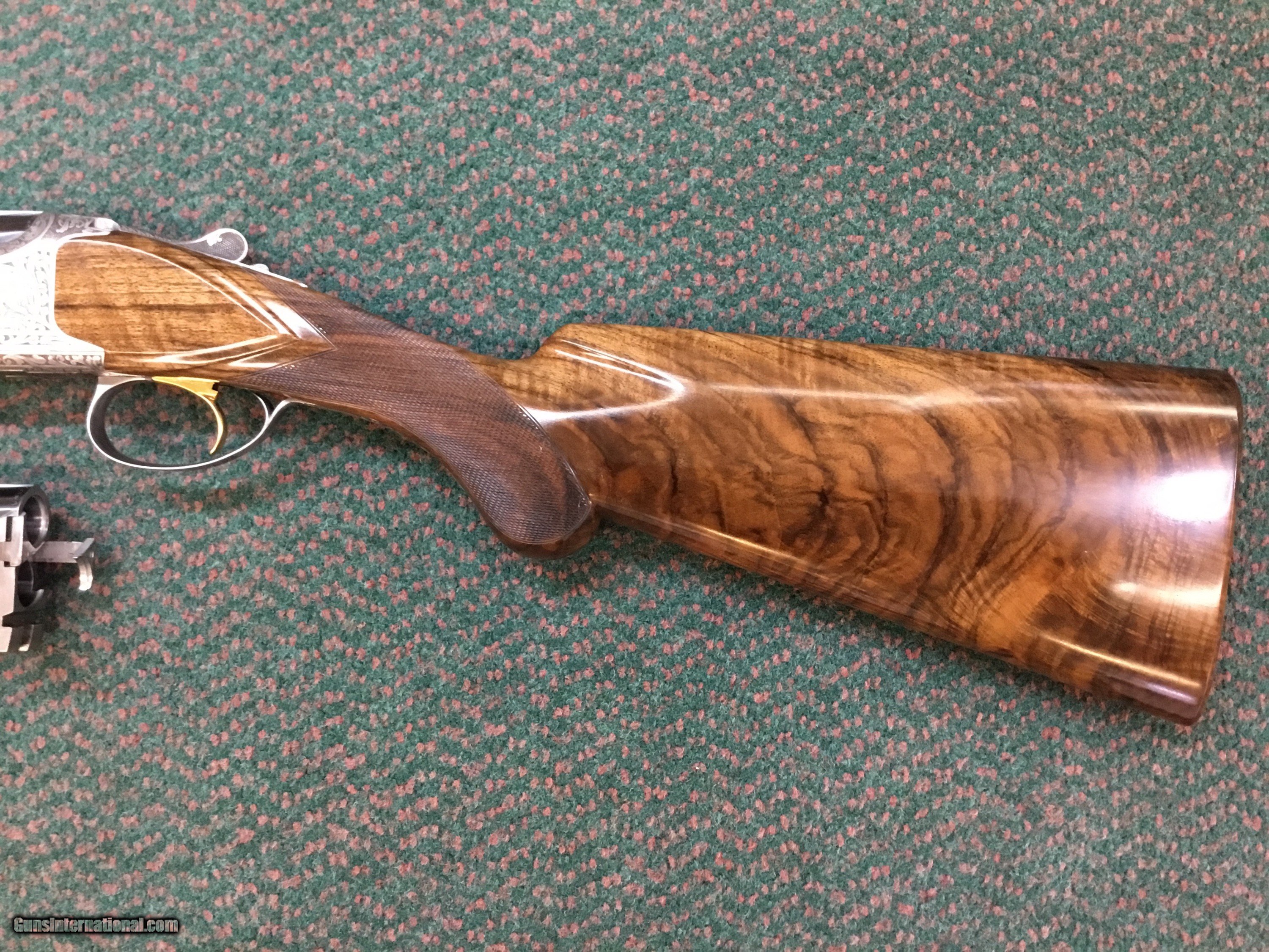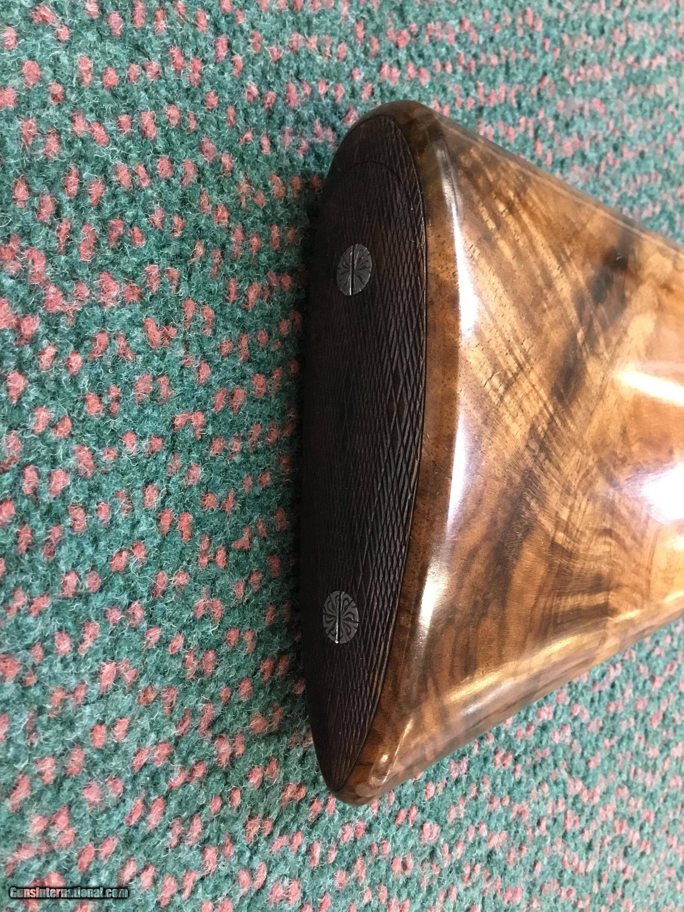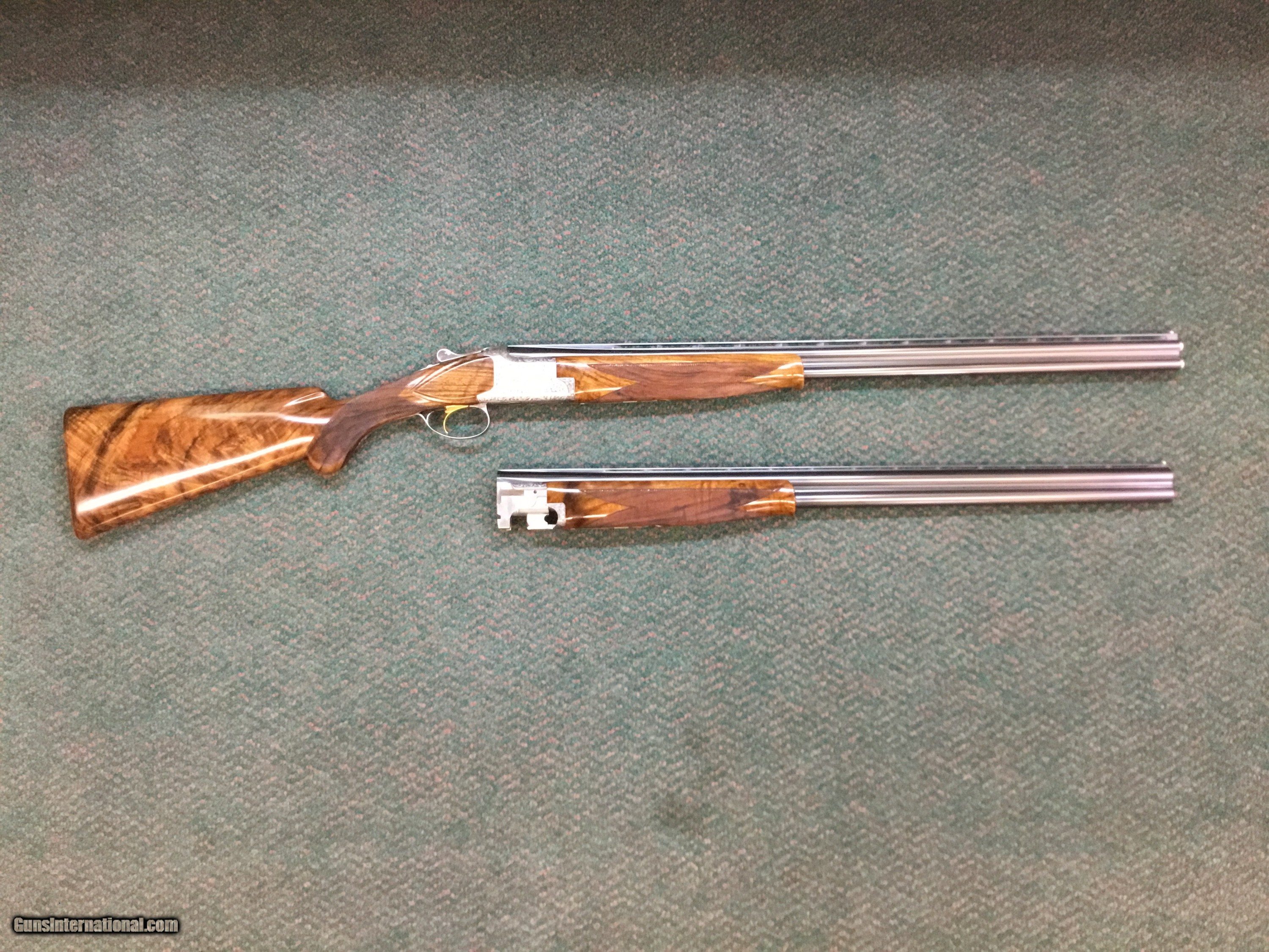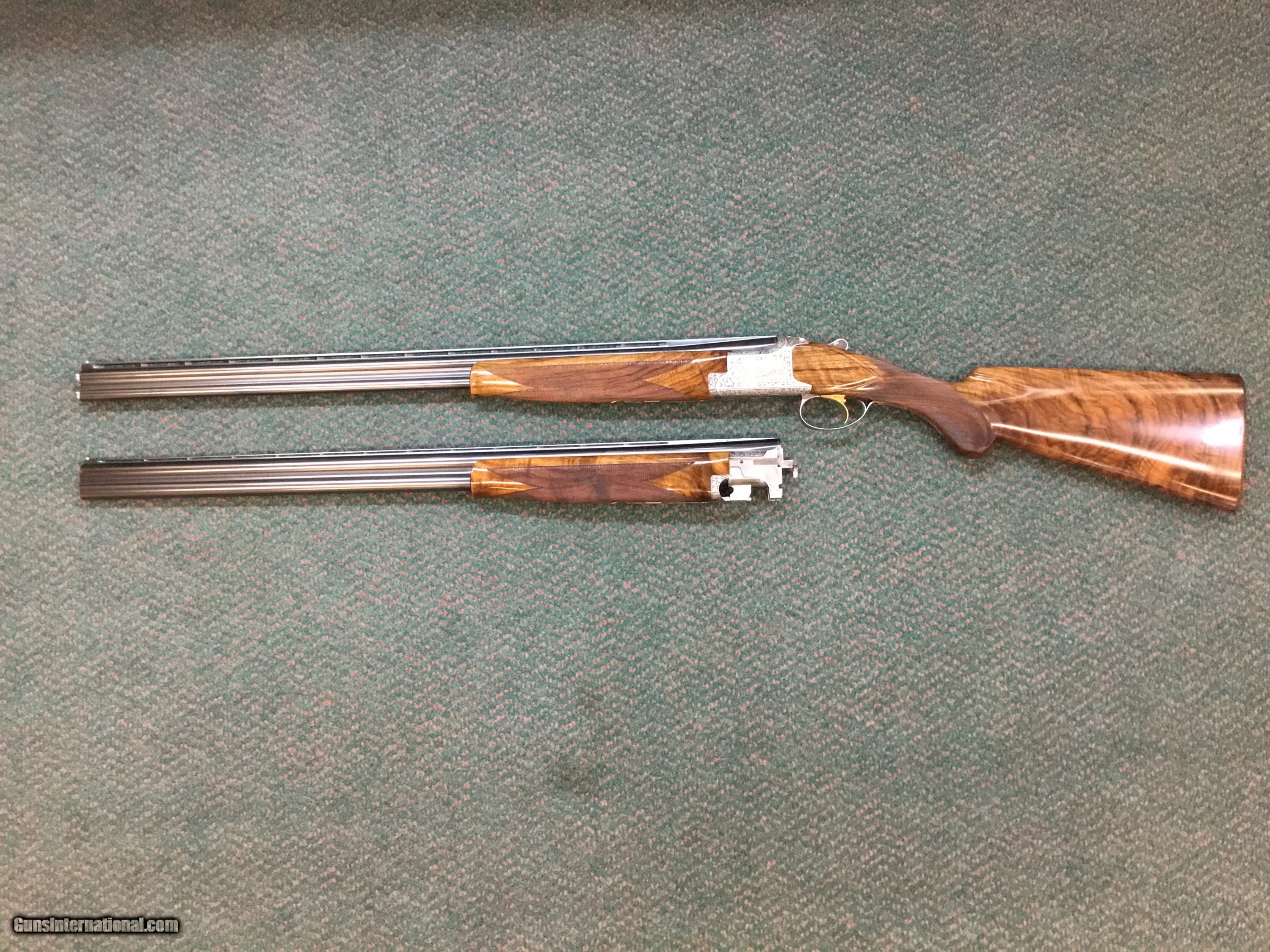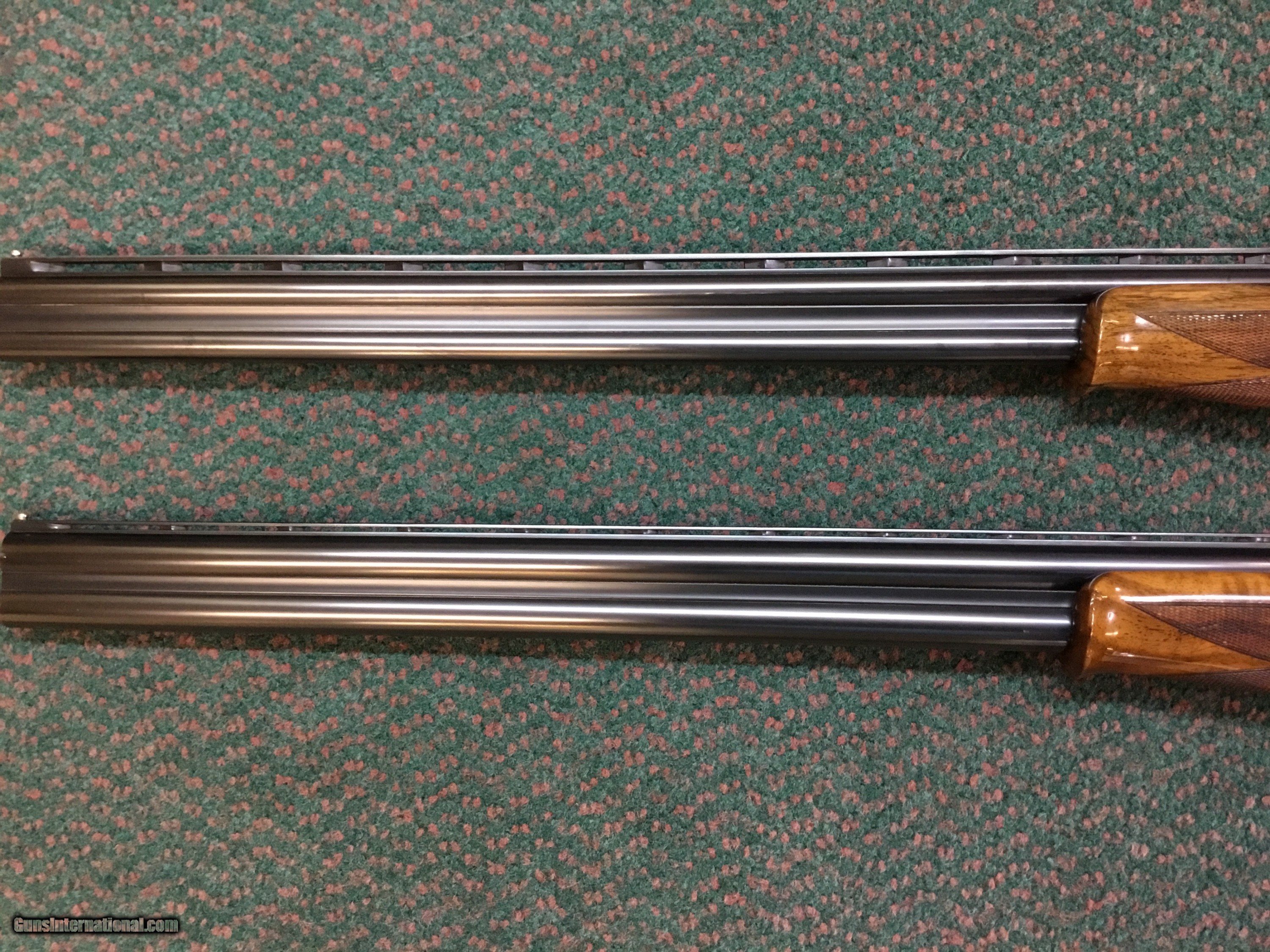 Description: Browning Superposed P3, RKLT, 20 ga/410 ga two barrel set, engraved by FN master engraver Jean Marie Debrus in Browning's P3 pattern, featuring a setter and pheasant on right, pointer and quail on the left, pigeon on the bottom of the receiver Al inlaid in gold. Butt stock and forearms are English walnut, butt stock has checkered butt, 14 1/2" LOP, 1 9/16" drop at the comb, 2 3/16" at the heel. schnabel forearms all checkered in fine line checkering. Both sets of barrels are 26 3/8" , vented rib , screw in chokes, 99% perfect, comes with two barrel hard case buyer pays actual insurance and shipping SOLD Shotgun Gauge: 20 Gauge, .410 Gauge |