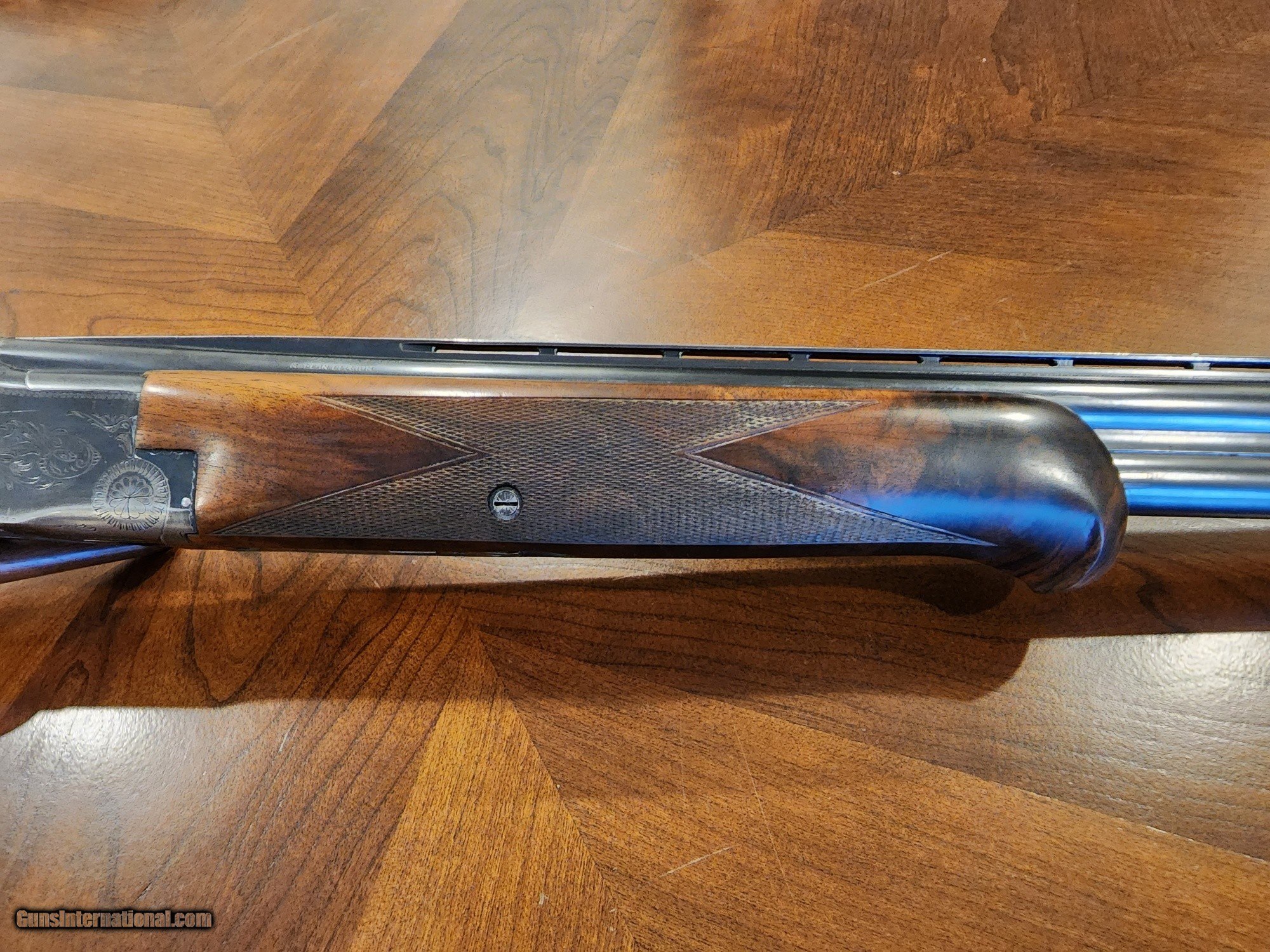 Description: **Sale Pending 11/10/11 to Greg G** For sale is a truly unique 1963 Belgian Superposed Lightning 20g. with 3" chambers stocked in a AAA fancy English/Straight grip walnut stock with Schnabel forend. The custom stock and long tang were done by Haugh & Sons Custom Gun Work in Indiana (Jack and his son, Cole are both master gunsmiths and specialize in English better/best restorations). The condition of the mechanicals is perfect, metal surfaces show honest wear in the bluing but nothing distracting. Wood condition is perfect, checkering is perfect. 26.5" barrels are clean, no dents or dings - fixed choked in M(**) over IC(**-). LOP is nice and long at 14.875" to Pachmeyer pad (14" to end of wood). I am measuring the stock to have dimensions of 1 1/2" at comb and drop of 2 1/2" at heel. This lively bird gun is perfect for quail, grouse, or woodcock! This would make a great 'birth year' shotgun for the collector! This is my personal shotgun - feel free to ask any questions. Serial number dates this Browning to 1963 - no worries of the dreaded 'salt gun' here. Flat shipping of $35 to your FFL. SOLD Shotgun Gauge: 20 Gauge Manufacturer: Browning Model: Superposed Lightning Bore: very good Chambers: 3 Ejectors: yes Condition: very good Metal Condition: good Wood Condition: excellent Bore Condition: excellent Barrel Type: over/under Triggers: single, selective Stock Comb: 1 1/2 Stock Heel: 2 1/2 LOP: 14.875 Weight: 6lbs 9oz Sights: double white bead Chokes: fixed Choke Left: IC Choke Right: M Engraving: hand engraved |