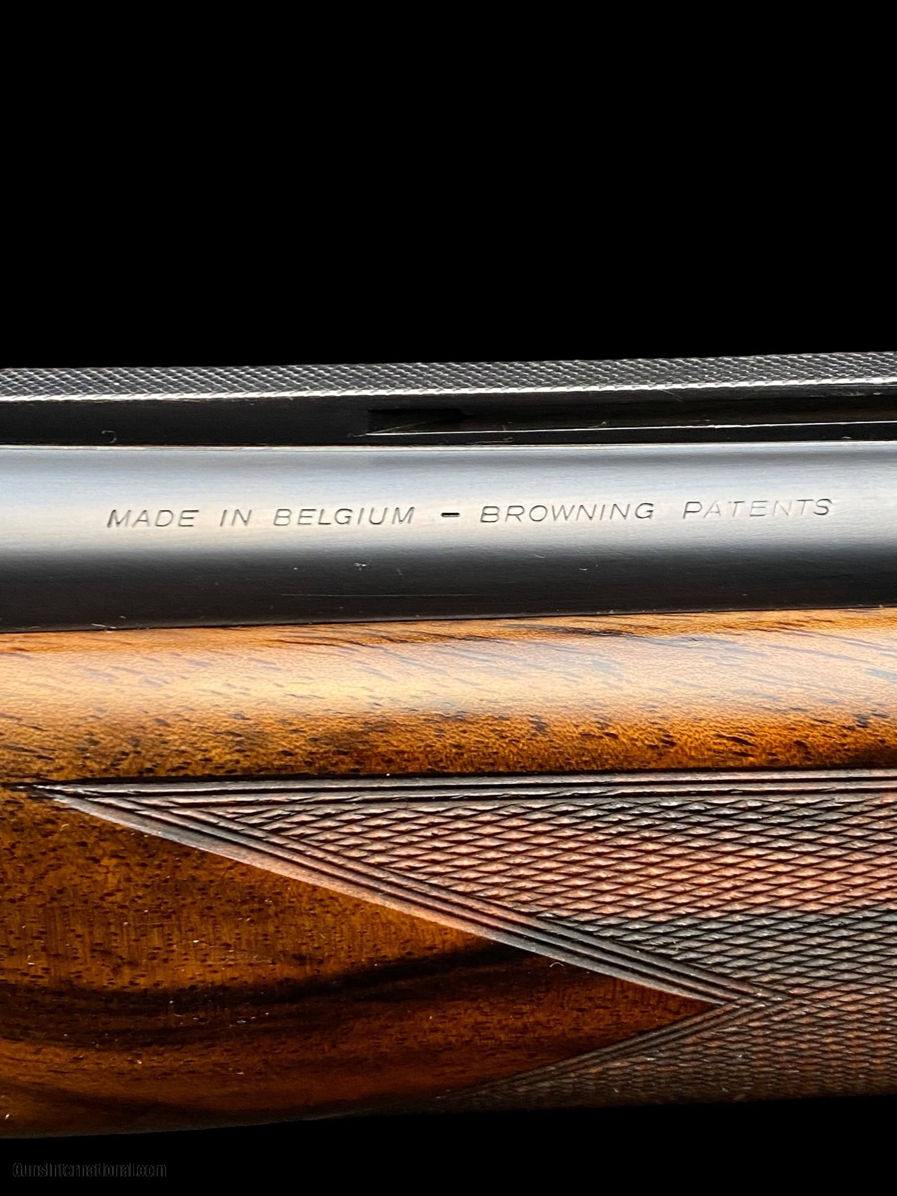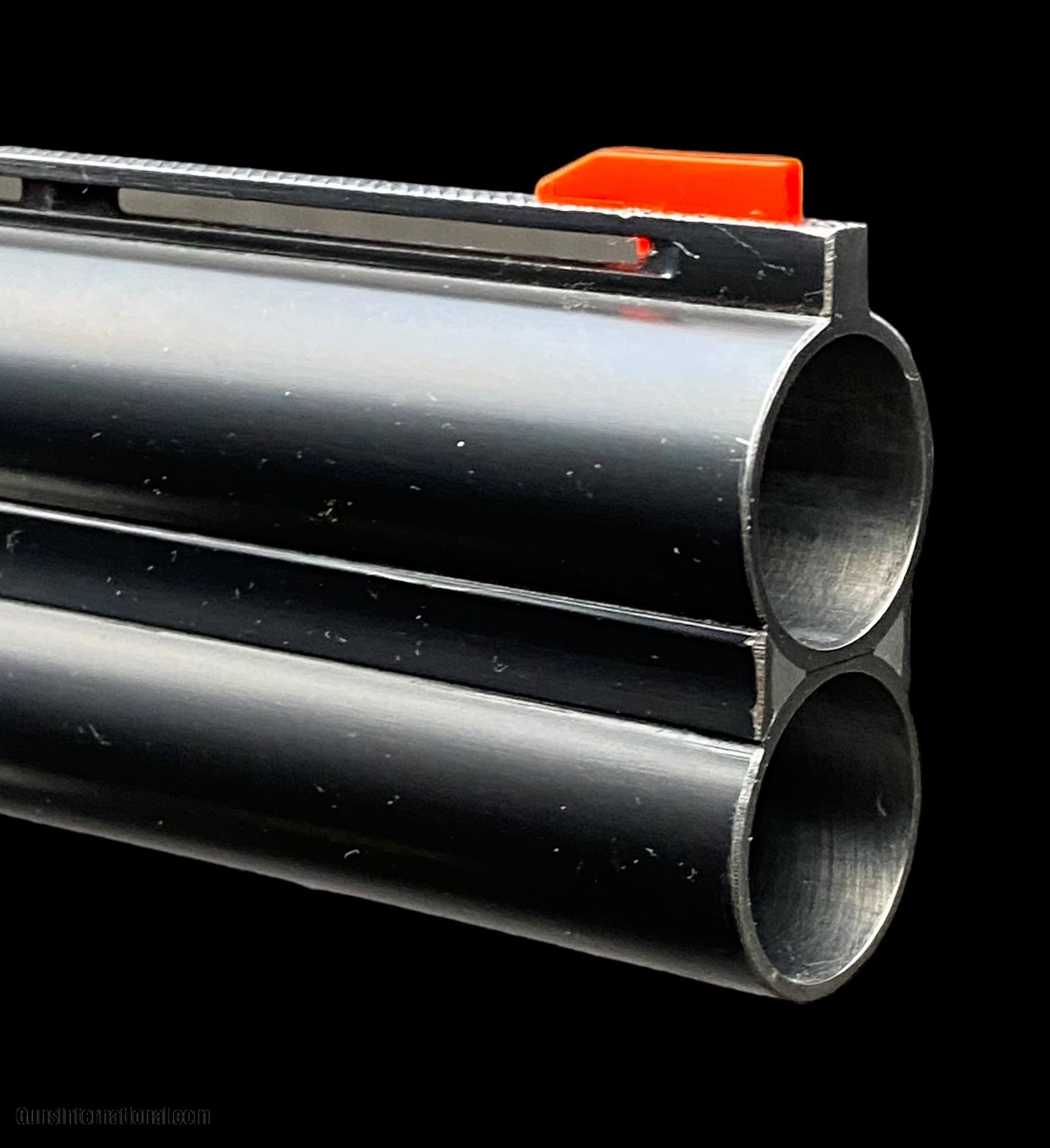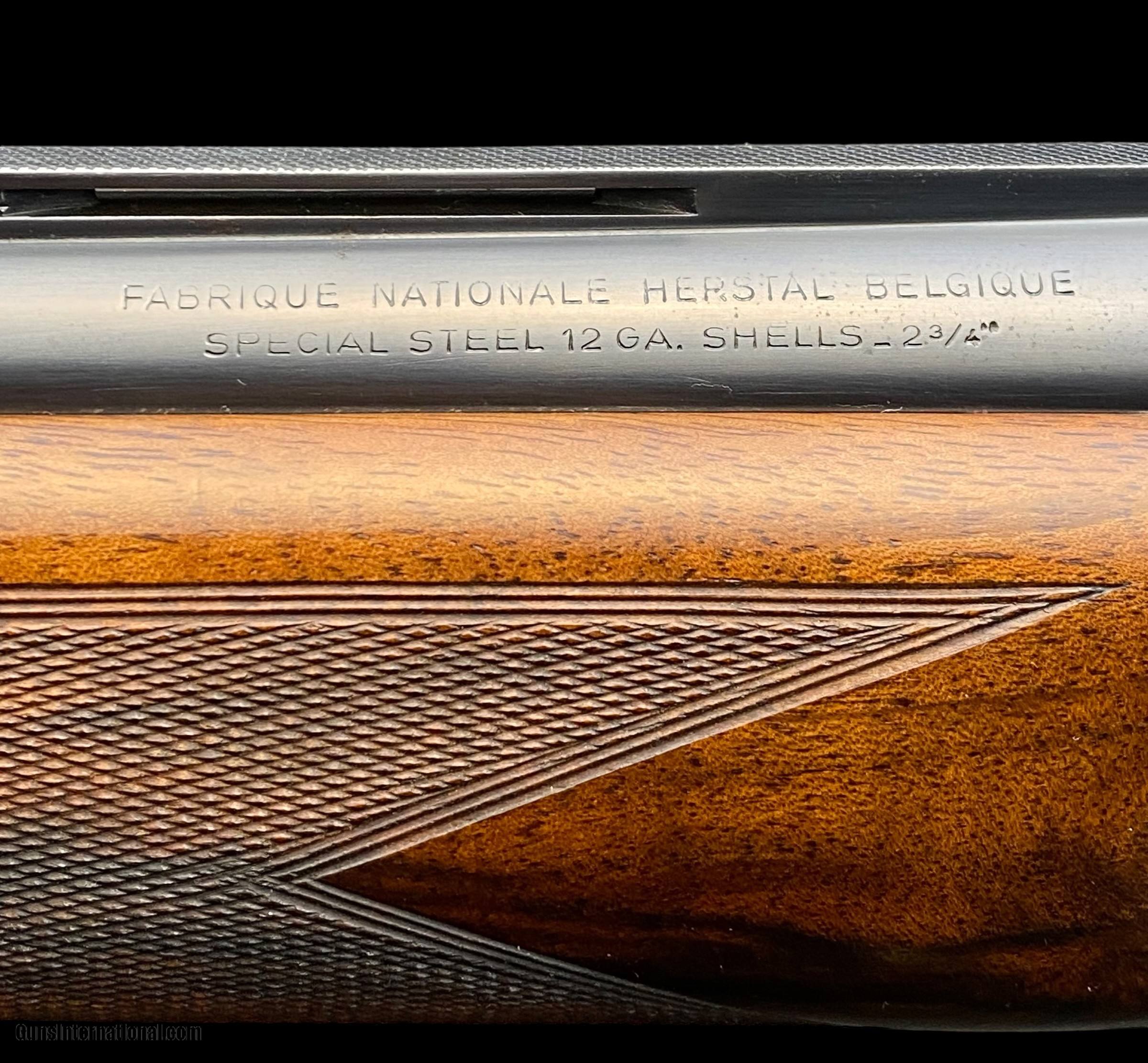 Description: SOLD --- TO A SATISFIED CLIENT -- PLEASE SEE OUR OTHER FINE FIREARMS LISTINGS -- FN SUPERPOSED SUPERLIGHT B125 GAME GUN - Belgium SN. 863PZ1181x. 12ga. 27-1/2" bbl - 2-3/4" chamber, with slightly raised matted ventilated top rib with orange front sight. Choke: M/F Min. Wall Thickness: .038(T) .035(B). Bore Diameter: .724(T) .724(B). Bore restriction: .020(1) .038(B) Superlight Schnabel tipped forearm is checkered in point pattern with latch release. Coin finished receiver is nicely engraved with quail on left, pheasants on right, pointer on bottom all engraved by J.P. Bailey and stamped on back of left side. Long tang trigger guard. Single Selective Trigger, Auto ejectors, Non-auto safety. Nice fiddleback figured walnut buttstock is checkered in two point pattern, has gold oval on toe line, and terminates with a thin red pad. DAC: 1-1/2". DAH" 2-3/8". LOP: 14" WEIGHT: 6lbs. 10oz. CONDITION: Excellent as lightly field used. Bbls with about 95% original blue, sling mounts with later plugs. Forend and buttstock are excellent as professionally restored, near invisible sling holes on toe line are filled. Frame is excellent with minor staining. Bores are bright and shiny. Mechanics are crisp. Nice gun! Gentlemen, this is a very nice superlight field gun by FN Browning. Made for the European market and not commonly seen here in USA. Nice dimensions and balance. LOP easily extended with Silvers style pad. Call now! FFL required Flat $50 S/H/I Card fee applies SOLD Shotgun Gauge: 12 Gauge Manufacturer: FN BROWNING Model: B125 Chambers: 2.75 Ejectors: YES Condition: EXC Metal Condition: EXC Wood Condition: EXC Bore Condition: EXC Triggers: SINGLE SELECTIVE |