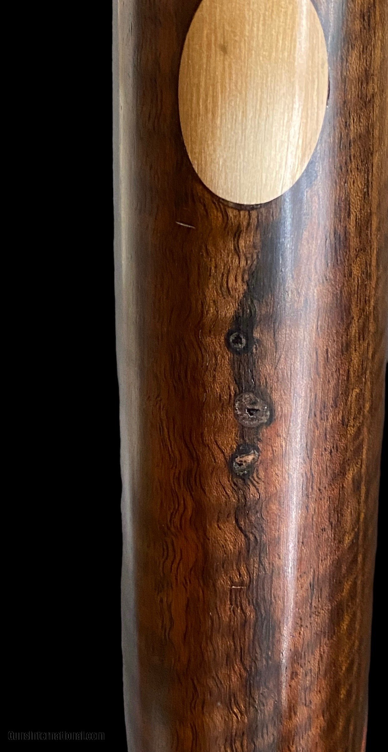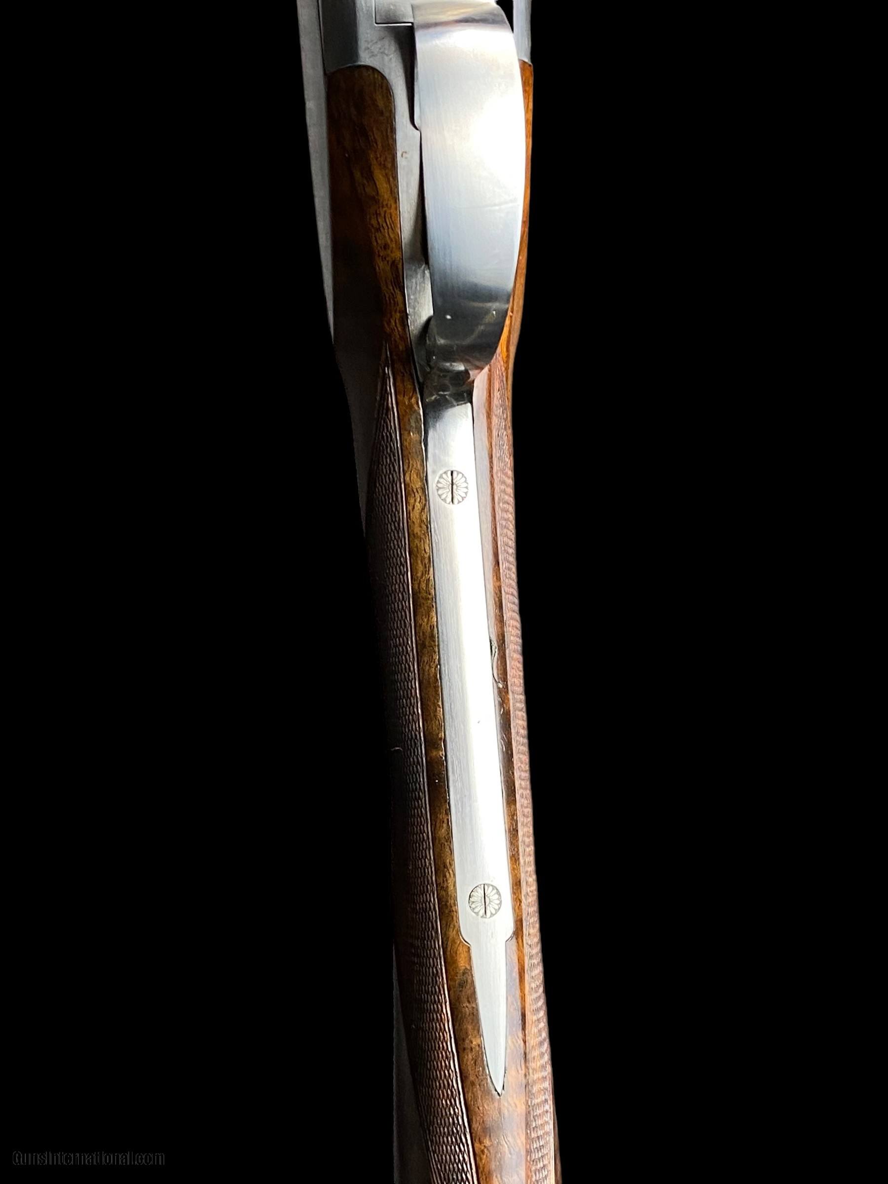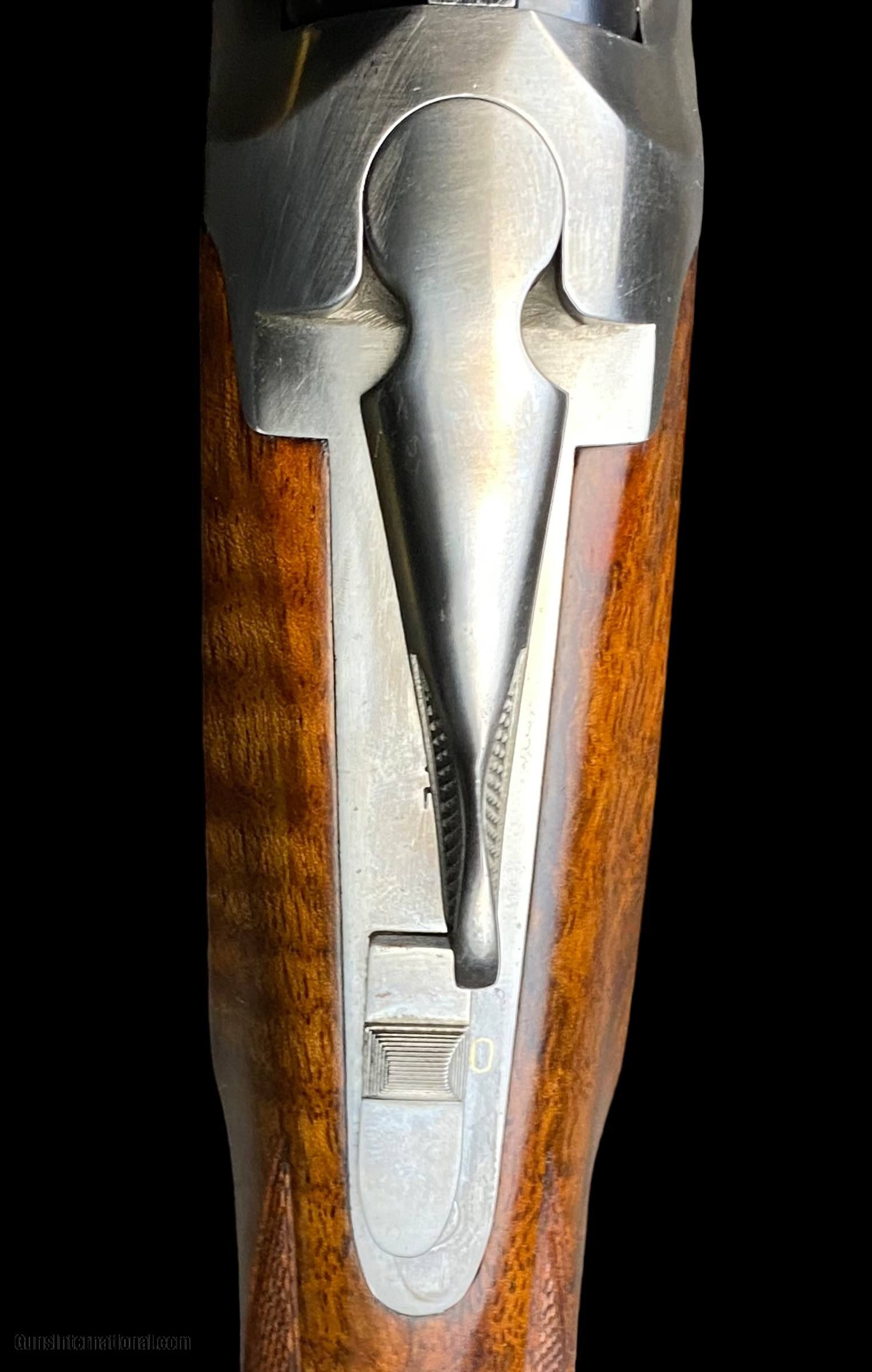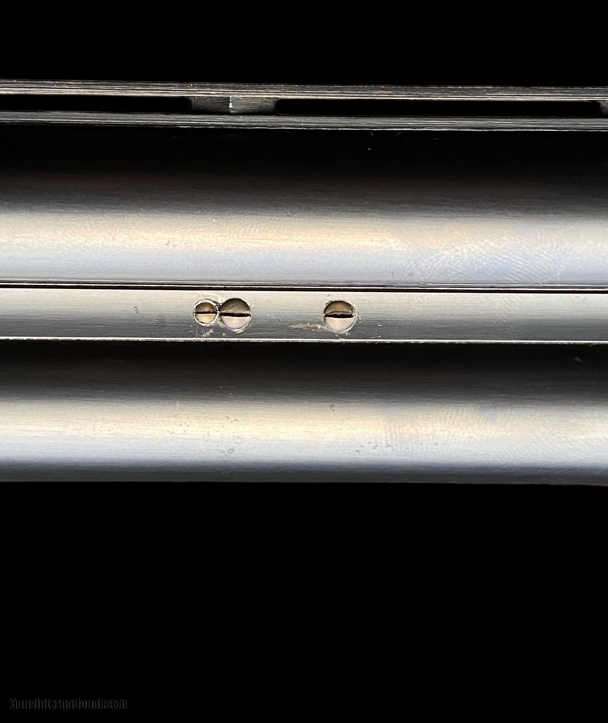 Description: SOLD --- TO A SATISFIED CLIENT -- PLEASE SEE OUR OTHER FINE FIREARMS LISTINGS -- FN SUPERPOSED SUPERLIGHT B125 GAME GUN - Belgium SN. 863PZ1181x. 12ga. 27-1/2" bbl - 2-3/4" chamber, with slightly raised matted ventilated top rib with orange front sight. Choke: M/F Min. Wall Thickness: .038(T) .035(B). Bore Diameter: .724(T) .724(B). Bore restriction: .020(1) .038(B) Superlight Schnabel tipped forearm is checkered in point pattern with latch release. Coin finished receiver is nicely engraved with quail on left, pheasants on right, pointer on bottom all engraved by J.P. Bailey and stamped on back of left side. Long tang trigger guard. Single Selective Trigger, Auto ejectors, Non-auto safety. Nice fiddleback figured walnut buttstock is checkered in two point pattern, has gold oval on toe line, and terminates with a thin red pad. DAC: 1-1/2". DAH" 2-3/8". LOP: 14" WEIGHT: 6lbs. 10oz. CONDITION: Excellent as lightly field used. Bbls with about 95% original blue, sling mounts with later plugs. Forend and buttstock are excellent as professionally restored, near invisible sling holes on toe line are filled. Frame is excellent with minor staining. Bores are bright and shiny. Mechanics are crisp. Nice gun! Gentlemen, this is a very nice superlight field gun by FN Browning. Made for the European market and not commonly seen here in USA. Nice dimensions and balance. LOP easily extended with Silvers style pad. Call now! FFL required Flat $50 S/H/I Card fee applies SOLD Shotgun Gauge: 12 Gauge Manufacturer: FN BROWNING Model: B125 Chambers: 2.75 Ejectors: YES Condition: EXC Metal Condition: EXC Wood Condition: EXC Bore Condition: EXC Triggers: SINGLE SELECTIVE |