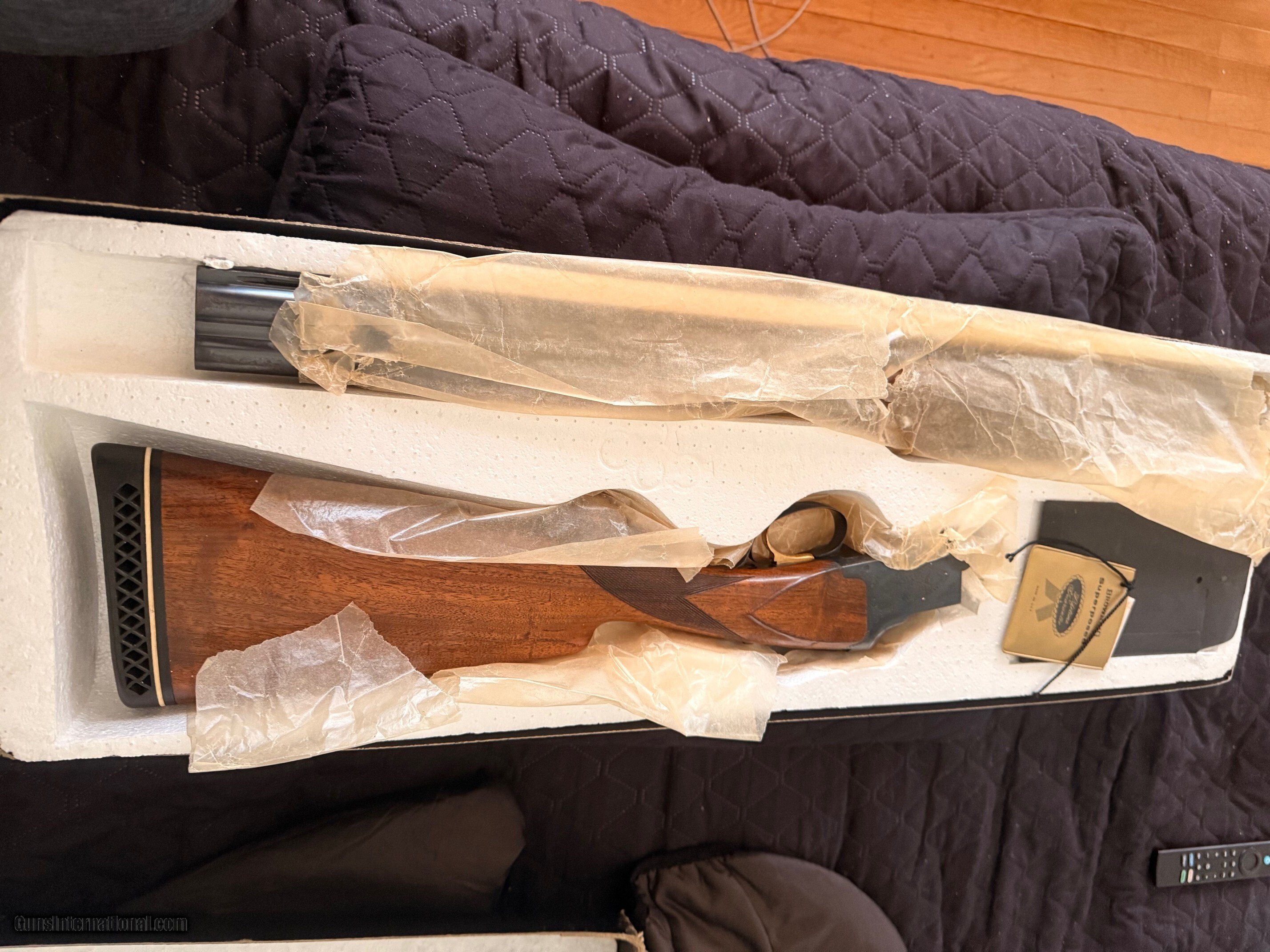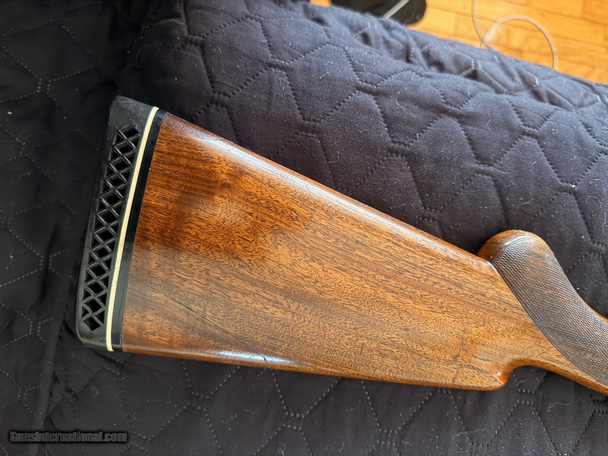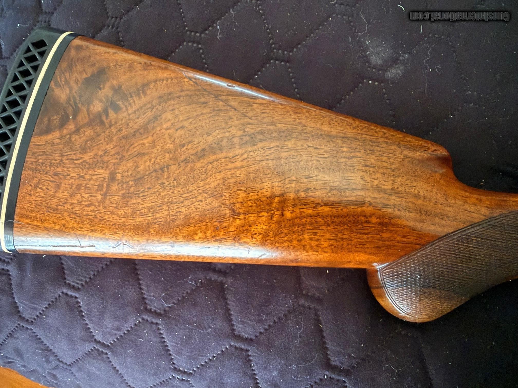 The side-by-side shotgun was still very popular at the time, but the over/under had never developed a large following in the U.S. Browning liked the over/under’s single sighting plane and was convinced American shooters would too, as the country was often called “a nation of riflemen.” The over/under was popular in Europe, where guns were custom-made and expensive. Browning wasn’t just a great designer, but also a smart businessman. For this shotgun to be a success, he knew it needed the best workmanship possible for high-quantity production. His goal was a price under $150, much less than handmade European guns, but still a lot at a time when prices for many classic American side-by-sides were less than $50. In the early ‘20s, Browning started on his Superposed shotgun. He was familiar with the various European designs and wanted to make improvements. It was a slow process, and it was 1926 before his design was finished, a patent was applied for, and granted. Browning had a long relationship with FN in Belgium. It had manufactured several of his designs and had agreed to produce the Superposed. In late 1926, he traveled to Liege with his son Val to work on the final details of his design, but he never lived to see it produced. On November 26, 1926, Browning died of an apparent heart attack in his office at FN. There was still work to do before production of the Superposed could start, and Val Browning overtook the project. There were problems with several key features that needed to be addressed, including the trigger system, the selective automatic ejectors, and the fit and finish quality. Another was the unique fore-end system by which the barrels could be removed from the action without detaching the fore-end. These issues were resolved, and in 1931, the gun went into production. It was offered in four grades: standard or Grade 1, Pigeon, Diana, and Midas, each with higher levels of engraving and grades of wood. The Grade 1 base price was $107.50, with the higher grades ranging from $175 to $374. The Grade 1 model had double triggers. For $137.50, the buyer had a choice of a single trigger (selective or non-selective) or a new design by Val Browning called the Twin-Single trigger. This system had two triggers, each of which was essentially a non-selective trigger firing one barrel with the first pull and the other with the second. The front trigger fired the lower barrel first, and the rear trigger fired the top barrel first. The Twin-Single was clever and offered shooters a quick choice of chokes, depending on the distance and direction of a target. However, it was not a popular option with many shooters and was phased out when a new single-selective trigger was developed, again by Val Browning. Another variation came along in 1936 with the Lightning Superposed. It weighed around 6.75 pounds, compared to 7.5 pounds for the 12-gauge. The Superposed’s timing was not great. The Depression was well underway in 1931, and to remain competitive, in 1934, the base price was reduced to $99.50, and the next year to $69.75. The pre-war price stabilized at $79.80 until Germany invaded Belgium and took over the FN factory. After World War II, FN returned to the manufacture of Browning sporting arms, first with the Auto-5 in 1946 and then the Superposed in 1948. The 12-gauge over/under was the same as the pre-war version, but available only in Grade 1. It was priced much higher, at $241. Then, in 1949, the 20-gauge was introduced with a slimmer frame and a lighter weight of about 6.5 pounds. The ‘50s saw an expansion of Superposed variations, including magnum, trap, and skeet models. Some collectors consider the 1950s to be the period of the best quality for the Superposed. In 1959, fans of the smaller gauges were thrilled when the .410 bore and 28-gauge models were introduced. For some reason, other than one prototype, no Superposed was ever chambered for the 16 gauge. Prices for Browning firearms saw big increases in the 60s, mostly due to labor problems in Belgium. By 1969, the Superposed Grade 1’s base price started at $435. To hold prices down, Browning made changes, mostly cosmetic. These included things like reducing the length of the trigger guard tang and the shape of the grip in 1966. Collector interest today is affected by these changes, with slightly higher values given for the “long tang, round knob” models. In the '70s, inflation was a problem in much of the world, including Belgium. The Grade I price reached $1,100 by 1976. Browning had unveiled the made-in-Japan Citori in 1973, a well-made production gun priced at less than $400. The writing was on the wall. Browning executives realized that for the Superposed to continue at the same level of quality, it would need to become a presentation-grade, limited production item. In 1977, four grades were introduced, Presentation Models P1 to P4, with increasing levels of engraving, gold inlays, and wood quality. Prices ran from $3,000 to $6,000. The P-series Superposed remained in production until 1985. From the mid-80s until today, the Browning Custom Shop in Belgium has continued to build numerous variations of John Browning’s favorite creation. This is a used item. While we do not test-fire our used firearms, we perform an inspection and function check to ensure that they are fully functional to the best of our ability. Layaway: 1/3 down, 90 days Shipping: $75, insurance extra upon request Payment: Personal Check, Money Order, Cert. Check, or Zelle randywine2000yahoo (703) 858-2881 Returns without damage or alteration within 3 days of delivery, minus a 20% restocking fee Curio/Relic: Yes Shotgun Gauge: 12 Gauge Manufacturer: Browning Model: Superposed Grade I Serial Number: 53400 SC Barrel Length: 26.5 Bore Info: Mirror Chambers: 2 3/4 Condition: Excellent Metal Condition: VG+ Wood Condition: Excellent Bore Condition: Excellent Barrels: O/U Barrel Type: O/U Action: Break Triggers: Single Selective Gold Plated Stoc