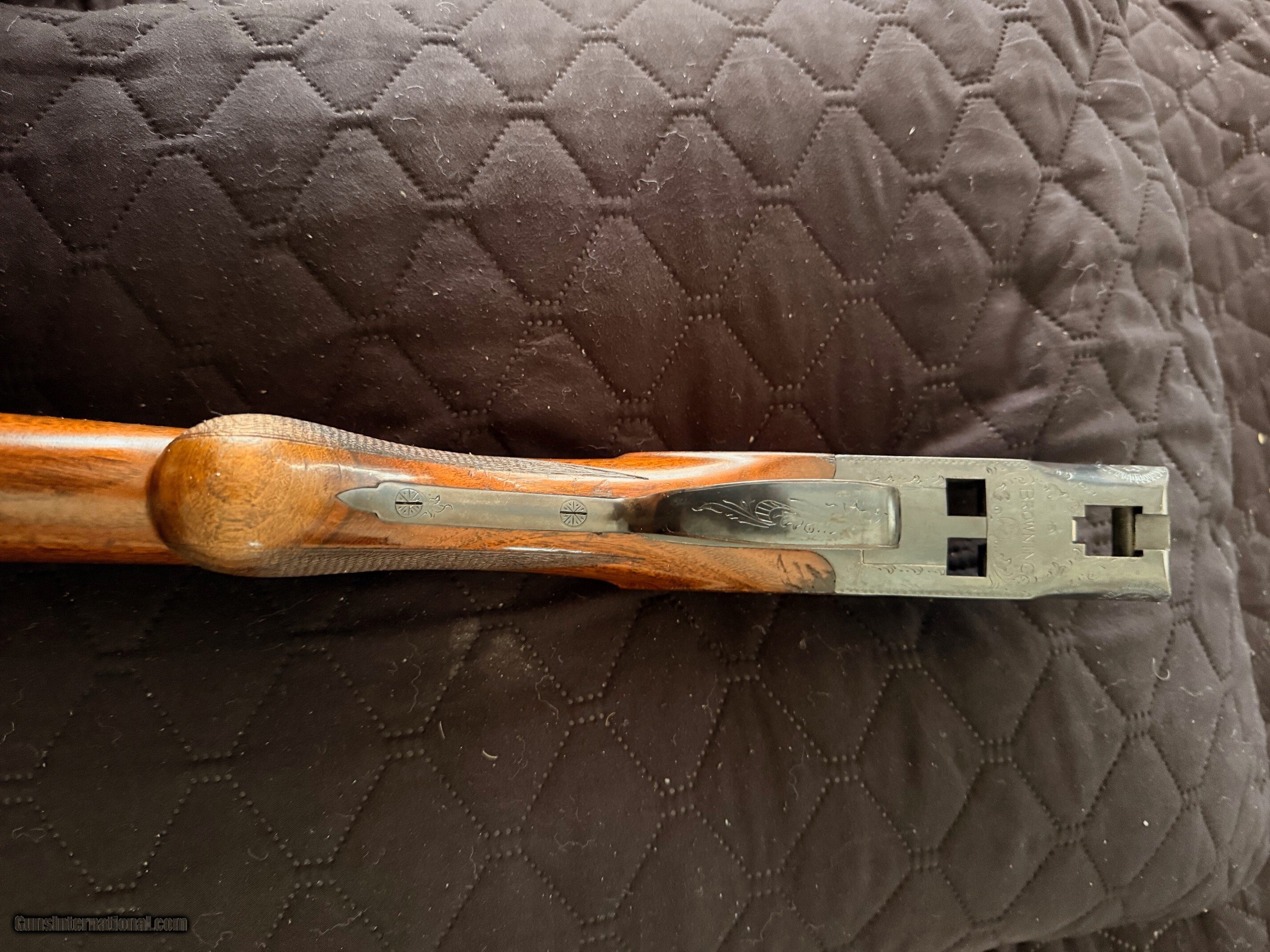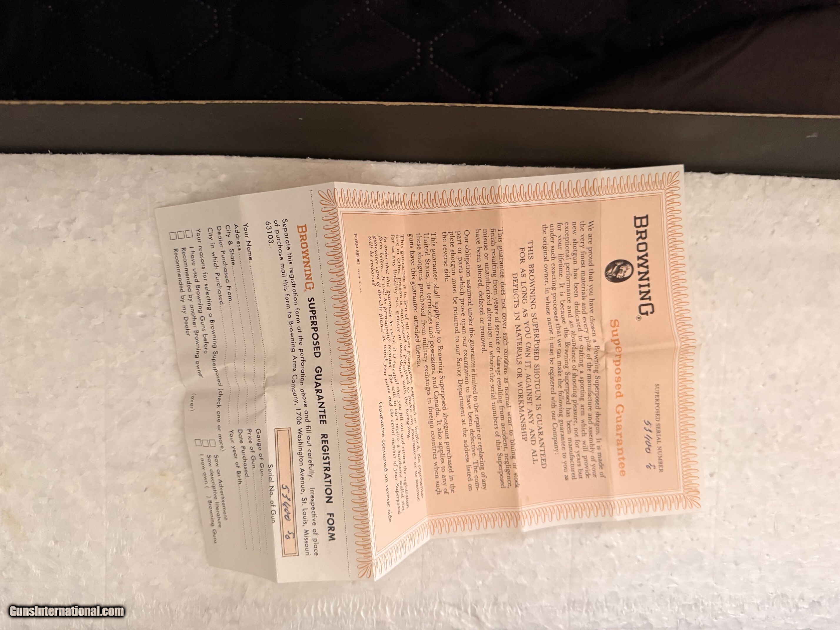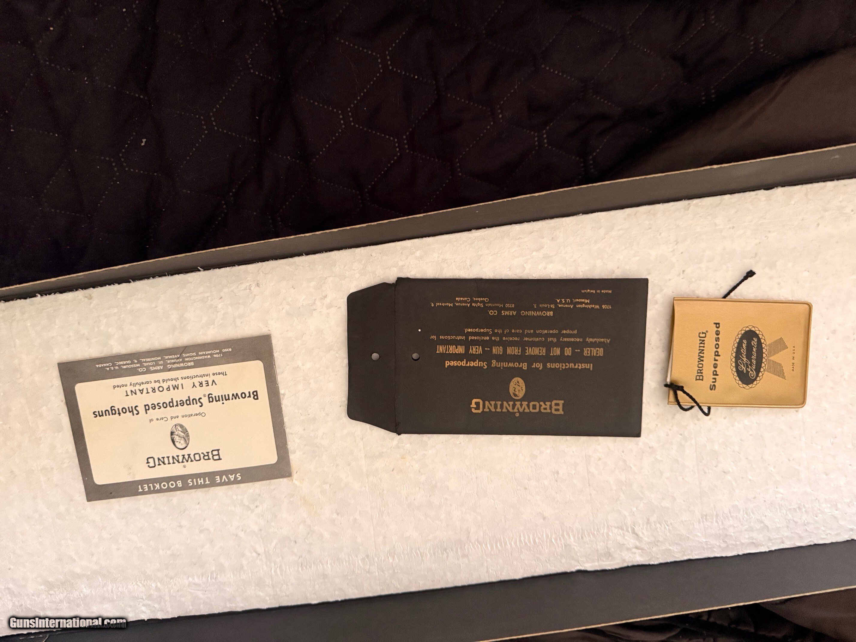 Description: 1956 Browning Superposed Grade I O/U 12 Gauge LT w/Original Box 26.5" Vent Barrels M over IC Description: 1956, Belgium made Superposed Grade I Field with a long tang, and modified over IC fixed choking. Has a 26.5" vented barrel for a lightning swing on fast flying birds. The furniture has a couple of handling marks, but is still in excellent condition. The metal shows some slight thinning on the edges. The bore is bright and shiny. It comes with its original box, paperwork, and manual. History of the Browning Superposed Over/Under John M. Browning’s last design before his passing, the Browning Superposed, is a fine over/under shotgun that holds a good deal of collector value. What makes the Browning Superposed a collectible item?