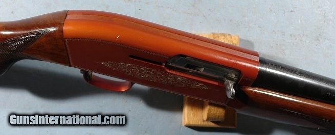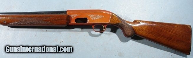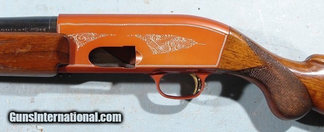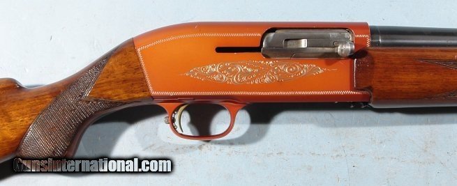 Description: BELGIUM BROWNING LIGHTWEIGHT DOUBLE 12 GAUGE SEMI-AUTO SHOTGUN CA. 1955. All original with 29 ½” full choked matted barrel. Scarce Autumn Brown color frame with gold scroll engraving. Walnut checkered stock and forend. Original Browning horn butt plate. Excellent condition with 100% Autumn Brown frame and 98% barrel blue. Wood with nearly all the original finish. Butt plate with minor chips. Working order and excellent bore. Has seen only light use. SOLD Curio/Relic: Yes |