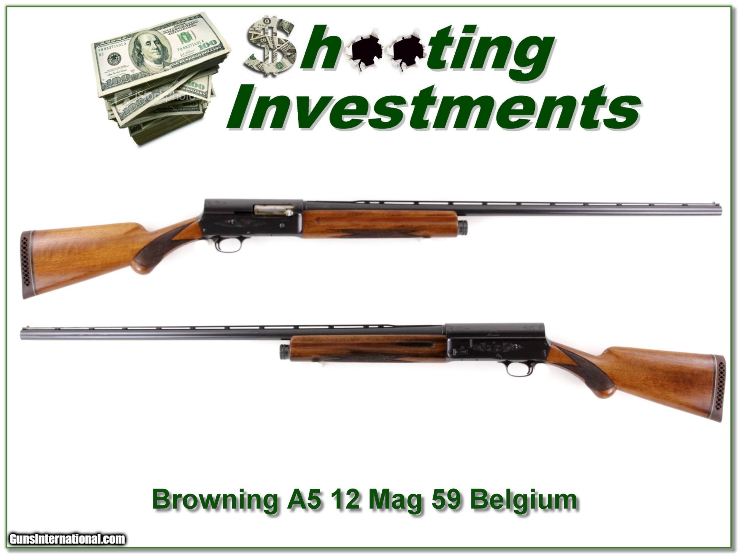 Description: This a top condition Browning A5 Magnum 12 Gauge. It was made in Belgium in 1959 and these 50’s are very hard to find. The original rust blue on the receiver is about new. The wood has only a few insignificant handing marks. The barrel is a 32in rare Improved Modified barrel with added Simmons rib. Had it been original I would be selling this gun for about $1400. Still it is a top condition A5 and will make a fine addition to your collection. Shipping with insurance is $39. Please email me with any questions or larger pictures. (Consign your quality firearms with Shooting Investments for only 12%! Let me know if you have any you would like to sell!) 19-0250 Payment: Payment is by Money Order, Cashiers Check or Personal Check. I can now also accept MasterCard and Visa with a 3% convenience fee. PayPal can be used for some items but never firearms. Please let us know if you would like to pay via PayPal. Shipping: The shipping charge will be listed in each description. It is $39 for most long guns and $29 for most handguns. Some heavy guns or those insured for over $2000 will be higher. Shipments to Alaska and Hawaii are higher because air shipment is required. Most firearms are shipped on Tuesday and Thursday and usually in 5 days of receipt of payment. We package all shipments carefully and insure them. For long guns you can purchase a new Plano case for $19. They now cost us $22 when buying 100 at a time. Optics are shipped Priority Mail and most other non-firearm shipments are shipped First Class. Returns: Our return policy is simple. If for any reason you are not pleased with your purchase, you may return your item for a full refund of purchase price. Ammunition cannot be returned. It is important to us that you are happy. Guns cannot be fired or dissembled before returning them and they must be returned in the same condition as received. Notification of a return must occur with-in 3 days of receipt at your dealer. Shipping, convenience and dealer fees are not refundable and are the responsibility of the buyer. Lay-a-way: If needed, we offer a 60 day lay-a-way option on most firearms. It is 1/3 now, 1/3 in 30 days and 1/3 in 60 days. Lay-a-way firearm sales are final and if not completed the first payment cannot be returned. Consigning your firearms with Shooting Investments: We will help you get top dollar for your firearms. While most local guns shops charge 20% or more, our fee is only 12% with a minimum of $75. At your local gun shop it might take months to sell. Selling on-line provides instant access to thousands of interested buyers. You won’t find any other on-line dealer willing to sell your firearms for only 12% or listing every gun on 3 separate s. Selling through an House typically costs the seller 15% and the buyer an addition 15% (so 30%) and you have to wait several months to sell and longer to receive funds. If properly priced, we will sell your firearms in a few weeks. Send us an email or give us a call and we’ll explain how easy it is for you to get top dollar. Trading: Trading for use is really just buying your gun to re-sell. If you have a gun you want to trade, please email a picture and we will let you know what we can give or it. You will always get more if we sell it for you on consignment. Help for California Buyers: We are happy to ship to California. It is the buyer’s responsibility to make sure any item you buy is legal in your state. We are also happy to help with your purchase of a firearm from someone other than us. If you see a gun you would like to buy but the seller can’t or won’t ship to California they can ship to use and we’ll then ship it to your California dealer. The cost for this service is only $30 + shipping. Let us know if we can help! SOLD |