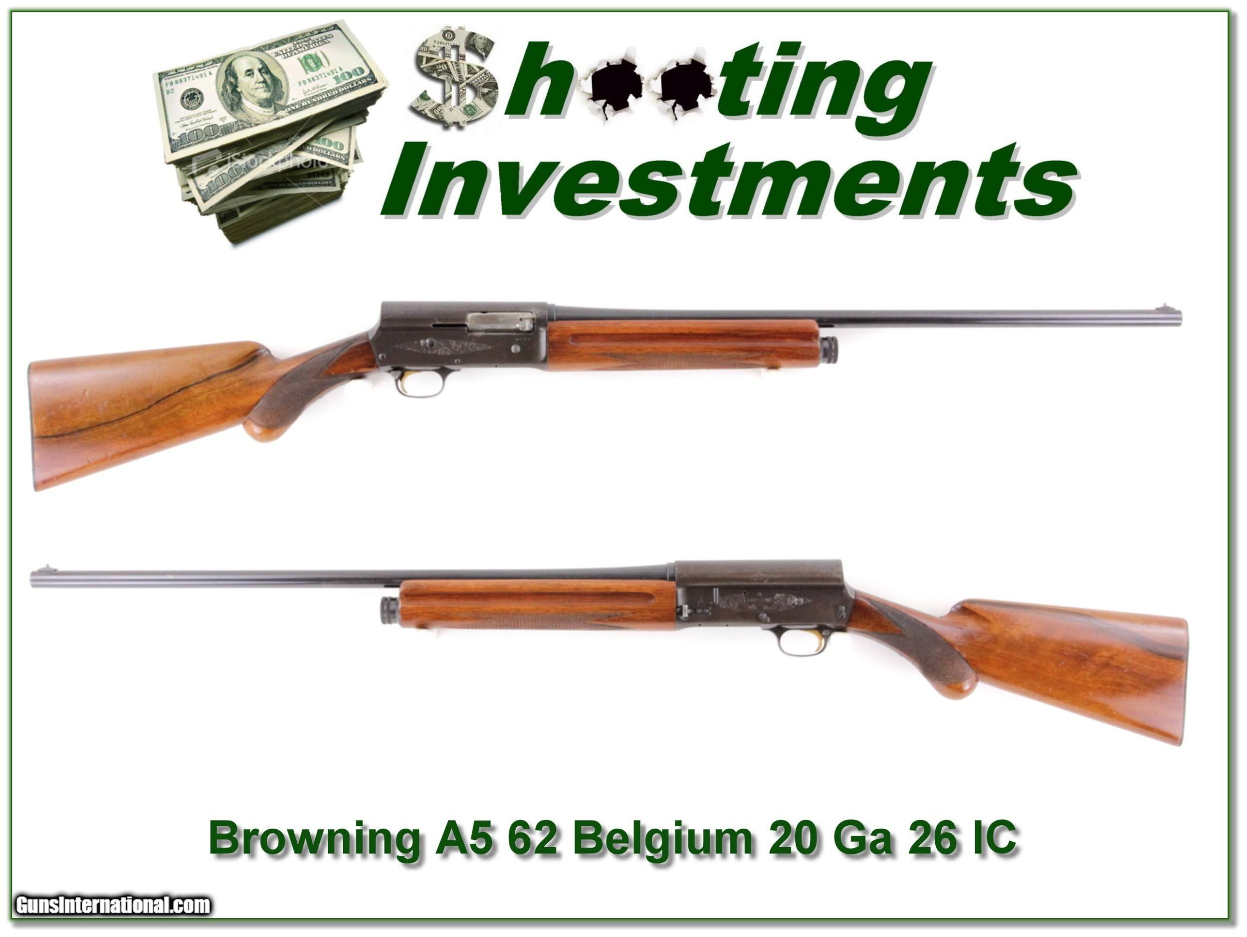 Description: This is a Browning A5 20 Gauge made in Belgium in 1962. It has the most desirable 26in barrel with IC choke. It is solid with no crack or rust on the metal. The receiver blue has some edge carry wear. The barrel blue is excellent. The wood has scattered marks on the wood from use. It will make a classic field gun. Shipping with insurance is $39. Please email me with any questions or larger pictures. (Consign your quality firearms with Shooting Investments for only 12%! Let me know if you have any you would like to sell!) 19-0382 Payment: Payment is by Money Order, Cashiers Check or Personal Check. I can now also accept Credit Cards (MasterCard, Visa, Discover & American Express) with a 3% convenience fee. PayPal can be used for some items but never for firearms. Shipping: The shipping charge will be listed in each description. It is $39 for most firearms. Some heavy guns or those insured for over $2000 will be higher. Shipments to Alaska and Hawaii are higher because air shipment is required. Most firearms are shipped on Tuesday and Thursday and usually in 5 days of receipt of payment. We package all shipments carefully and insure them. Optics are shipped Priority Mail and most other non-firearm shipments are shipped First Class. Returns: Our return policy is simple. If for any reason you are not pleased with your purchase, you may return your item for a full refund of purchase price. Ammunition cannot be returned. It is important to us that you are happy. Guns cannot be fired or dissembled before returning them and they must be returned in the same condition as received. Notification of a return must occur with-in 3 days of receipt at your dealer. Shipping, convenience and dealer fees are not refundable and are the responsibility of the buyer. Lay-a-way: If needed, we offer a 60 day lay-a-way option on most firearms. It is 1/3 now, 1/3 in 30 days and 1/3 in 60 days. Lay-a-way firearm sales are final and if not completed the first payment cannot be returned. Consigning your firearms with Shooting Investments: We will help you get top dollar for your firearms. While most local guns shops charge 20% or more, our fee is only 12% with a minimum of $75. At your local gun shop it might take months to sell. Selling on-line provides instant access to thousands of interested buyers. You won’t find any other on-line dealer willing to sell your firearms for only 12% or listing every gun on 3 separate s. Selling through an House typically costs the seller 15% and the buyer an addition 15% (so 30%) and you have to wait several months to sell and longer to receive funds. If properly priced, we will sell your firearms in a few weeks. Send us an email or give us a call and we’ll explain how easy it is for you to get top dollar. Trading: Trading for use is really just buying your gun to re-sell. If you have a gun you want to trade, please email a picture and we will let you know what we can give or it. You will always get more if we sell it for you on consignment. Help for California Buyers: We are happy to ship to California. It is the buyer’s responsibility to make sure any item you buy is legal in your state. We are also happy to help with your purchase of a firearm from someone other than us. If you see a gun you would like to buy but the seller can’t or won’t ship to California they can ship to use and we’ll then ship it to your California dealer. The cost for this service is only $30 + shipping. Let us know if we can help! SOLD |