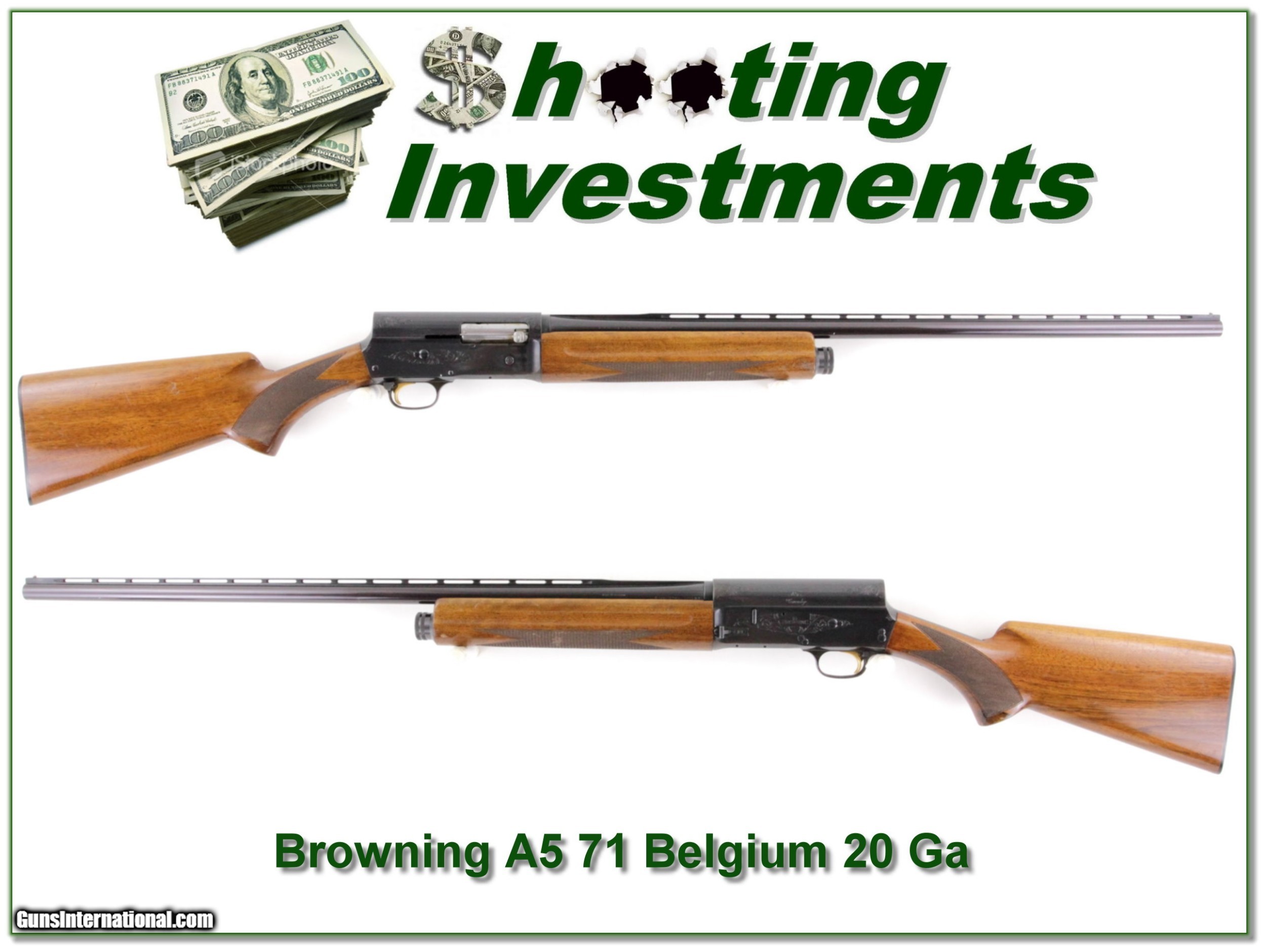 Description: This is a 1971 Belgium made browning A5 20 Gauge. It has a 28in Vent Rib modified barrel. The has just light thinning on the receiver edges. The wood has scattered marks from use but is solid. This will make a classic field gun. Shipping with insurance is $39. Please email me with any questions or larger pictures. (Consign your quality firearms with Shooting Investments for only 12%! Let me know if you have any you would like to sell!) 18-1258 Payment: Payment is by Money Order, Cashiers Check or Personal Check. I can now also accept Credit Cards (MasterCard, Visa, Discover & American Express) with a 3% convenience fee. PayPal can be used for some items but never for firearms. Shipping: The shipping charge will be listed in each description. It is $39 for most firearms. Some heavy guns or those insured for over $2000 will be higher. Shipments to Alaska and Hawaii are higher because air shipment is required. Most firearms are shipped on Tuesday and Thursday and usually in 5 days of receipt of payment. We package all shipments carefully and insure them. Optics are shipped Priority Mail and most other non-firearm shipments are shipped First Class. Returns: Our return policy is simple. If for any reason you are not pleased with your purchase, you may return your item for a full refund of purchase price. Ammunition cannot be returned. It is important to us that you are happy. Guns cannot be fired or dissembled before returning them and they must be returned in the same condition as received. Notification of a return must occur with-in 3 days of receipt at your dealer. Shipping, convenience and dealer fees are not refundable and are the responsibility of the buyer. Lay-a-way: If needed, we offer a 60 day lay-a-way option on most firearms. It is 1/3 now, 1/3 in 30 days and 1/3 in 60 days. Lay-a-way firearm sales are final and if not completed the first payment cannot be returned. Consigning your firearms with Shooting Investments: We will help you get top dollar for your firearms. While most local guns shops charge 20% or more, our fee is only 12% with a minimum of $75. At your local gun shop it might take months to sell. Selling on-line provides instant access to thousands of interested buyers. You won’t find any other on-line dealer willing to sell your firearms for only 12% or listing every gun on 3 separate s. Selling through an House typically costs the seller 15% and the buyer an addition 15% (so 30%) and you have to wait several months to sell and longer to receive funds. If properly priced, we will sell your firearms in a few weeks. Send us an email or give us a call and we’ll explain how easy it is for you to get top dollar. Trading: Trading for use is really just buying your gun to re-sell. If you have a gun you want to trade, please email a picture and we will let you know what we can give or it. You will always get more if we sell it for you on consignment. Help for California Buyers: We are happy to ship to California. It is the buyer’s responsibility to make sure any item you buy is legal in your state. We are also happy to help with your purchase of a firearm from someone other than us. If you see a gun you would like to buy but the seller can’t or won’t ship to California they can ship to use and we’ll then ship it to your California dealer. The cost for this service is only $30 + shipping. Let us know if we can help! SOLD |